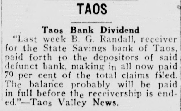TAOS Taos Bank Dividend "Last week B. G. Randall, receiver for the State Savings bank of Taos, paid forth to the depositors of said defunct bank. making in all now paid 79 per cent of the total claims filed. The balance probably will be paid in full before the receivership is ended."-Taos Valley News.