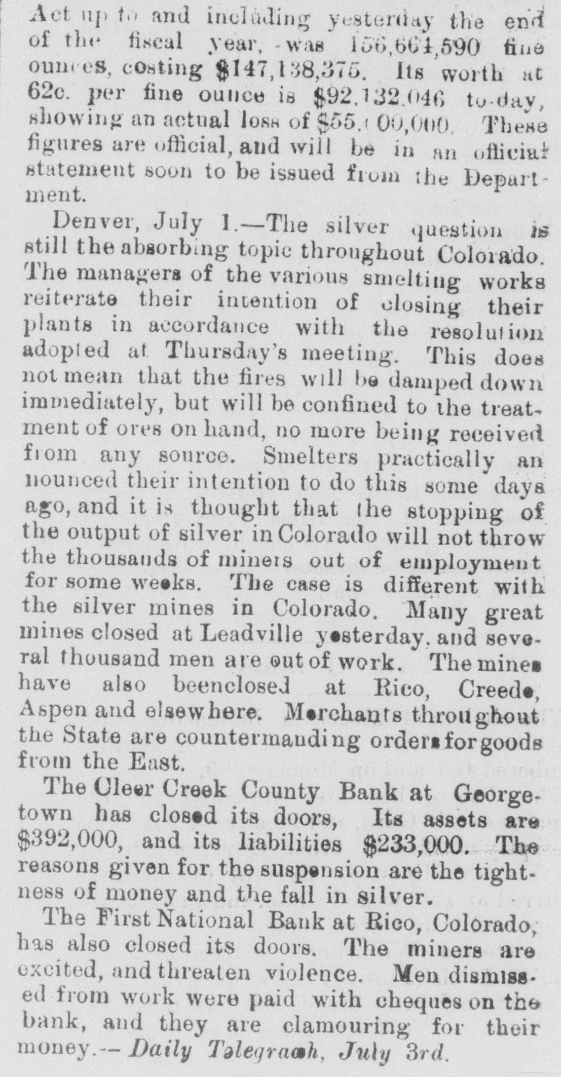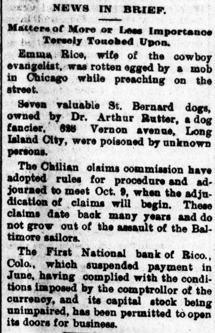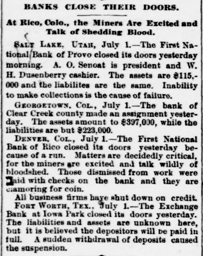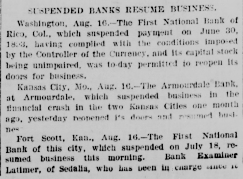 BANKS HAVE RESUMED. Those That Were Temporarily Embarrassed Now All Right. WASHINGTON, D. C. Sept. 1.Controller Eckels has prepared the following statement of banks which temporarily suspended during the late stringency and have since resumed business: Black Hills National Bank, Rapid City, S. D., capital stock, $125,000; Gate City National Bank, Atlanta, Ga., $250,000; Capital National Bank, Indianapolis, Ind., $300,000; Washington National Bank, Spokane Falls, Wash., $250,000; First National Bank, Palouse city, Wash., $75,000: Southern California National Bank, Los Angeles, Cal: $200,000; First National Bank, Los Angeles, Cal., $200,000; First National Bank, San Diego, Cal., $300,000; First National Bank, Santa Ana, Cal., $150,000; First National Bank, Kendallville, Ind., $50,000; First National Bank, San Bernardino, Cal., $100,000; Second National Bank, Ashland, Ky., $50,000; First National Bank, Rico, Col., $50,000; National Bank of Commerce, Provo City, Utah, $50,000; First National Bank, Cisco, Texas, $50,000; American National Bank, Leadville, Col., $100,000; Central National Bank, Pueblo, Col., $50,000; Missouri National Bank, Kansas City, Mo., $250,000; First National Bank, Fort Scott, Kan., $300,000; Union National Bank, Denver, Col., $1,000,000; National Bank of Commerce, Den ver $500,000; Hutchinson National Bank, Hutchinson, Kan., $100,000; People's National Bank, Denver, Col.,$600,000; First National Bank, Anthony, Kan., $50,000; Greeley National Bank, Greeley, Col., $50,000; Farmer's National Bank, Henrietta, Tex., $50,000; State National Bank, Vernon, Tex., $100,000; Fourth National Bank, Louisville, Ky., $200,000; First National Bank, The Dalles, Ore., $50,000; Waupaca County National Bank, Waupaca, Wis., $50,000: Waxabachee National Bank, Waxabachee, Tex., $100,000; Citizen's National Bank, Attica, Ind., $50,000; First National Bank, San Marcos, Tex., $80,000; First National Bank, Lockhart, Tex., $50,000. Total capital stock of $6,030,000. Since January 1 last 154 national banks have suspended. Of this number one has gone into voluntary liquidation, 57 have been placed in the hands of receivers, 62 are in the hands of national bank examiners with excellent prospects of early resumption, in addition to the 34 above named which have already resumed business.