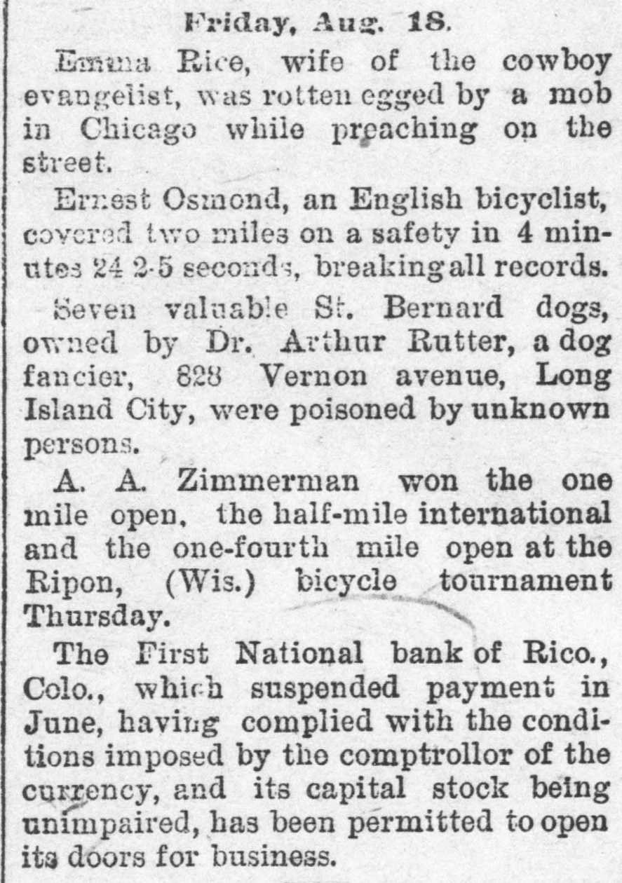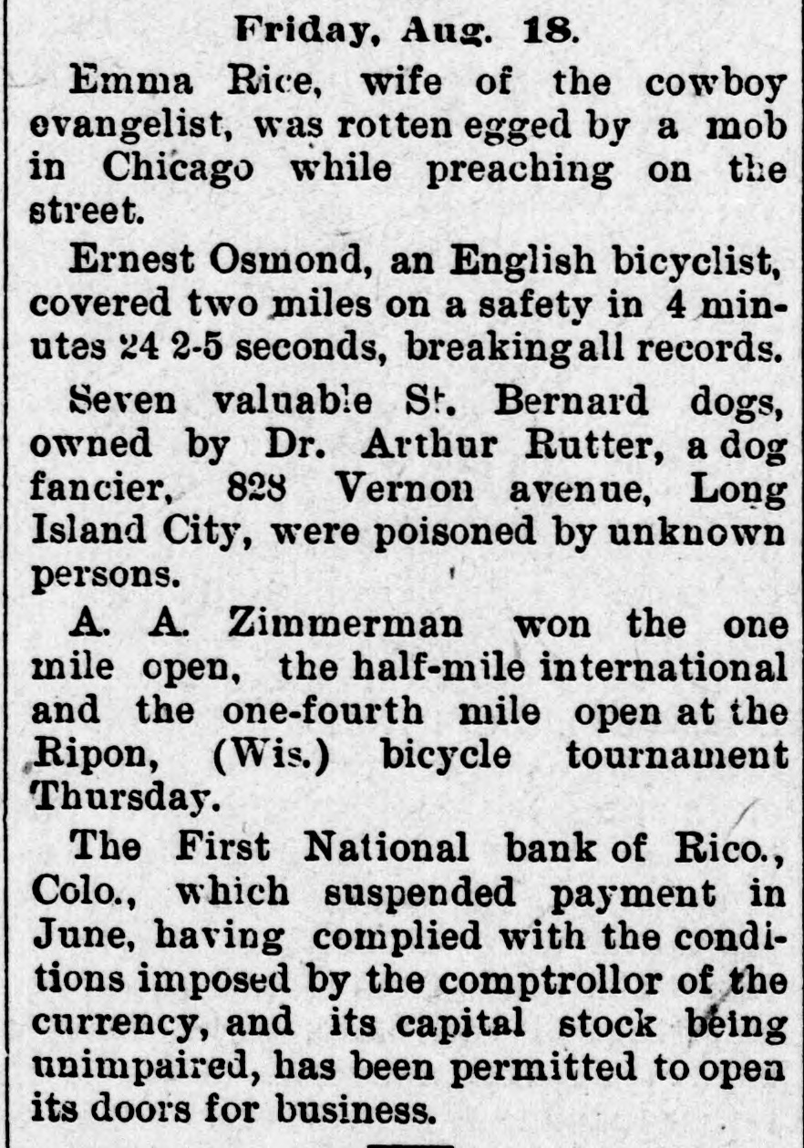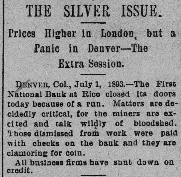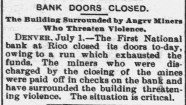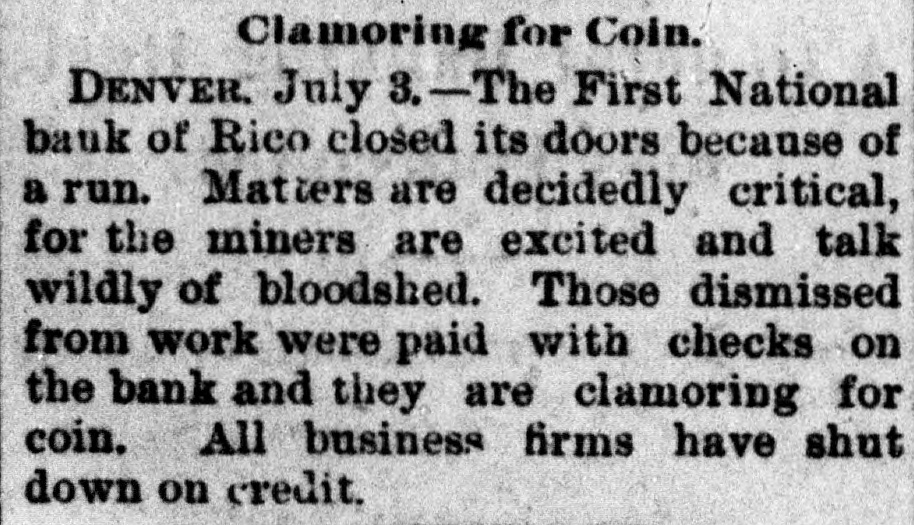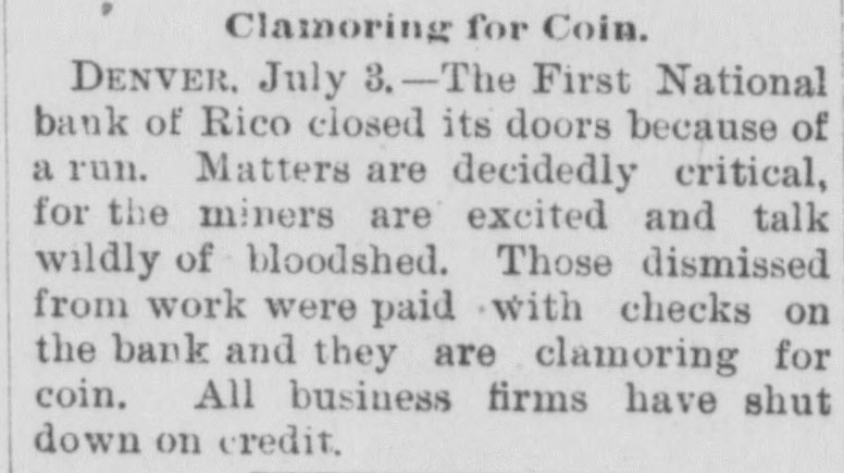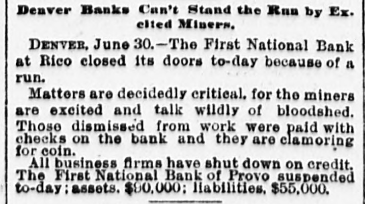 BANKS HAVE RESUMED. Those That Were Temporarily Embarrassed Now All Right. WASHINGTON, D. C. Sept. 1.Controller Eckels has prepared the following statement of banks which temporarily suspended during the late stringency and have since resumed business: Black Hills National Bank, Rapid City, S. D., capital stock, $125,000; Gate City National Bank, Atlanta, Ga., $250,000; Capital National Bank, Indianapolis, Ind., $300,000; Washington National Bank, Spokane Falls, Wash., $250,000; First National Bank, Palouse city, Wash., $75,000: Southern California National Bank, Los Angeles, Cal: $200,000; First National Bank, Los Angeles, Cal., $200,000; First National Bank, San Diego, Cal., $300,000; First National Bank, Santa Ana, Cal., $150,000; First National Bank, Kendallville, Ind., $50,000; First National Bank, San Bernardino, Cal., $100,000; Second National Bank, Ashland, Ky., $50,000; First National Bank, Rico, Col., $50,000; National Bank of Commerce, Provo City, Utah, $50,000; First National Bank, Cisco, Texas, $50,000; American National Bank, Leadville, Col., $100,000; Central National Bank, Pueblo, Col., $50,000; Missouri National Bank, Kansas City, Mo., $250,000; First National Bank, Fort Scott, Kan., $300,000; Union National Bank, Denver, Col., $1,000,000; National Bank of Commerce, Den ver $500,000; Hutchinson National Bank, Hutchinson, Kan., $100,000; People's National Bank, Denver, Col.,$600,000; First National Bank, Anthony, Kan., $50,000; Greeley National Bank, Greeley, Col., $50,000; Farmer's National Bank, Henrietta, Tex., $50,000; State National Bank, Vernon, Tex., $100,000; Fourth National Bank, Louisville, Ky., $200,000; First National Bank, The Dalles, Ore., $50,000; Waupaca County National Bank, Waupaca, Wis., $50,000: Waxabachee National Bank, Waxabachee, Tex., $100,000; Citizen's National Bank, Attica, Ind., $50,000; First National Bank, San Marcos, Tex., $80,000; First National Bank, Lockhart, Tex., $50,000. Total capital stock of $6,030,000. Since January 1 last 154 national banks have suspended. Of this number one has gone into voluntary liquidation, 57 have been placed in the hands of receivers, 62 are in the hands of national bank examiners with excellent prospects of early resumption, in addition to the 34 above named which have already resumed business.
