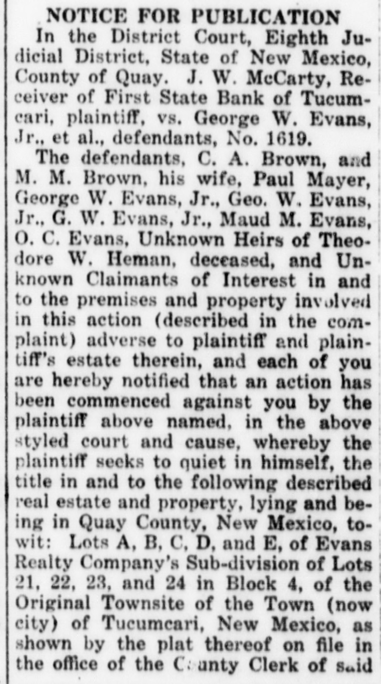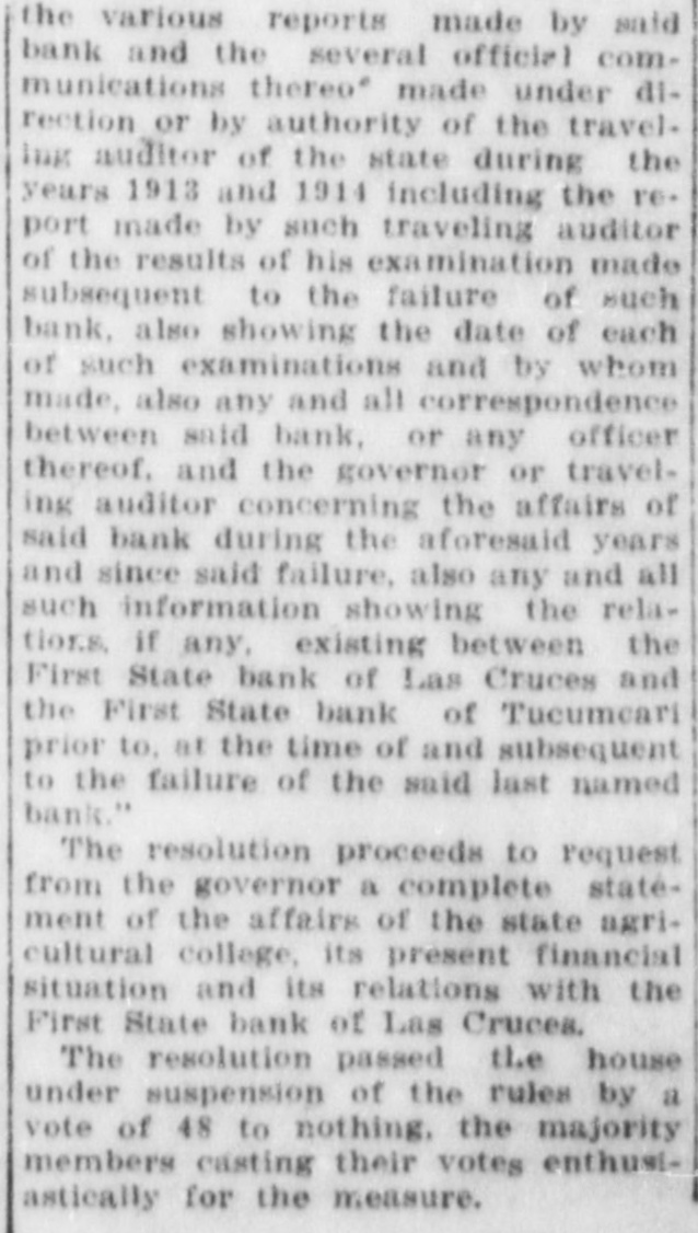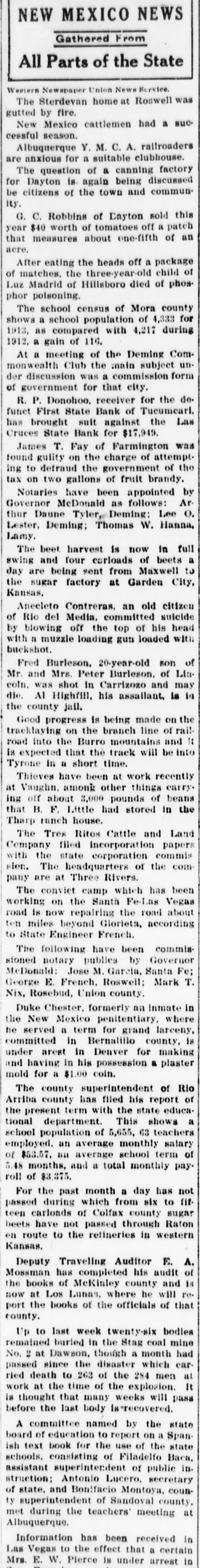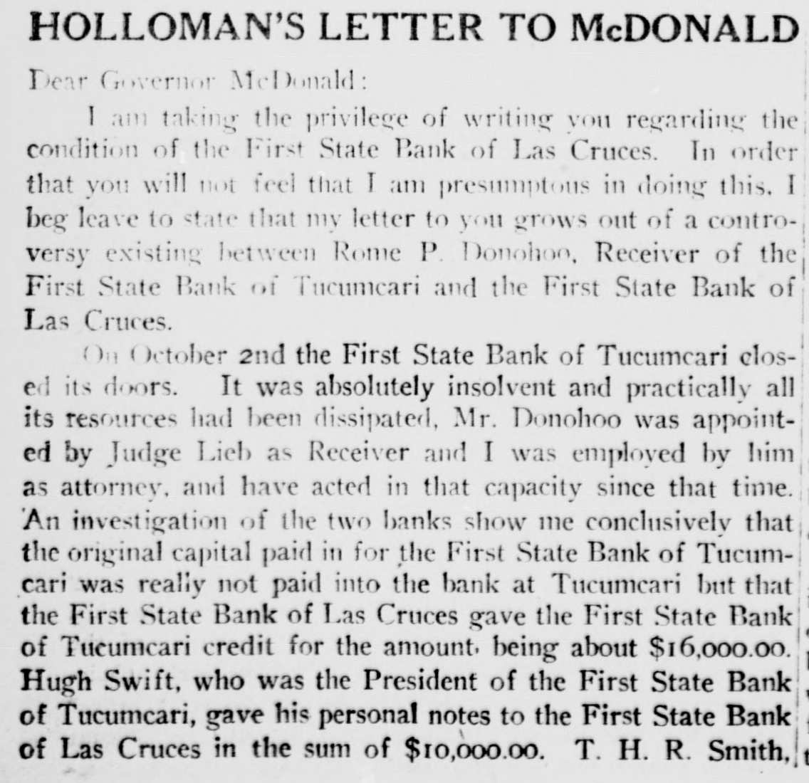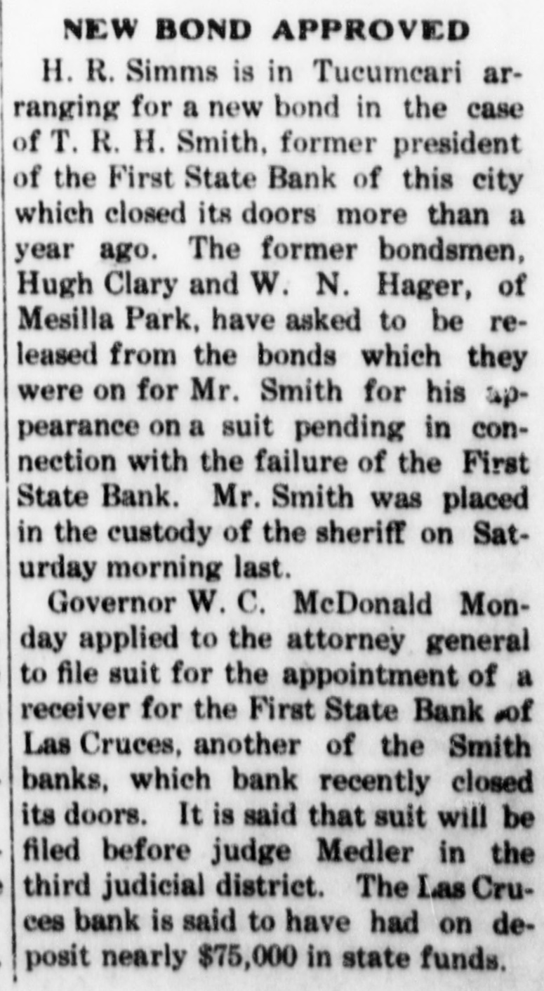 SMITH FAMILY NOTES FAILED LAS CRUCES BANK WERE HEAVY Evidence Shows Overdrafts by Contractors Who Helped Build Smith Home; Smith Property, Surrendered to Bank, Encumbered For as Much as It is Worth, According to the Testimony of Receiver. ness said, was $4206.85. An account carLAMOGORDO, N. M., April 21.ried in the individual ledger as "Hugh Turner R. H. Smith's financial Gilbert, special." showed an overdraft A transactions with the First State of $4632.16. Witness said Smith explained that this overdraft in reality bank of Las Cruces, formed the chief was his own. Gilbert was the contracfeature of the session of court yestertor who built Smith's home in Las day afternoon. Smith, former presiCruces, and this overdraft grew out of dent of the First State bank of Las his work in connection with the buildCruces, is on trial here under an ining of Smith's home. dictment which charges him with the The account of the Las Cruces Tinembezzlement of $4150 on July 15, 1914. ning and Plumbing company showed an Last night marked the close of the overdraft of $1157.47, and this, Smith fourth day of the trial, including three said, was his own overdraft, so the witnight sessions. When the session closed ness testified. This company had the at 10:30 last night, the state still was contract for the plumbing in Smith's engaged in introducing testimony, but home. L B. Smith, a brother of the had almost concluded its case. defendant, had an overdraft for $4539.28. The testimony with reference to When the bank closed its doors, witness Smith's financial transactions with the said the total of its overdrafts was bank was given by L. B. Wooters, for$30,178.96. Its capital stock was $30,mer assistant bank examiner for the 000. state of New Mexico, who was recalled. Smith's Notes Large. Wooters, as assistant bank examiner, Witness said that when the bank took charge of the bank, after its failfailed, Smith's notes in the bank agure. In his previous testimony, he had gregated $30,131.19. The notes of L. said that he took charge of the defunct B. Smith, brother of the defendant, bank on Dec. 9, but after having reamounted to $7750. There was a note freshed his memory by reference to his of $3750, signed by W. A. Thompson, report, testified that it was on the 10th which Smith said the bank had disthat he took charge. He made an excounted for L. B. Smith, according to amination of the affairs and condition the witness. of the bank after he arrived and made C. H. Hardin Smith, another brother a formal report on the same. When of the defendant, had a note for $5000. this report was offered in evidence by The total of Smith's notes and overthe state, the defence filed a vigorous drafts was $40,127.67. which included objection. The court overruled the obthe overdrafts in the Hugh Gilbert spèjection and admitted the report. cial account and the Las Cruces TinWhere Some Money Went. ning and Plumbing company account. This report showed, the witness said, The total of the obligations of Smith that the capital stock and surplus had and the members of his family was been impaired 54 percent. In dollars $61,166.95. and cents, he estimated the loss to be Smith Turns Over Home. $162,377.30. Of this amount, the loss Witness said he arrived at his estion loans was estimated at $114,392.59, mate of the value of the bank's assets on overdrafts $22,532.98, on furniture through conferences with the directors and fixtures $4000, on profit and loss of the bank, with others and through account $1365.66 on the First State bank information from other sources. He of Tucumeari (this bank failed) $10.fixed the value of the Smith residence 022.86, on the Toyah Valley bank of at $10,000, and said he was informed Balmorrhea (this bank also failed) $10,the residence had been turned over to 000, cash short $63.19, error in footings the bank by Smith. $.02. Plenty of Smith Overdrafts. He said he believed Gilbert was solSmith's overdraft in the bank, witvent, but that he did not know about the Las Cruces Tinning and Plumbing
