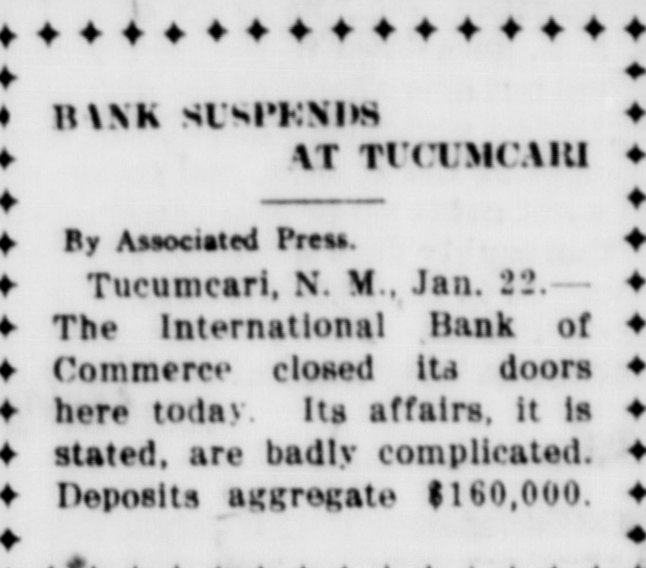 BANK SUSPENDS AT TUCUMCARI By Associated Press. Tucumcari, N. M., Jan. 22. The International Bank of Commerce closed its doors here today. Its affairs, it is stated, are badly complicated. Deposits aggregate $160,000.
