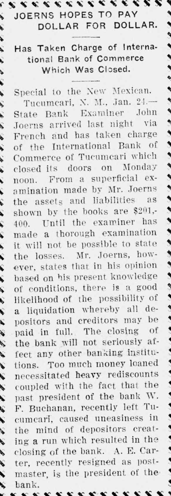 JOERNS HOPES TO PAY DOLLAR FOR DOLLAR. Has Taken Charge of International Bank of Commerce Which Was Closed. --Special to the New Mexican. Tucumcari, N. M., Jan. 24.State Bank Examiner John Joerns arrived last night via French and has taken charge of the International Bank of Commerce of Tucumcari which closed its doors on Monday noon. From a superficial examination made by Mr. Joerns the assets and liabilities as shown by the books are $201,400. Until the examiner has made a thorough examination it will not be possible to state the losses. Mr. Joerns, however, states that in his opinion based on his present knowledge of conditions, there is a good likelihood of the possibility of a liquidation whereby all depositors and creditors may be paid in full. The closing of the bank will not seriously affect any other banking institutions. Too much money loaned necessitated heavy rediscounts coupled with the fact that the past president of the bank W. F. Buchanan, recently left Tucumcari, caused uneasiness in the mind of depositors creating a run which resulted in the closing of the bank. A. E. Carter, recently resigned as postmaster, is the president of the bank.