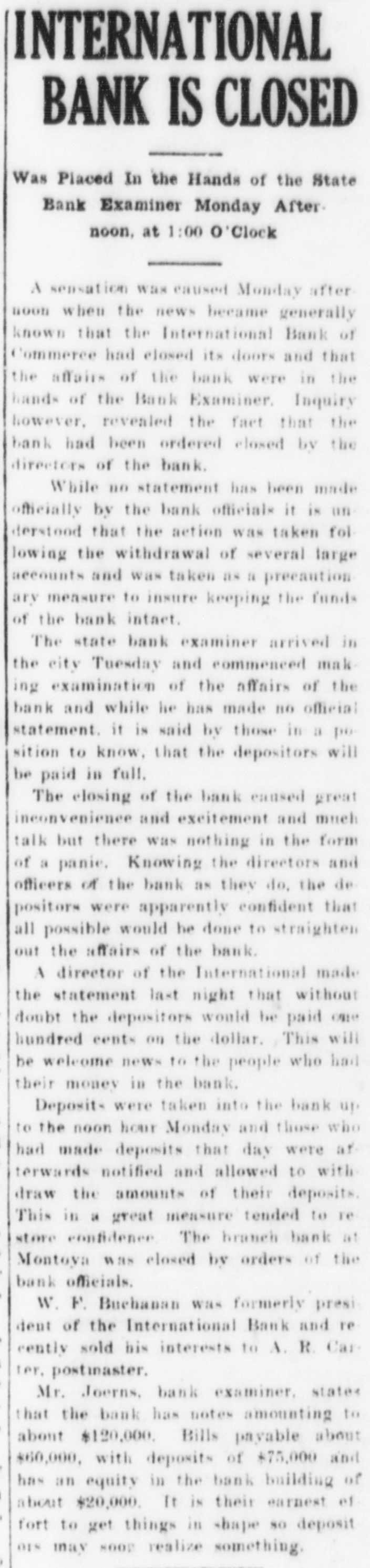 INTERNATIONAL BANK IS CLOSED Was Placed In the Hands of the State Bank Examiner Monday After noon, at 1:00 O'Clock A sensation was caused Monday after noon when the news became generally known that the International Bank of Commerce had closed its doors and that the affairs of the bank were in the hands of the Bank Examiner Inquiry however, revealed the fact that the bank had been ordered closed by the directors of the bank. While no statement has been made officially by the bank officials it is un derstood that the action was taken foi lowing the withdrawal of several large accounts and was taken as a precaution ary measure to insure keeping the funds of the bank intact. The state bank examiner arrived in the city Tuesday and commenced mak ing examination of the affairs of the bank and while he has made no official statement it is said by those in a por sition to know. that the depositors will be paid in full. The closing of the bank caused great inconvenience and excitement and much talk but there was nothing in the form of a panic. Knowing the directors and officers of the bank as they do, the de positors were apparently confident that all possible would be done to straighten out the affairs of the bank A director of the International made the statement last night that without doubt the depositors would be paid one hundred cents on the dollar. This will be welcome news to the people who had their money in the bank. Deposit- were taken into the bank up to the noon hour Monday and those who had made deposits that day were at terwards notified and allowed to with draw the amounts of their deposits This in a great measure tended to re store confidence The branch bank at Montoya was closed by orders of the bank officials W. F. Buchanan was formerly presi dent of the International Bank and re cently sold his interests to A. R. Car ter. postinaster. Mr. Joerns, bank examiner. state< that the bank has notes amounting to about $120,000 Bills payable about $60,000, with deposits of *75,000 and has an equity in the bank building of about *20,000. It is their earnest et fort to get things in shape so deposit OIS may 8002 realize something. w