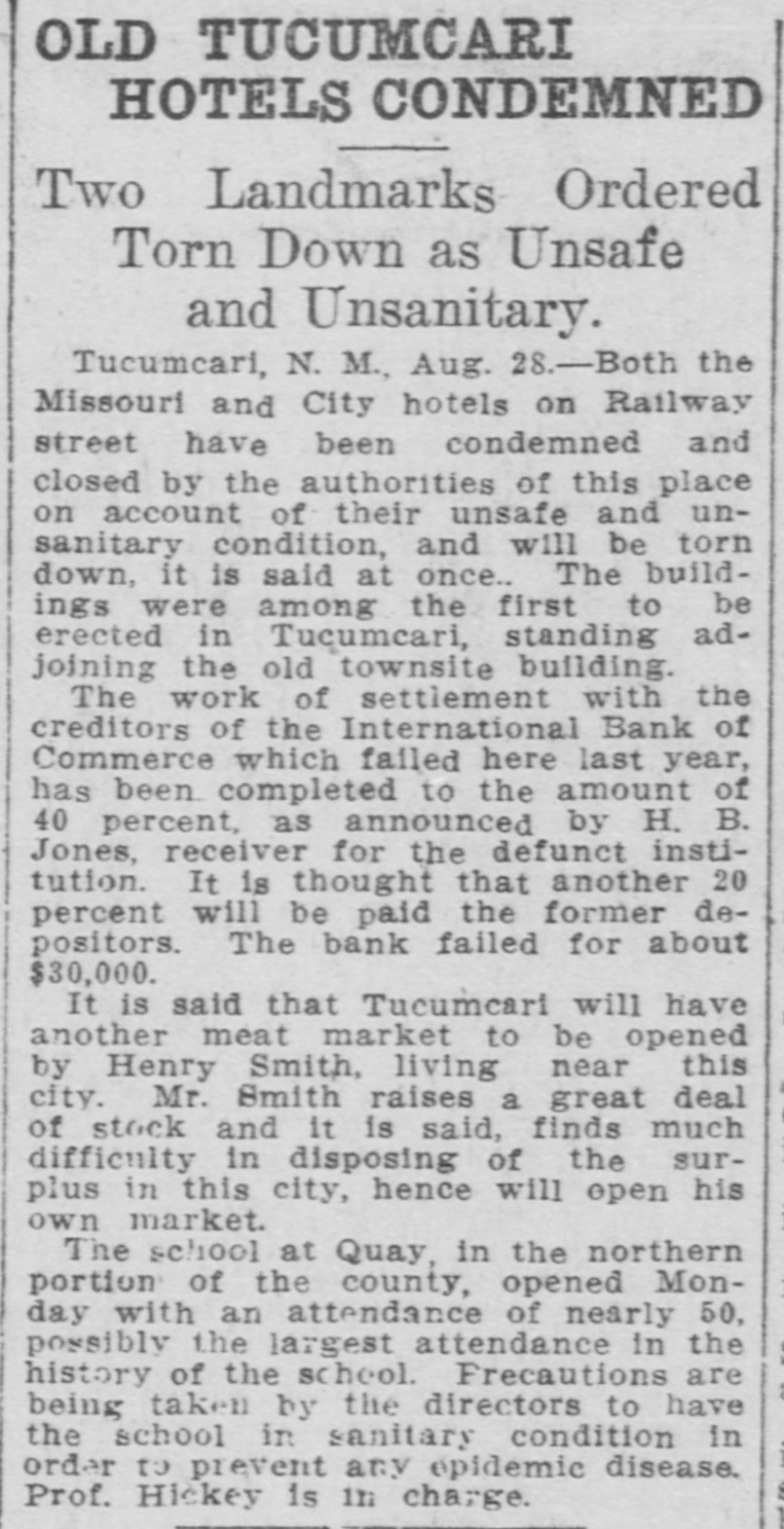 OLD TUCUMCARI HOTELS CONDEMNED Two Landmarks Ordered Torn Down as Unsafe and Unsanitary. Tucumcari, N. M., Aug. 28.-Both the Missouri and City hotels on Railway street have been condemned and closed by the authorities of this place on account of their unsafe and unsanitary condition, and will be torn down, it is said at once.. The buildings were among the first to be erected in Tucumcari, standing adjoining the old townsite building. The work of settlement with the creditors of the International Bank of Commerce which failed here last year, has been. completed to the amount of 40 percent, as announced by H. B. Jones, receiver for the defunct institution. It is thought that another 20 percent will be paid the former depositors. The bank failed for about $30,000. It is said that Tucumcari will have another meat market to be opened by Henry Smith, living near this city. Mr. Smith raises a great deal of stock and it is said, finds much difficulty in disposing of the surplus in this city, hence will open his own market. The school at Quay, in the northern portion of the county, opened Monday with an attendance of nearly 50, possibly the largest attendance in the history of the school. Frecautions are being taken by the directors to have the school in sanitary condition in order to prevent any epidemic disease. Prof. Hickey is in charge.