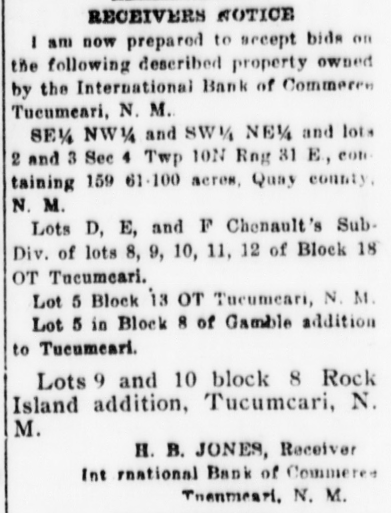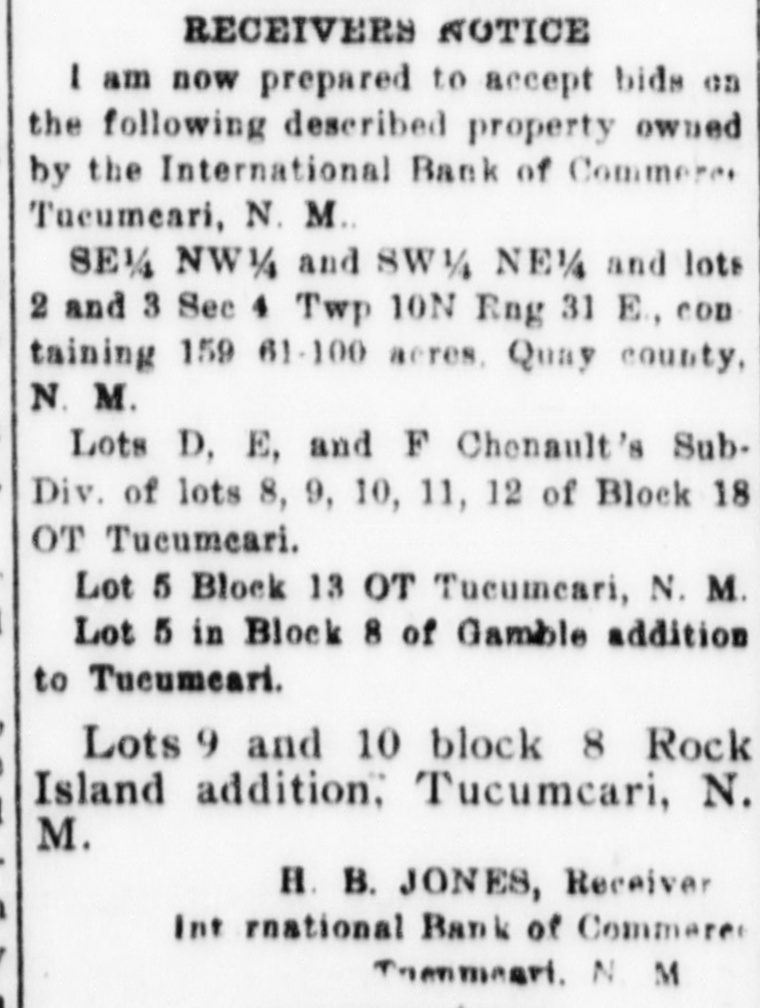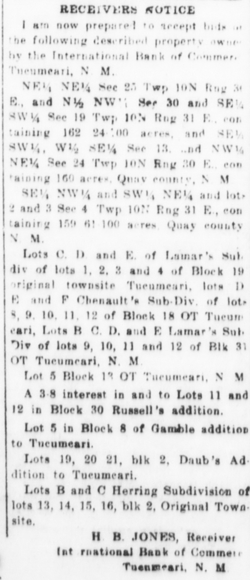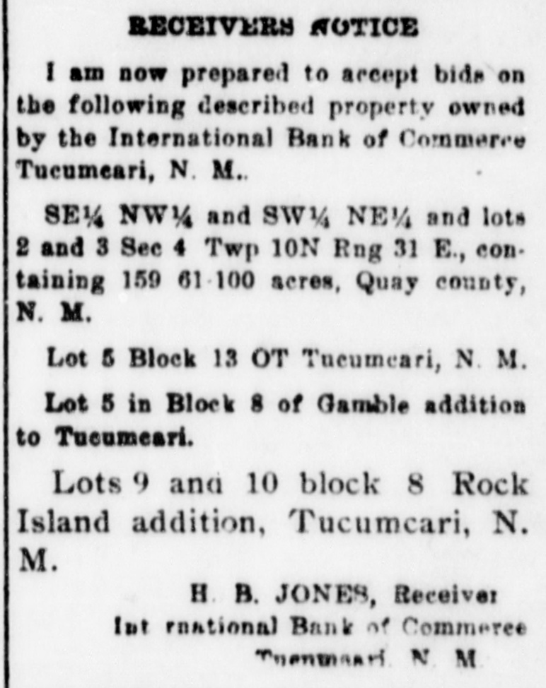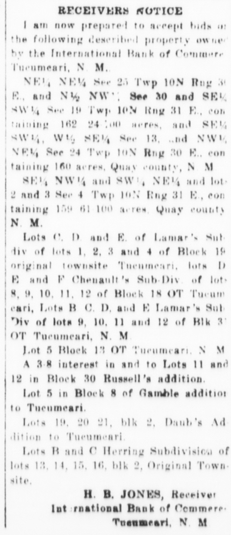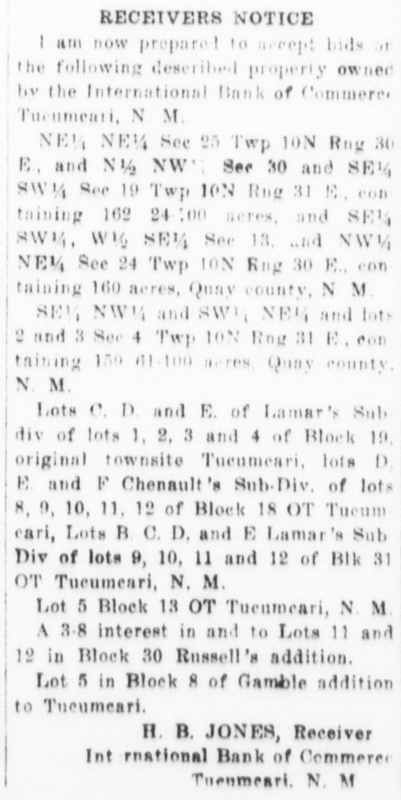 # RECEIVERS NOTICE I am now prepared to accept bids on the following described property owned by the International Bank of Commerce Tucumeari, N. M.. SE¼ NW¼ and SW¼ NE¼ and lots 2 and 3 Sec 4 Twp 10N Rng 31 E., containing 159 61-100 acres, Quay county, N. M. Lot 5 Block 13 OT Tucumcari, N. M. Lot 5 in Block 8 of Gamble addition to Tucumeari. Lots 9 and 10 block 8 Rock Island addition, Tucumcari, N. M. H. B. JONES, Receiver International Bank of Commerce Tucumcari. N. M