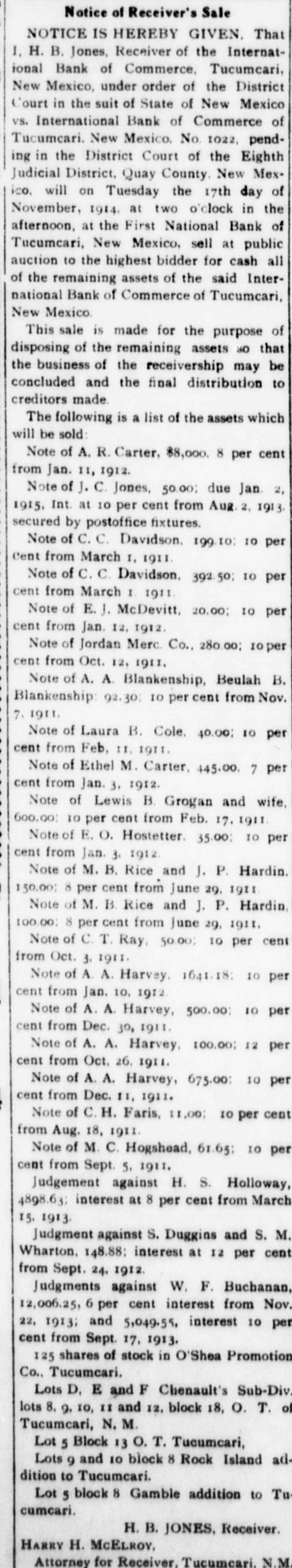 Notice of Receiver's Sale NOTICE IS HEREBY GIVEN, That I, H. B. Jones, Receiver of the International Bank of Commerce, Tucumcari, New Mexico, under order of the District Court in the suit of State of New Mexico vs. International Bank of Commerce of Tucumcari. New Mexico. No. 1022, pending in the District Court of the Eighth Judicial District, Quay County. New Mexico, will on Tuesday the 17th day of November, 1914, at two o'clock in the afternoon, at the First National Bank of Tucumcari, New Mexico, sell at public auction to the highest bidder for cash all of the remaining assets of the said International Bank of Commerce of Tucumcari, New Mexico. This sale is made for the purpose of disposing of the remaining assets 30 that the business of the receivership may be concluded and the final distribution to creditors made. The following is a list of the assets which will be sold: Note of A. R. Carter, $8,000. 8 per cent from Jan. II, 1912. Note of J. C. Jones, 50.00; due Jan. 2, 1915, Int. at 10 per cent from Aug. 2, 1913, secured by postoffice fixtures. Note of C.C. Davidson. 199.10: 10 per Cent from March I, 1911. Note of C. C. Davidson. 392.50; TO per cent from March I. 1911. Note of E.J. McDevitt, 20.00; 10 per cent from Jan. 12, 1912. Note of Jordan Merc. Co., 280.00; IO per cent from Oct. 12, 1911. Note of A. A. Blankenship, Beulah B. Blankenship: 92.30; 10 per cent from Nov. 7. 1911. Note of Laura B. Cole. 40.00; 10 per cent from Feb, II, 1911. Note of Ethel M. Carter, 445.00, 7 per cent from Jan. 3. 1912. Note of Lewis B. Grogan and wife, 600.00 10 per cent from Feb. 17. 1911. Note of E. O. Hostetter. 35.00; 10 per cent from Jan. 3. 1912. Note of M. B. Rice and J. P. Hardin. 150.00; 8 per cent from June 29, 1911 Note of M. B. Rice and J. P. Hardin, 100.00 8 per cent from June 29, 1911, Note of C. T. Ray, 50.00; TO per cent from Oct. 3. 1911. Note of A. A. Harvey. 1641.18; 10 per cent from Jan. 10, 1912 Note of A. A. Harvey, 500.00; 10 per cent from Dec. 30, 1911. Note of A. A. Harvey, 100.00; 12 per cent from Oct. 26, 1911. Note of A. A. Harvey, 675.00: IO per cent from Dec. 11, 1911. Note of C.H. Faris, 11,00; 10 per cent from Aug. 18, 1911. Note of M. C. Hogshead, 61.65: 10 per cent from Sept. 5. 1911. Judgement against H. S. Holloway, 4898.63; interest at 8 per cent from March 15, 1913. Judgment against S. Duggins and S. M. Wharton. 148.88; interest at 12 per cent from Sept. 24, 1912. Judgments against W, F. Buchanan, 12,006.25, 6 per cent interest from Nov. 22, 1913; and 5,049.55, interest 10 per cent from Sept. 17, 1913. 125 shares of stock in O'Shea Promotion Co., Tucumcari. Lots D, E and F Chenault's Sub-Div. lots 8, 9. 10, II and 12, block 18, O. T. of Tucumcari, N. M. Lot 5 Block 13 O. T. Tucumcari, Lots 9 and 10 block 8 Rock Island addition to Tucumcari. Lot 5 block 8 Gamble addition to Tu cumcari. H. B. JONES, Receiver. HARRY H. MCELROY, Attorney for Receiver, Tucumcari. N.M.