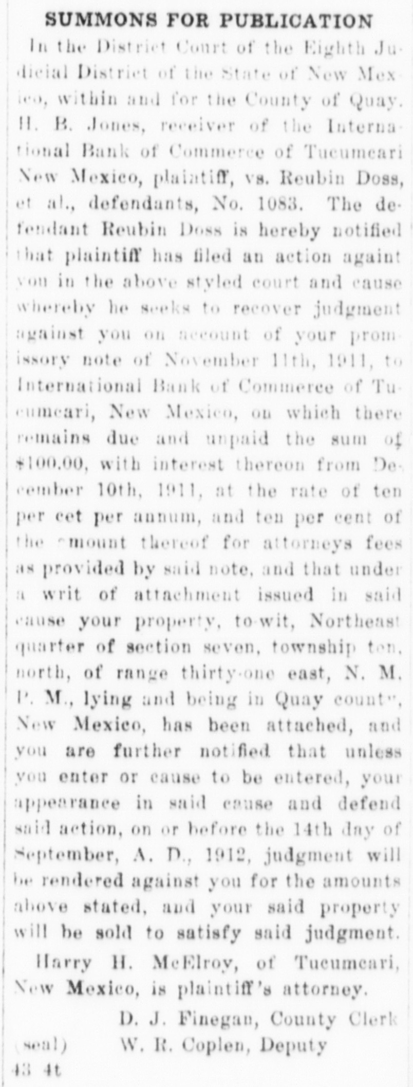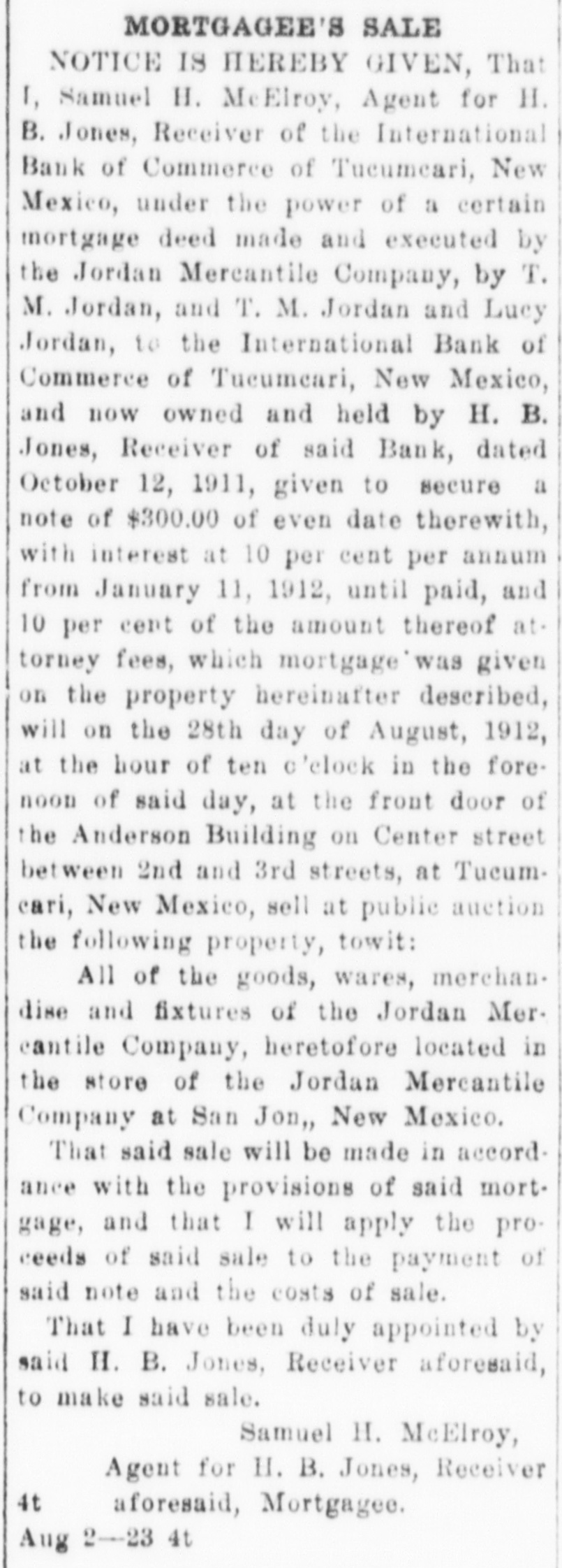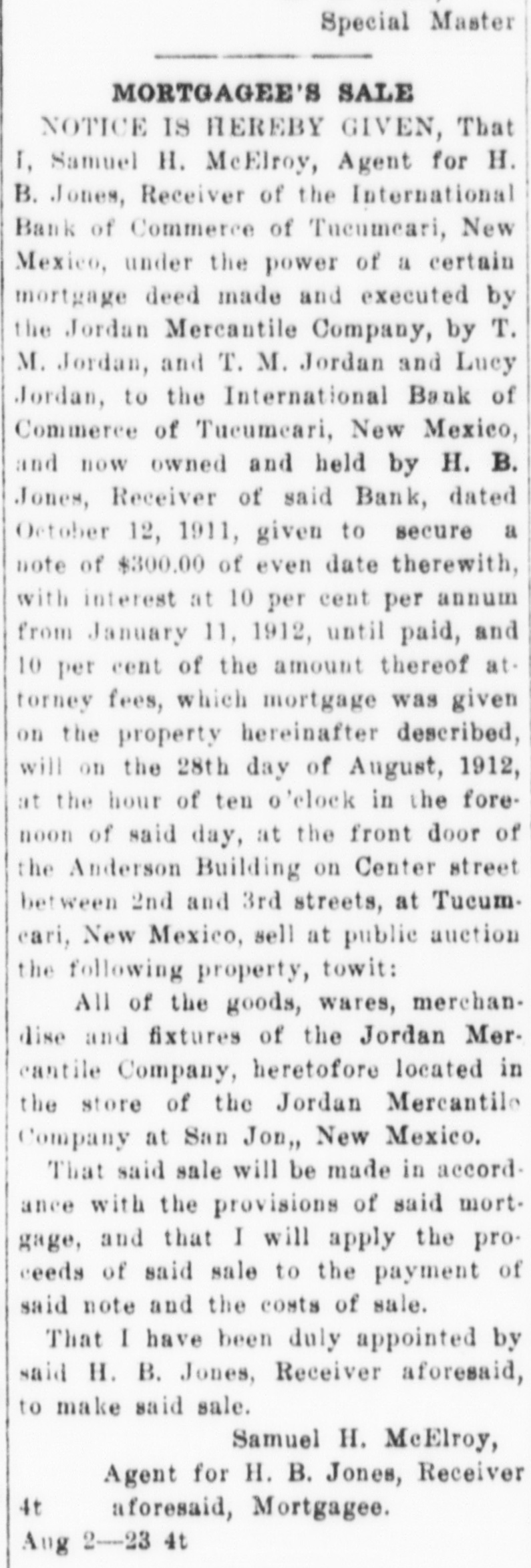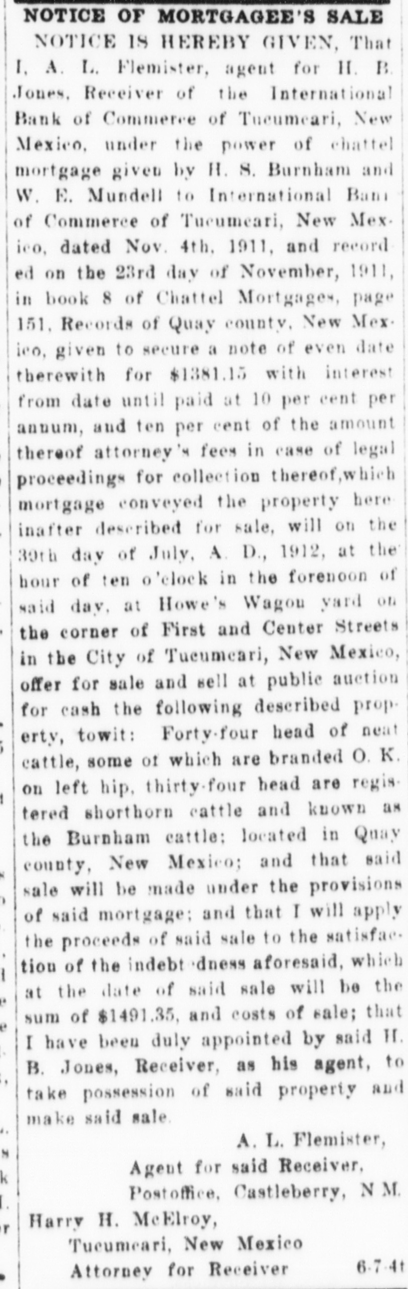 NOTICE IS HEREBY GIVEN, That I. A. L. Flemister, agent for H. B. Jones, Receiver of the International Bank of Commerce of Tucumcari, New Mexico, under the power of chattel mortgage given by H. S. Burnham and W. E. Mundell to International Bank of Commerce of Tucumcari, New Mexico, dated Nov. 4th, 1911, and recorded on the 23rd day of November, 1911, in book 8 of Chattel Mortgages, page 151, Records of Quay county, New Mexico, given to secure a note of even date therewith for $1381.15 with interest from date until paid at 10 per cent per annum, and ten per cent of the amount thereof attorney's fees in case of legal proceedings for collection thereof, which mortgage conveyed the property hereinafter described for sale, will on the 39th day of July, A. D., 1912, at the hour of ten o'clock in the forenoon of said day, at Howe's Wagon yard on the corner of First and Center Streets in the City of Tucumcari, New Mexico, offer for sale and sell at public auction for cash the following described property, towit: Forty-four head of neat cattle, some of which are branded O. K. on left hip, thirty-four head are registered shorthorn cattle and known as the Burnham cattle; located in Quay county, New Mexico; and that said sale will be made under the provisions of said mortgage; and that I will apply the proceeds of said sale to the satisfaction of the indebtedness aforesaid, which at the date of said sale will be the sum of $1491.35, and costs of sale; that I have been duly appointed by said H. B. Jones, Receiver, as his agent, to take possession of said property and make said sale.