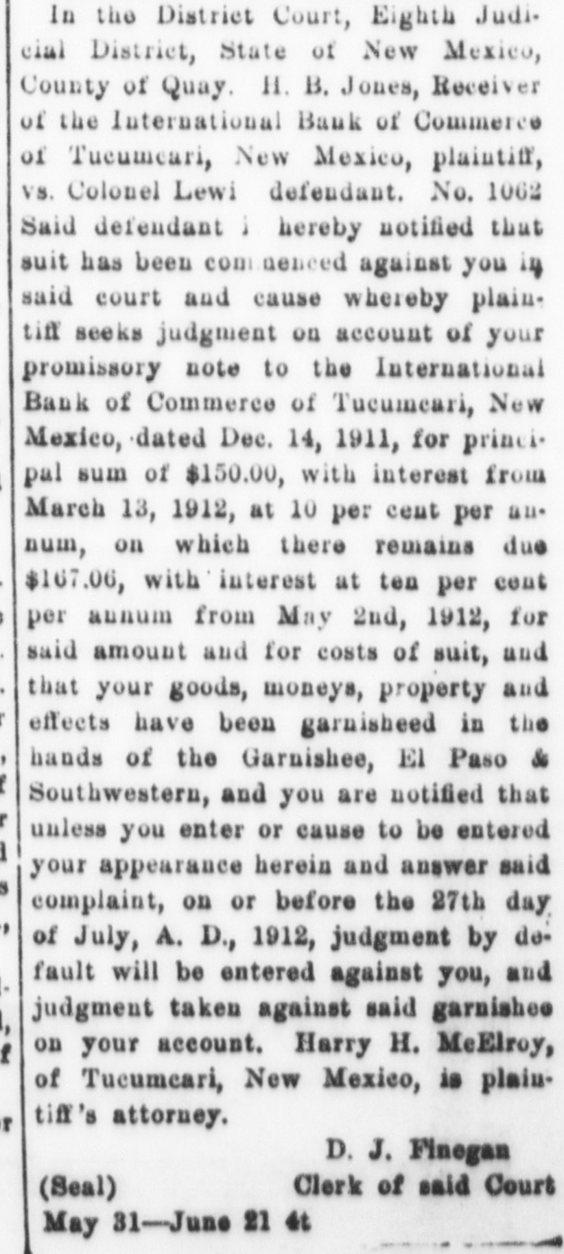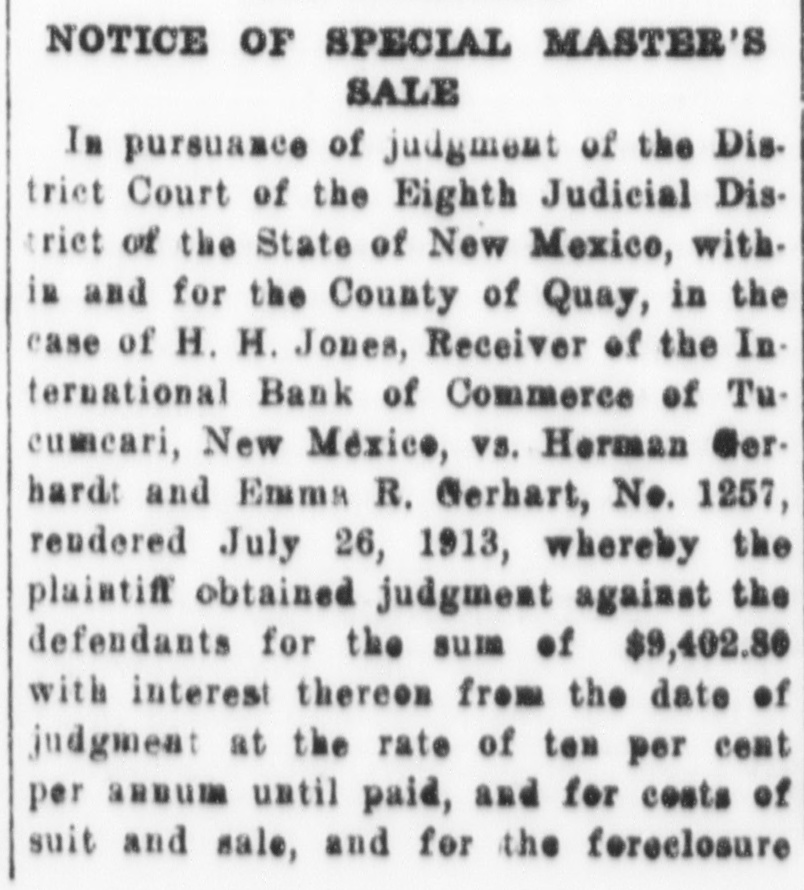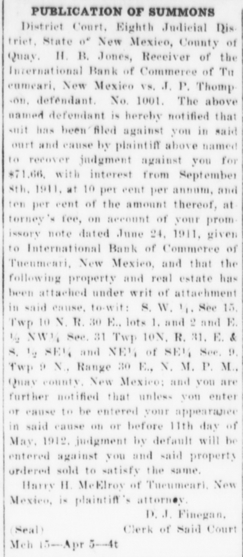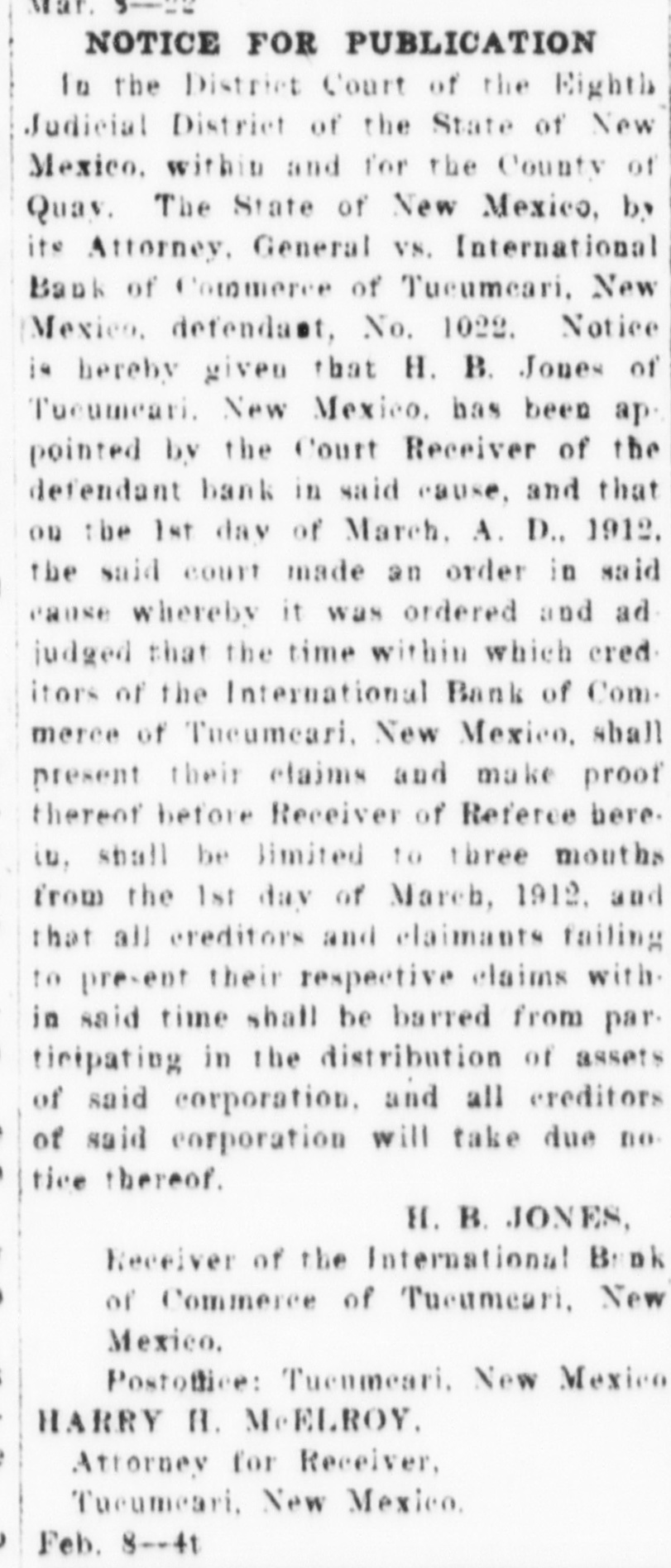 NOTICE IS HEREBY GIVEN, That I. A. L. Flemister, agent for H. B. Jones, Receiver of the International Bank of Commerce of Tucumcari, New Mexico, under the power of chattel mortgage given by H. S. Burnham and W. E. Mundell to International Bank of Commerce of Tucumcari, New Mexico, dated Nov. 4th, 1911, and recorded on the 23rd day of November, 1911, in book 8 of Chattel Mortgages, page 151, Records of Quay county, New Mexico, given to secure a note of even date therewith for $1381.15 with interest from date until paid at 10 per cent per annum, and ten per cent of the amount thereof attorney's fees in case of legal proceedings for collection thereof, which mortgage conveyed the property hereinafter described for sale, will on the 39th day of July, A. D., 1912, at the hour of ten o'clock in the forenoon of said day, at Howe's Wagon yard on the corner of First and Center Streets in the City of Tucumcari, New Mexico, offer for sale and sell at public auction for cash the following described property, towit: Forty-four head of neat cattle, some of which are branded O. K. on left hip, thirty-four head are registered shorthorn cattle and known as the Burnham cattle; located in Quay county, New Mexico; and that said sale will be made under the provisions of said mortgage; and that I will apply the proceeds of said sale to the satisfaction of the indebtedness aforesaid, which at the date of said sale will be the sum of $1491.35, and costs of sale; that I have been duly appointed by said H. B. Jones, Receiver, as his agent, to take possession of said property and make said sale.