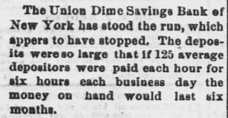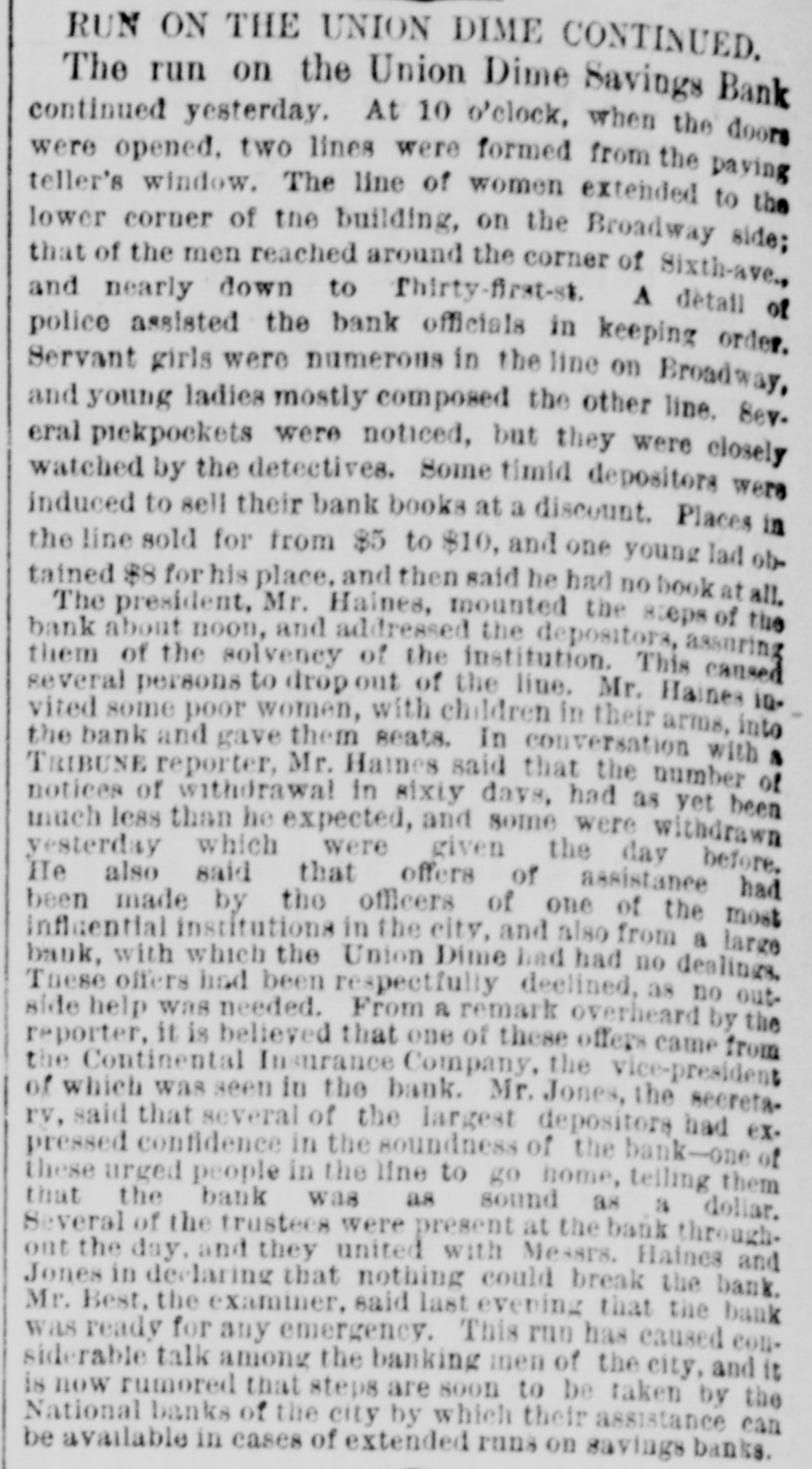 BANKING TROUBLES. The Union Dime Board of Trustees Reorganized. NATIONAL TRUST AFFAIRS. A Statement of Their Condition To Be Speedily Furnished. The following statement relative to the reorganizadon of the Union Dime Savings Institution was furaished yesterday afternoon from the office of Bank Superintendent H. L. LambThe Bank Superintendent informed the trustees of the Union Dime Savings Institution on the 21st of No. vember that he deemed the reorganization of the Board necessary to restore contidence in the depositors and in the mind of the public; that Le leared the report of the solvency of the institution would not alone be sufficient to put the bank in its old position in respect to credit. This suggestion was not at once favorably received by the Board, and a committee was appointed to conter with the Superintendent upon the subject. After consultation Mr. Lamb adhered to his views and proposed that commission should be formed of several trustees of the savings bank and the examiner and Feveral officers of savings banks in the city. His proposal was accepted, and the SuperIntendent named the gentlemen to compose such commission. After discussion this conference agreed that the interests of the institution would be promoted by reorganization. AD adjourned meeting of the Board of Trustees was then helu and the following resolution was adopted RESOLUTION OFFERED BY MR. DUTCHER AND SECONDED BY MR. FLOYD JONES. Resolved. That each member of the present Board tender his resignation and each member present cast his ballot. on which shall be written the names of twelve members who. in his judgment, should remain to take action upon the and fill vacancies, said ballots to be placed unopened in the hands of the Superintendent, who is requested to designate the members to remain and act upon the resignations. The trustees then present signed the following copy of the resignation tendered to the Board:To THE BOARD OF TRUSTEES OF THE UNION DIME SAVINGS The INSTITUTION: undersigned. desiring the success and future pros perity or this institution, hereby each and for himself tenders his resignation AS trustee, and pledges himself to do all in his power to aid the institution whether he remains or N.J. retires: Haines, William S. Whitlock, Maltby G. Lane, G. S. Chapin, Thomas Floyd Jones, John Creighton, Silas 15. Dutcher, Aaron Close, Wiltiam F. Hemmingway, Joseph H. Orvis. John Mack, B. Darling. J. H. V. Arnold, Willam Wake. Richard M. Nichois, F.G. Green. James Bevgridge. Edward as. Poor. John H. Johnston, W. Livingston. Charles A. Colby. Joseph Smith, E. Galloran. Joseph Kenworthy, Frederick Jacobson, J. Maedonough, E. M. Van Tassell. C. E. Brush, William G. Ross, W. S. Miller, F. Bonman. The Bank Superintendent, acting under the direction and request contained in the above resolution, named welve trustees to remain and complete the reorganization of the Board. Delay in action was compeliod by the provisions of law. which declare that vacancies shall be filled ata regular meeting of the Board 01 Trustees. At that meeting, on Wednesday, the resignations of many trustees were accepted and a lew gentlemen were chosen to fill the vacancies. An adjourned meeting will be held next week, when other gentlemen, widely and lavorably known for business capacity and faithiulness to all duties which they assume, will be chosen as trustees. There IS harmony of spirit among the trustees and a decided purpose to reduce expenses to the lowest figure practicable and put all real estate assets of the institution in shape to produce income as early as possible. The following gentlemen were chosen new trustees:-H. K. Thurber, of H. K. & F. B. Thurber & Co. Joseph F. Knapp, of Major & Knapp; John W. Britton, of Brewster & Co. Thomas L. James, Postmaster; R. N. Hazard, of Caswell, Hazard & Co.; William A. Cole, President of the Produce Exchange. The following trustees are retained:-Richard M. Nichols, retired merchant; Edward E. Poor, of Denny, Poor & Co.; Aifred B. Darling, of Darling, Griswold & Co., Fifth Avenue Hotel; Aaron Close, merchant, Fulton and Greenwich street; John Creighton, merchant, No. 173 Sixth avenue; Silas B. Dutcher, Ap praiser's office; William S. Fogg, merchant, No. 171 Chatham street; William T. Hemmenway, retired merchunt; James Beveridge, retired merchant; FrederICK Jacobson, of Swift, Sackett & Co., No. 59 Worth street; Chnton E. Brush, merchant, No. 37 Walker street; J. H. Johnston, jeweller, No. 150 Bowery; William G. Ross, merchant. No. 64 Walker street. The income for the six months ending December 31, less expenses, IS $205,000; interest due depositors, about $162,000; surplus Income from July to January, $43,000. Several friends of the bank say that there 18 reason to be thankful that it stands on the very soundest basis, else 11 would ere now nave been in the hands of the "bank wreckers," who have already possessed themselves of several corporations which might have been saved to the public. These parties point to the fact that government officials, and guasi officials, are nominated to receiverships created by their own exertions, without giving the sharebolders or trustees a chance of consulting their comIS mon interests as to who should be receiver. It shought in many influential quarters that the attention of Governor Robinson should be promptly called to this condition of affairs. THE CLINTON SAVINGS BANK. Mr. Edward L. Parris, receiver of the Clinton SavIngs Bank, makes the following statement:-He took possession on the 29th of last August and received assets to the nominal amount of $64,830 11. or this amount but $241 89 was in cash, the rest being in real estate; 117 shares ratiroad stock, which was last sold for thirty cents on the dollar; fifty shares in the National Trust Company and personal notes of the trustees. Mr. Parris has realized out of the assets the sum of $20,967 59, and IS now ready to declare a dividend of twenty five per cent. The claims of the 1,252 de. 