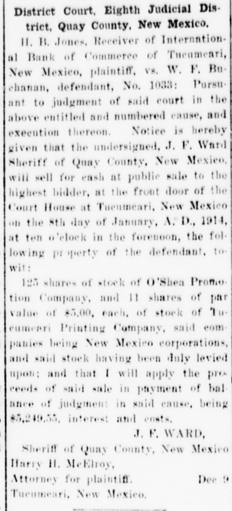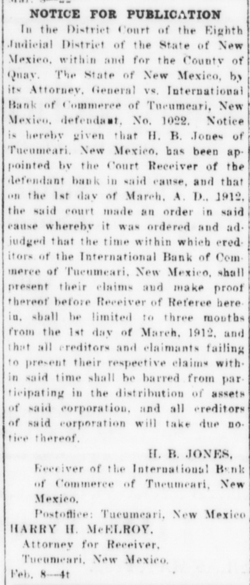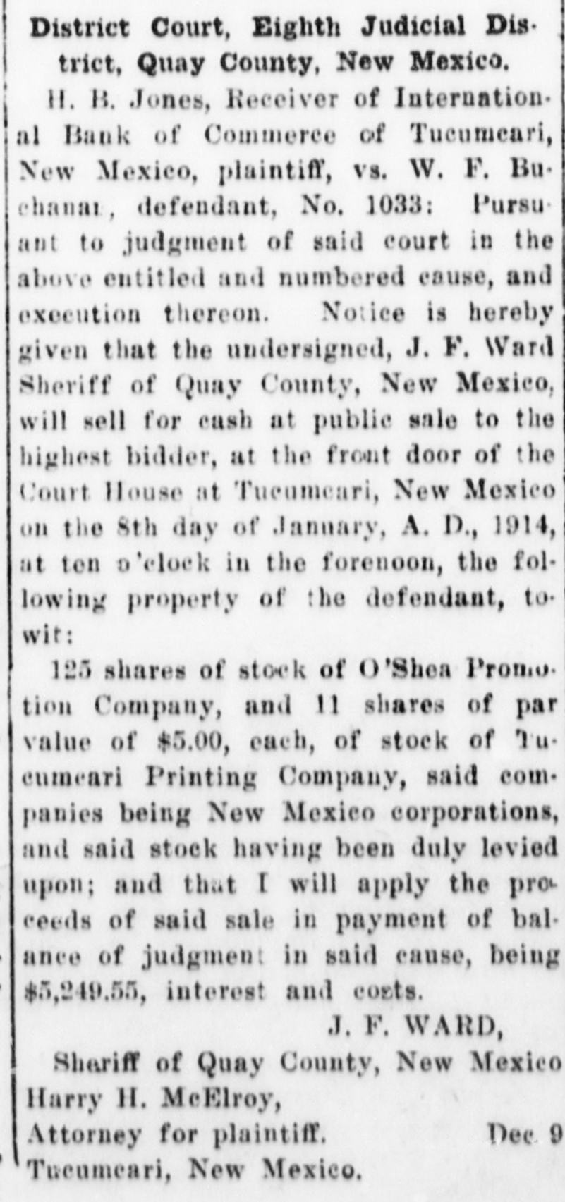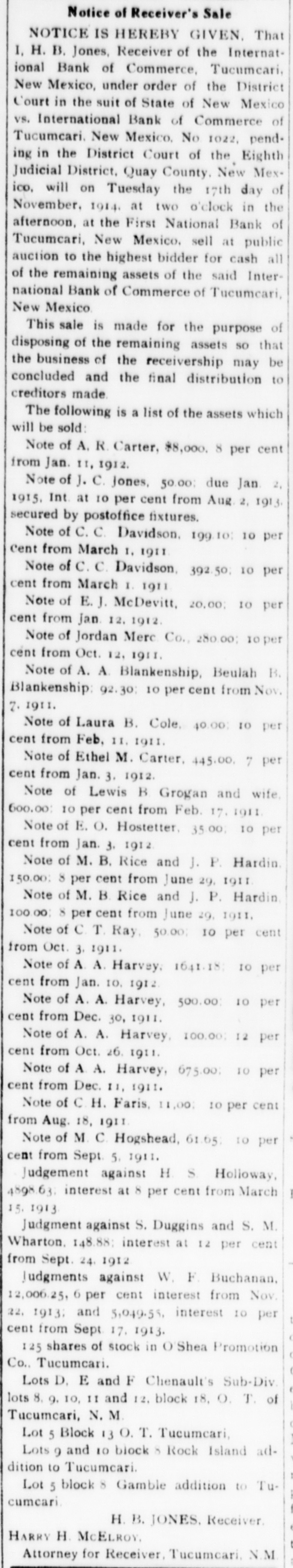 Notice of Receiver's Sale NOTICE IS HEREBY GIVEN. That I, H. B. Jones, Receiver of the International Bank of Commerce, Tucumcari, New Mexico, under order of the District Court in the suit of State of New Mexico vs. International Bank of Commerce of Tucumcari. New Mexico. No 1022, pending in the District Court of the Eighth Judicial District, Quay County. New Mexico, will on Tuesday the 17th day of November. 1914. at two o'clock in the afternoon, at the First National Bank of Tucumcari, New Mexico. sell at public auction to the highest bidder for cash all of the remaining assets of the said International Bank of Commerce of Tucumcari, New Mexico This sale is made for the purpose of disposing of the remaining assets so that the business of the receivership may be concluded and the final distribution to creditors made. The following is a list of the assets which will be sold: Note of A. R. Carter, $8,000. 8 per cent from Jan. 11, 1912. Note of J. C. Jones, 50.00; due Jan 2, 1915, Int. at 10 per cent from Aug 2, 1913. secured by postoffice fixtures. Note of C.C. Davidson. 199.10: 10 per Cent from March 1, 1911 Note of C. C. Davidson, 392.50; 10 per cent from March I. 1911 Note of E.J. McDevitt, 20,00; 10 per cent from Jan 12. 1912. Note of Jordan Merc Co., 280.00; IO per cent from Oct. 12, 1911. Note of A. A. Blankenship, Beulah B. Blankenship: 92.30: 10 per cent from Nov. 2. 1911. Note of Laura B. Cole. 40.00 10 per cent from Feb, II. 1911. Note of Ethel M. Carter, 445.00 7 per cent from Jan. 3. 1912. Note of Lewis B Grogan and wife. 600.00 10 per cent from Feb. 17, 1911 Note of E. O. Hostetter, 35.00; 10 per cent from Jan. 3. 1912 Note of M. B. Rice and J. P. Hardin. 150.00: 8 per cent from June 29, 1911 Note of M. B Rice and J. P. Hardin 100.00 8 per cent from June 29, 1911, Note of C T. Ray, 50.00 10 per cent from Oct. 3. 1911. Note of A A. Harvey. 1641.18 10 per cent from Jan. 10. 1912 Note of A. A. Harvey, 500.00 10 per cent from Dec. 30, 1911. Note of A. A. Harvey, 100.00 12 per cent from Oct. 26. 1911. Note of A A. Harvey, 675.00; 10 per cent from Dec. 11, 1911. Note of C H. Faris, 11,00: 10 per cent from Aug. 18, 1911 Note of M C Hogshead, 61.65 to per cent from Sept. 5. 1911. Judgement against H S Holloway, 4898.63; interest at 8 per cent from March 15. 1913 Judgment against S. Duggins and S. M. Wharton. 148.88; interest at 12 per cent from Sept. 24, 1912 ludgments against W. F Buchanan, 12,006.25, 6 per cent interest from Nov. 22, 1913; and 5,049.55, interest 10 per cent from Sept 17. 1913. 125 shares of stock in O Shea Promotion Co., Tucumcari. Lots D. E and F Chenault's Sub-Div. lots 8. 9. 10, II and 12. block 18, O. T. of Tucumcari, N. M. Lot 5 Block 13 O. T. Tucumcari, Lots 9 and 10 block 8 Rock Island addition to Tucumcari. Lot 5 block 8 Gamble addition to Tucumcari. H. B. JONES. Receiver. HARRY H. MCELROY. Attorney for Receiver, Tucumcari, N.M