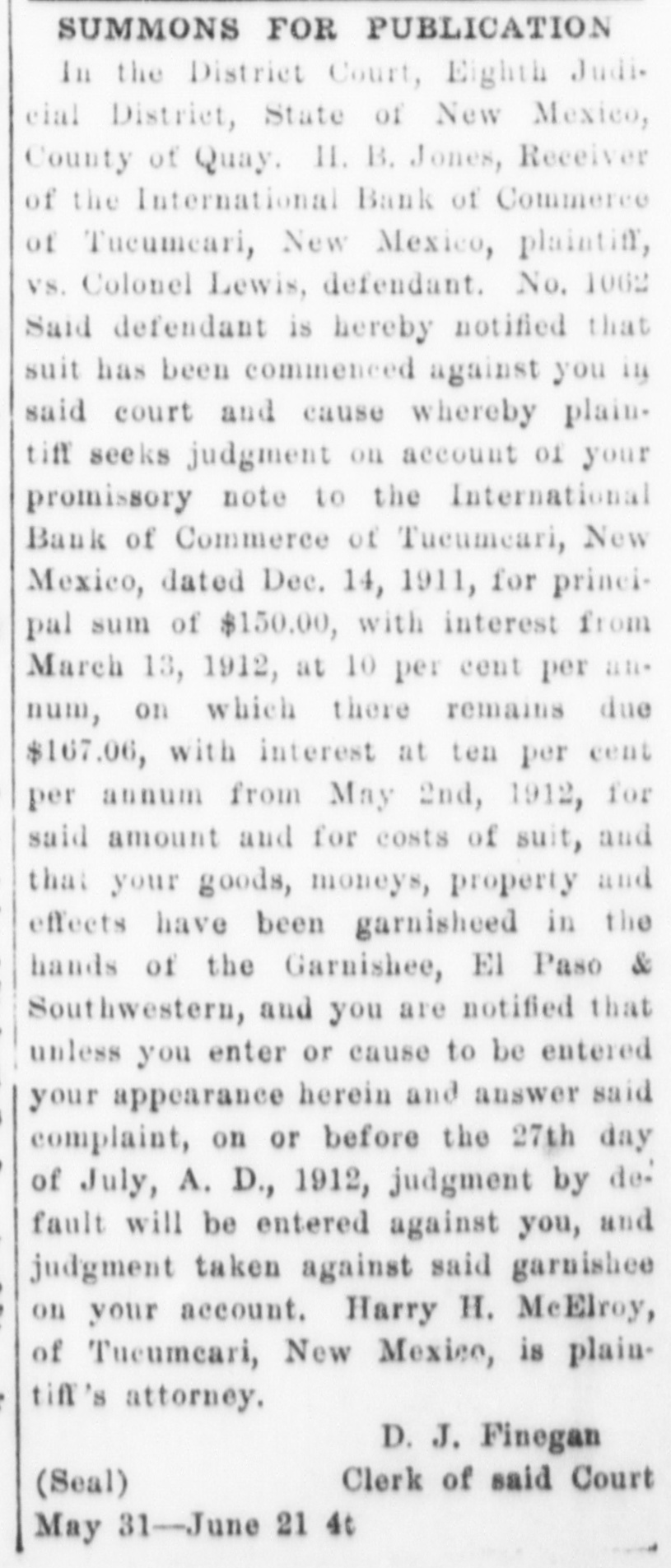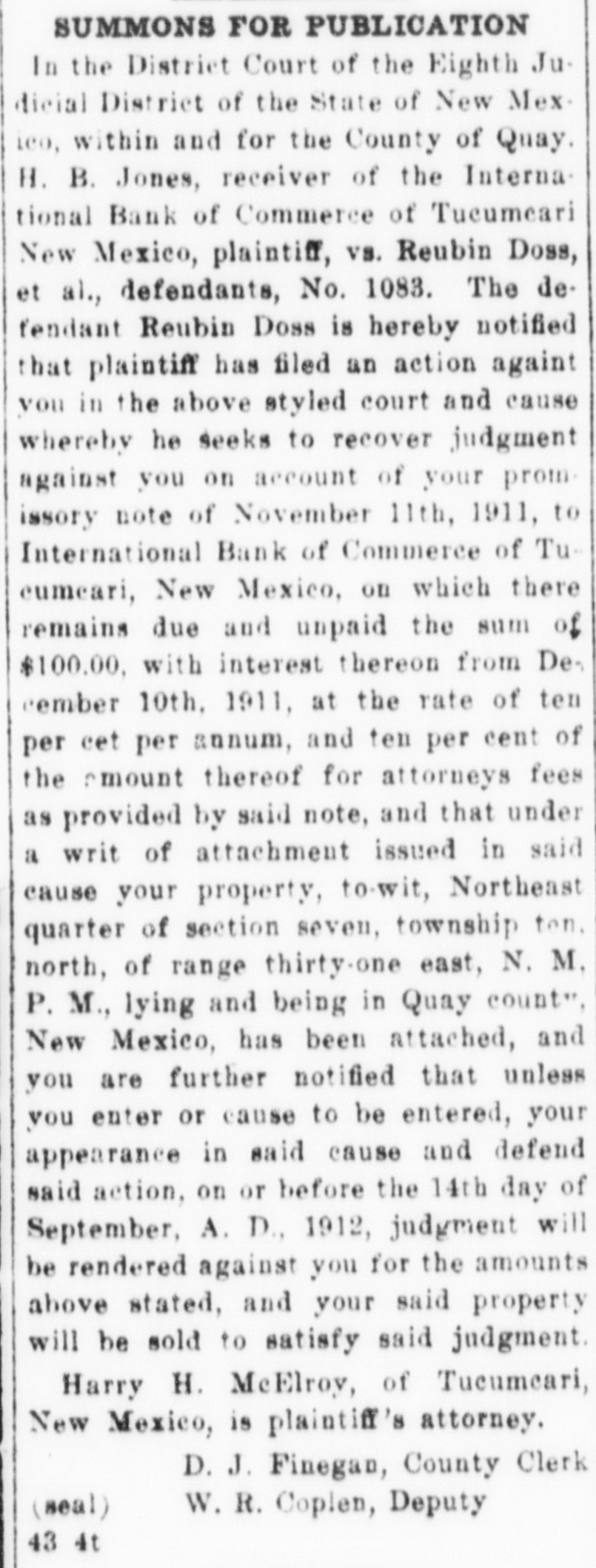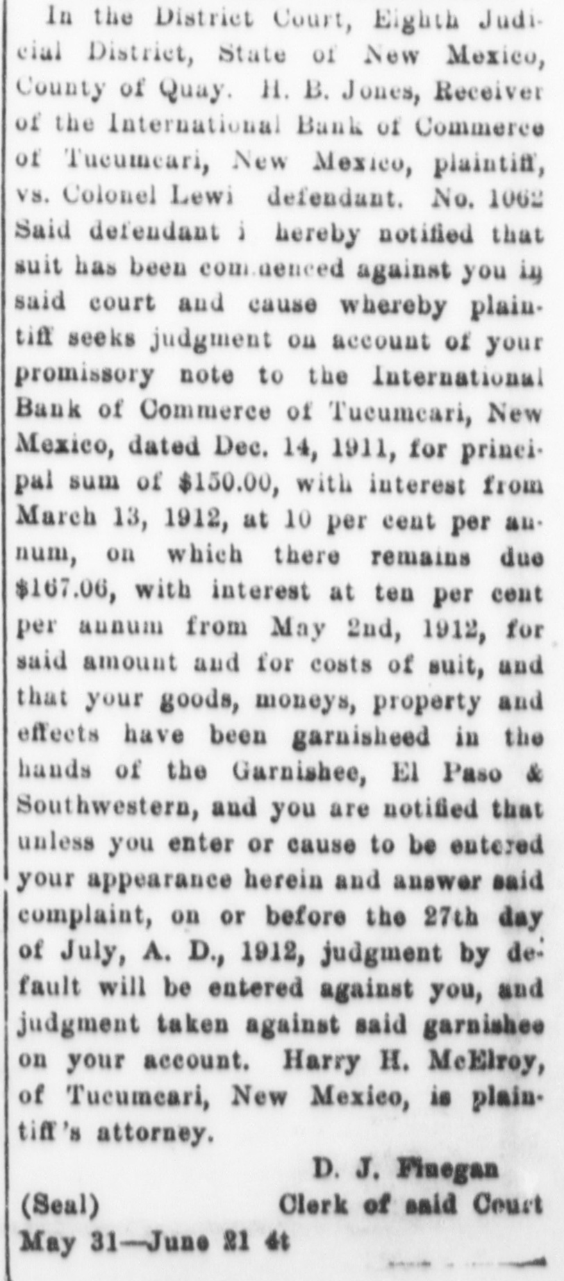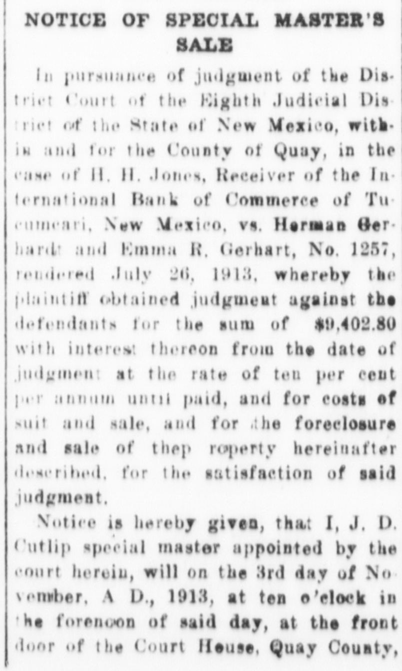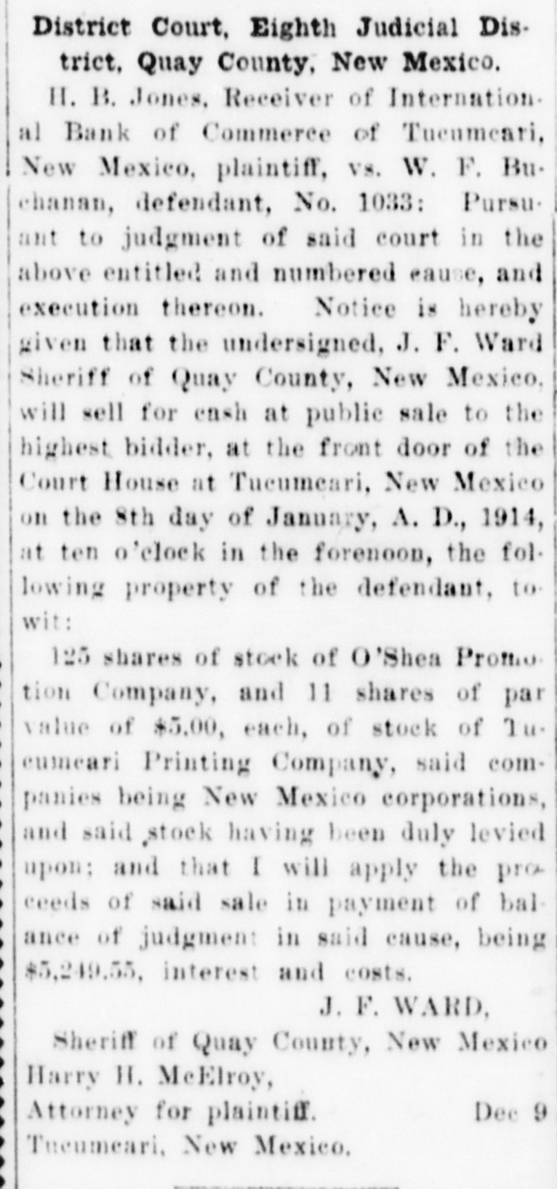 Notice of Receiver's Sale NOTICE IS HEREBY GIVEN. That I, H. B. Jones, Receiver of the International Bank of Commerce, Tucumcari, New Mexico, under order of the District Court in the suit of State of New Mexico vs. International Bank of Commerce of Tucumcari. New Mexico. No 1022, pending in the District Court of the Eighth Judicial District, Quay County. New Mexico, will on Tuesday the 17th day of November. 1914. at two o'clock in the afternoon, at the First National Bank of Tucumcari, New Mexico. sell at public auction to the highest bidder for cash all of the remaining assets of the said International Bank of Commerce of Tucumcari, New Mexico This sale is made for the purpose of disposing of the remaining assets so that the business of the receivership may be concluded and the final distribution to creditors made. The following is a list of the assets which will be sold: Note of A. R. Carter, $8,000. 8 per cent from Jan. 11, 1912. Note of J. C. Jones, 50.00; due Jan 2, 1915, Int. at 10 per cent from Aug 2, 1913. secured by postoffice fixtures. Note of C.C. Davidson. 199.10: 10 per Cent from March 1, 1911 Note of C. C. Davidson, 392.50; 10 per cent from March I. 1911 Note of E.J. McDevitt, 20,00; 10 per cent from Jan 12. 1912. Note of Jordan Merc Co., 280.00; IO per cent from Oct. 12, 1911. Note of A. A. Blankenship, Beulah B. Blankenship: 92.30: 10 per cent from Nov. 2. 1911. Note of Laura B. Cole. 40.00 10 per cent from Feb, II. 1911. Note of Ethel M. Carter, 445.00 7 per cent from Jan. 3. 1912. Note of Lewis B Grogan and wife. 600.00 10 per cent from Feb. 17, 1911 Note of E. O. Hostetter, 35.00; 10 per cent from Jan. 3. 1912 Note of M. B. Rice and J. P. Hardin. 150.00: 8 per cent from June 29, 1911 Note of M. B Rice and J. P. Hardin 100.00 8 per cent from June 29, 1911, Note of C T. Ray, 50.00 10 per cent from Oct. 3. 1911. Note of A A. Harvey. 1641.18 10 per cent from Jan. 10. 1912 Note of A. A. Harvey, 500.00 10 per cent from Dec. 30, 1911. Note of A. A. Harvey, 100.00 12 per cent from Oct. 26. 1911. Note of A A. Harvey, 675.00; 10 per cent from Dec. 11, 1911. Note of C H. Faris, 11,00: 10 per cent from Aug. 18, 1911 Note of M C Hogshead, 61.65 to per cent from Sept. 5. 1911. Judgement against H S Holloway, 4898.63; interest at 8 per cent from March 15. 1913 Judgment against S. Duggins and S. M. Wharton. 148.88; interest at 12 per cent from Sept. 24, 1912 ludgments against W. F Buchanan, 12,006.25, 6 per cent interest from Nov. 22, 1913; and 5,049.55, interest 10 per cent from Sept 17. 1913. 125 shares of stock in O Shea Promotion Co., Tucumcari. Lots D. E and F Chenault's Sub-Div. lots 8. 9. 10, II and 12. block 18, O. T. of Tucumcari, N. M. Lot 5 Block 13 O. T. Tucumcari, Lots 9 and 10 block 8 Rock Island addition to Tucumcari. Lot 5 block 8 Gamble addition to Tucumcari. H. B. JONES. Receiver. HARRY H. MCELROY. Attorney for Receiver, Tucumcari, N.M