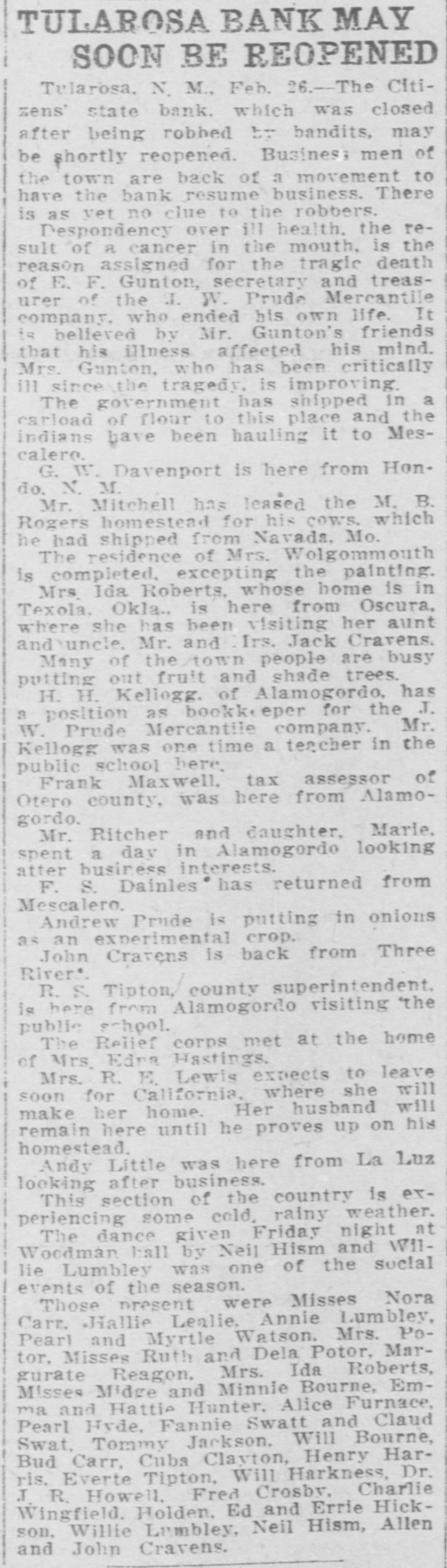 TULAROSA BANK MAY SOON BE REOPENED Tularosa, N. M., Feb. 26.-The Citizens' state bank. which was closed after being robbed by bandits, may be shortly reopened. Business men of the town are back of a movement to have the bank resume business. There is as yet no clue to the robbers. Despondency over ill health. the result of a cancer in the mouth, is the reason assigned for the tragic death of E. F. Gunton, secretary and treasurer of the J. W. Prude Mercantile company, who ended his own life. It is believed by Mr. Gunton's friends that his illness affected his mind. Mrs. Gunton, who has been critically ill since the tragedy, is improving. The government has shipped in a carload of flour to this place and the indians have been hauling it to Mescalero. G. W. Davenport is here from Hondo. N. M. Mr. Mitchell has leased the M. B. Rogers homestead for his cows. which he had shipped from Navada, Mo. The residence of Mrs. Wolgommouth is completed, excepting the painting. Mrs. Ida Roberts, whose home is in Texola. Okla.. is here from Oscura, where she has been visiting her aunt and uncle. Mr. and Irs. Jack Cravens. Many of the town people are busy putting out fruit and shade trees. H. H. Kellogg. of Alamogordo, has 3 position as bookkeeper for the J. W. Prude Mercantile company. Mr. Kellogg was one time a teacher in the public school here. Frank Maxwell, tax assessor of Otero county, was here from Alamogordo. Mr. Ritcher and daughter, Marie. spent a day in Alamogordo looking atter business interests. F. S. Dainles has returned from Mescalero. Andrew Prude is putting in onions as an experimental crop. John Cravens is back from Three River R. S. Tipton, county superintendent. is here from Alamogordo visiting "the public school. The Relief corps met at the home of Mrs. Edra Hastings. Mrs. R. E. Lewis expects to leave soon for California, where she will make her home. Her husband will remain here until he proves up on his homestead. Andy Little was here from La Luz looking after business. This section of the country is experiencing some cold, rainy weather. The dance given Friday night at Woodman hall by Neil Hism and Willie Lumbley was one of the social events of the season. Those present were Misses Nora Carr. Hallie Lealie. Annie Lumbley, Pearl and Myrtle Watson. Mrs. Potor, Misses Ruth and Dela Potor, Margurate Reagon. Mrs. Ida Roberts, Misses Midge and Minnie Bourne, Emma and Hattie Hunter. Alice Furnace, Pearl Hyde. Fannie Swatt and Claud Swat, Tommy Jackson. Will Bourne, Bud Carr, Cuba Clayton, Henry Harris. Everte Tipton, Will Harkness, Dr. J R. Howell. Fred Crosby, Charlie Wingfield. Holden. Ed and Errie Hickson. Willie Lumbley, Neil Hism, Allen and John Cravens.