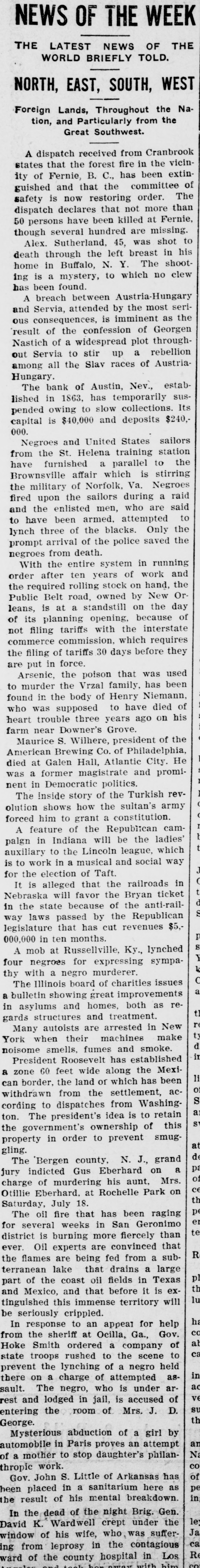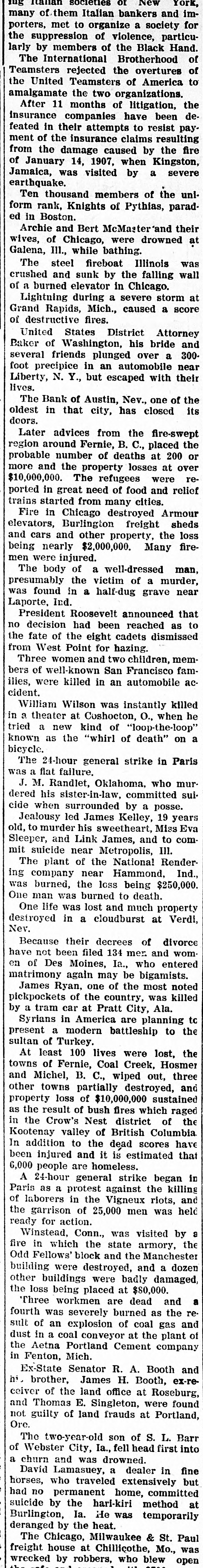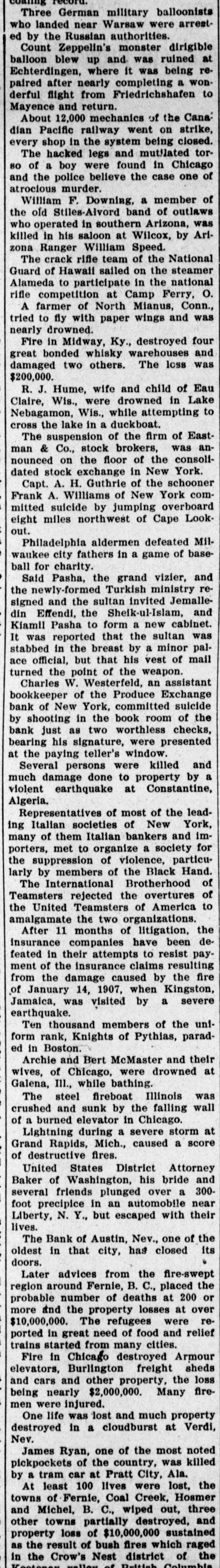 Ruunoo Three German military balloonists who landed near Warsaw were arrested by the Russian authorities. Count Zeppelin's monster dirigible balloon blew up and was ruined at Echterdingen, where it was being repaired after nearly completing a wonderful flight from Friedrichshafen to Mayence and return. About 12,000 mechanics of the Canadian Pacific railway went on strike, every shop in the system being closed. The hacked legs and mutilated torso of a boy were found in Chicago and the police believe the case one of atrocious murder. William F. Downing, a member of the old Stiles-Alvord band of outlaws who operated in southern Arizona, was killed in his saloon at Wilcox, by Arizona Ranger William Speed. The crack rifle team of the National Guard of Hawaii sailed on the steamer Alameda to participate in the national rifle competition at Camp Ferry, O. A farmer of North Mianus, Conn., tried to fly with paper wings and was nearly drowned. Fire in Midway, Ky., destroyed four great bonded whisky warehouses and damaged two others. The loss was $200,000. R. J. Hume, wife and child of Eau Claire, Wis., were drowned in Lake Nebagamon, Wis., while attempting to cross the lake in a duckboat. The suspension of the firm of Eastman & Co., stock brokers, was announced on the floor of the consolidated stock exchange in New York. Capt. A. H. Guthrie of the schooner Frank A. Williams of New York committed suicide by jumping overboard eight miles northwest of Cape Look"no Philadelphia aldermen defeated Milwaukee city fathers in a game of baseball for charity. Said Pasha, the grand vizier, and the newly-formed Turkish ministry resigned and the sultan invited Jemalledin Effendi, the Sheik-ul-Islam, and Kiamil Pasha to form a new cabinet. It was reported that the sultan was stabbed in the breast by a minor palace official, but that his vest of mail turned the point of the weapon. Charles W. Westerfeld, an assistant bookkeeper of the Produce Exchange bank of New York, committed suicide by shooting in the book room of the bank just as two worthless checks, bearing his signature, were presented at the paying teller's window. Several persons were killed and much damage done to property by a violent earthquake at Constantine, Algeria. Representatives of most of the leading Italian societies of New York, many of them Italian bankers and importers, met to organize a society for the suppression of violence, particularly by members of the Black Hand. The International Brotherhood of Teamsters rejected the overtures of the United Teamsters of America to amalgamate the two organizations. After 11 months of litigation, the insurance companies have been defeated in their attempts to resist payment of the insurance claims resulting from the damage caused by the fire of January 14, 1907, when Kingston, Jamaica, was visited by a severe earthquake. Ten thousand members of the uniform rank, Knights of Pythias, paradBoston up pe Archie and Bert McMaster and their wives, of Chicago, were drowned at Galena, Ill., while bathing. The steel fireboat Illinois was crushed and sunk by the falling wall of a burned elevator in Chicago. Lightning during a severe storm at Grand Rapids, Mich., caused a score of destructive fires. United States District Attorney Baker of Washington, his bride and several friends plunged over a 300foot precipice in an automobile near Liberty, N. Y., but escaped with their lives. The Bank of Austin, Nev., one of the oldest in that city, has closed its . doors. Later advices from the fire-swept region around Fernie, B. C., placed the probable number of deaths at 200 or more and the property losses at over $10,000,000. The refugees were reported in great need of food and relief trains started from many cities. Fire in Chicago destroyed Armour elevators, Burlington freight sheds and cars and other property, the loss being nearly $2,000,000. Many firemen were injured. One life was lost and much property destroyed in a cloudburst at Verdi, Nev. James Ryan, one of the most noted pickpockets of the country, was killed by a tram car at Pratt City, Ala. At least 100 lives were lost, the towns of Fernie, Coal Creek, Hosmer and Michel, B. C., wiped out, three other towns partially destroyed, and property loss of $10,000,000 sustained as the result of bush fires which raged in the Crow's Nest district of the