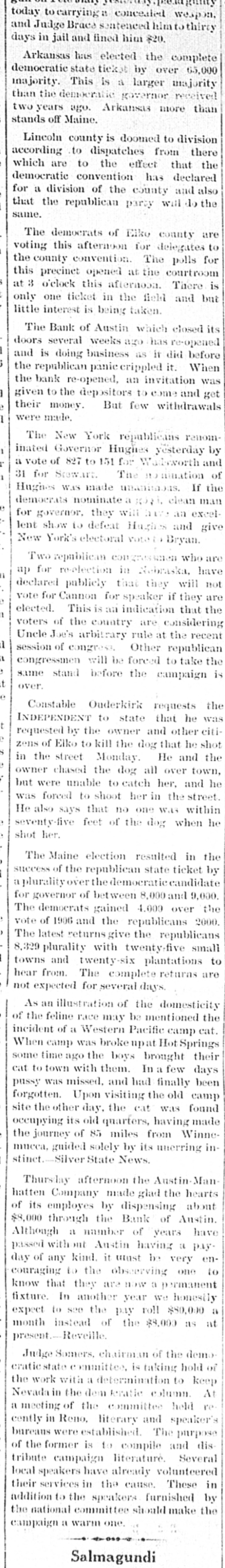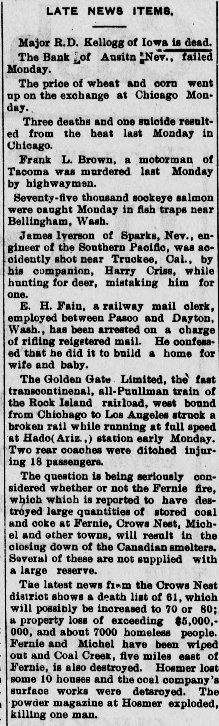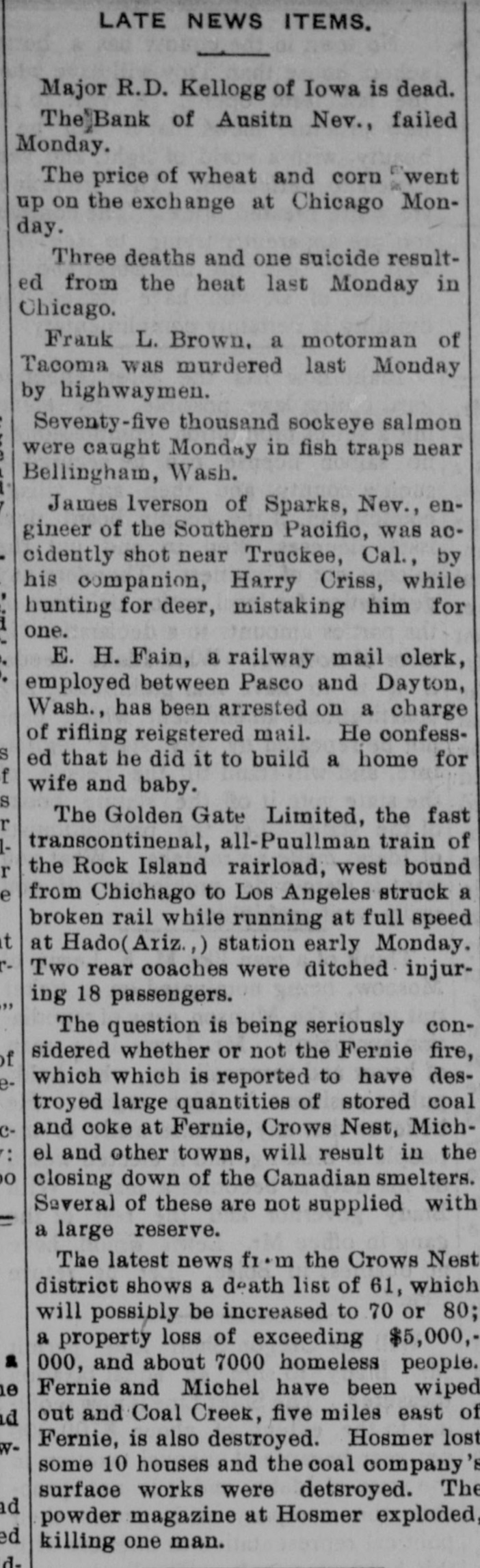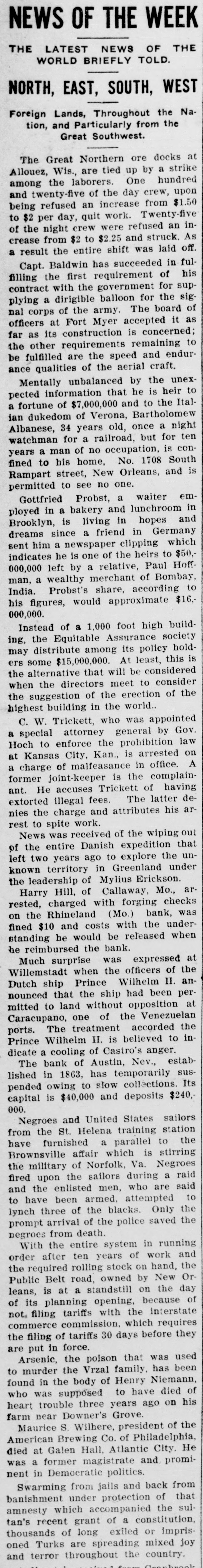 Ruunoo Three German military balloonists who landed near Warsaw were arrested by the Russian authorities. Count Zeppelin's monster dirigible balloon blew up and was ruined at Echterdingen, where it was being repaired after nearly completing a wonderful flight from Friedrichshafen to Mayence and return. About 12,000 mechanics of the Canadian Pacific railway went on strike, every shop in the system being closed. The hacked legs and mutilated torso of a boy were found in Chicago and the police believe the case one of atrocious murder. William F. Downing, a member of the old Stiles-Alvord band of outlaws who operated in southern Arizona, was killed in his saloon at Wilcox, by Arizona Ranger William Speed. The crack rifle team of the National Guard of Hawaii sailed on the steamer Alameda to participate in the national rifle competition at Camp Ferry, O. A farmer of North Mianus, Conn., tried to fly with paper wings and was nearly drowned. Fire in Midway, Ky., destroyed four great bonded whisky warehouses and damaged two others. The loss was $200,000. R. J. Hume, wife and child of Eau Claire, Wis., were drowned in Lake Nebagamon, Wis., while attempting to cross the lake in a duckboat. The suspension of the firm of Eastman & Co., stock brokers, was announced on the floor of the consolidated stock exchange in New York. Capt. A. H. Guthrie of the schooner Frank A. Williams of New York committed suicide by jumping overboard eight miles northwest of Cape Look"no Philadelphia aldermen defeated Milwaukee city fathers in a game of baseball for charity. Said Pasha, the grand vizier, and the newly-formed Turkish ministry resigned and the sultan invited Jemalledin Effendi, the Sheik-ul-Islam, and Kiamil Pasha to form a new cabinet. It was reported that the sultan was stabbed in the breast by a minor palace official, but that his vest of mail turned the point of the weapon. Charles W. Westerfeld, an assistant bookkeeper of the Produce Exchange bank of New York, committed suicide by shooting in the book room of the bank just as two worthless checks, bearing his signature, were presented at the paying teller's window. Several persons were killed and much damage done to property by a violent earthquake at Constantine, Algeria. Representatives of most of the leading Italian societies of New York, many of them Italian bankers and importers, met to organize a society for the suppression of violence, particularly by members of the Black Hand. The International Brotherhood of Teamsters rejected the overtures of the United Teamsters of America to amalgamate the two organizations. After 11 months of litigation, the insurance companies have been defeated in their attempts to resist payment of the insurance claims resulting from the damage caused by the fire of January 14, 1907, when Kingston, Jamaica, was visited by a severe earthquake. Ten thousand members of the uniform rank, Knights of Pythias, paradBoston up pe Archie and Bert McMaster and their wives, of Chicago, were drowned at Galena, Ill., while bathing. The steel fireboat Illinois was crushed and sunk by the falling wall of a burned elevator in Chicago. Lightning during a severe storm at Grand Rapids, Mich., caused a score of destructive fires. United States District Attorney Baker of Washington, his bride and several friends plunged over a 300foot precipice in an automobile near Liberty, N. Y., but escaped with their lives. The Bank of Austin, Nev., one of the oldest in that city, has closed its . doors. Later advices from the fire-swept region around Fernie, B. C., placed the probable number of deaths at 200 or more and the property losses at over $10,000,000. The refugees were reported in great need of food and relief trains started from many cities. Fire in Chicago destroyed Armour elevators, Burlington freight sheds and cars and other property, the loss being nearly $2,000,000. Many firemen were injured. One life was lost and much property destroyed in a cloudburst at Verdi, Nev. James Ryan, one of the most noted pickpockets of the country, was killed by a tram car at Pratt City, Ala. At least 100 lives were lost, the towns of Fernie, Coal Creek, Hosmer and Michel, B. C., wiped out, three other towns partially destroyed, and property loss of $10,000,000 sustained as the result of bush fires which raged in the Crow's Nest district of the