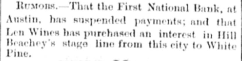 RUMONS. - That the First National Bank, at Austin. has suspended payments; and that Len Wines has purchased an interest in Hill Beachey's stage line from this city to White Pine.