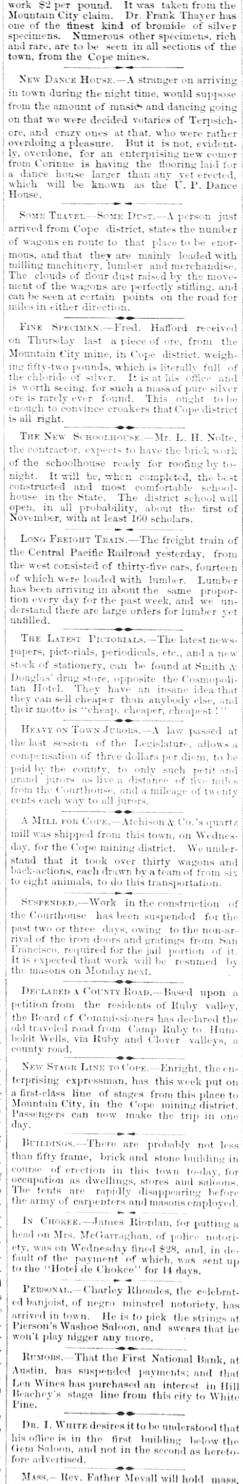 It was taken from the work $2 per City pound. claim. kind Dr. of Frank bromide Thayer of silver has Mountain finest rich one of the Numerous other specimens. of the and specimens. rare, are to be seen in all sections town, from the Cope mines. NEW DANCE HOUSE. stranger on arriving town during the night time, would suppose going in the amount of music and dancing from that we were decided votaries of Terpsich- rather on and crazy ones at that. who were evidentore. pleasure. But it is not, comer overdoing a for an enterprising new laid for ly. overdone, Corinne is having the flooring erected, from house larger than any vet Dance House. a which dance will be known as the U. P. TRAVEL SOME Dest.- person just arrived SOME from Cope district, states the be number enoren route to that place to with of wagons and that they are mainly merchandise. loaded mous, machinery, lumber and the movemilling of flour dust raised by and The clouds the wagons are perfectly stifling. road for ment can be of seen at certain points on the miles in either direction. FINE SPECIMEN Fred. Hafford received the Thursday last a piece of ore. from Mountain on City mine, in Cope district, full weigh- of pounds. which is literally office and ing fifty-two chloride of silver. It is at his silver the is for such a mass of pure to be worth rarely seeing ever found. This ought district is all right. enough ore is to convince croakers that Cope THE NEW SCHOOLHOUSE Mr. L. H. Nolte. work expects to have the brick schoolhouse ready for of the the contractor. completed, roofing the by best toIt will be, when schoolnight. and most comfortable school will constructed State. The district of house in in the all probability. about the first open. November, with at least 160 scholars. LONG FREIGHT TRAIN.-The freight train from of Central Pacific Railroad yesterday, the west consisted of thirty-five cars, fourteen Lumber the which were loaded with lumber. of been arriving in about the same propor- we unhas day for the past week, and yet unfilled. tion derstand every there are large orders for lumber THE LATEST PICTORIALS. The latest newspictorials, periodicals, etc., and Smith a new & stock papers, of stationery. can be found at drug store, opposite the Cosmopoli- idea that Douglas' Hotel. They have an insane else, and tan sell cheaper than anybody their they can motto is "cheap. cheaper. cheapest! HEAVY ON TOWN JUBORS. A law passed at last session of the Legislature, allows be compensation the of three dollars per diem, to by the county. to only such petit and miles paid as live a distance of five twenty grand from the jurors Courthouse and a mileage of cents each way to all jurors. .. A MILL FOR COPE. Atchison & Co.'s qquartz mill was shipped from this town, on Weunder- Wednesday, for the Cope mining district. and that it took over thirty wagons from six back-actions. stand each drawn by a team of to eight animals, to do this transportation SCHPENDED.-Work in the construction of the Courthouse has been suspended for the two or three days, owing to the from non-ar- San past of the iron doors and gratings of it. rival required for the jail portion by Francisco It is expected that work will be resumed the masons on Monday next. DECLARED A COUNTY ROAD.-Based upon a petition from the residents of Ruby valley, the Board of Commissioners has declared Humthe traveled road from Camp Ruby to a old boldt Wells, via Ruby and Clover valleys, county road. NEW STAGE LINE TO COPE Enright, the enterprising expressman, has this week put on to first-class line of stages from this place district Mountain a City, in the Cope mining in one day. Passengers can now make the trip BCILDINGS.-There are probably not less fifty frame, brick and stone building for in than of erection in this town to-day. saloons course as dwellings, stores and before occupation tents are rapidly disappearing The the army of carpenters and masons employed. IN CHOKEE. James Riordan, for putting a head on Mrs. McGarraghan of police notoriwas on Wednesday fined $28, and, in deety. fault of the payment of which. was sent up to the Hotel de Chokee" for 14 days. PERSONAL Charley Rhoades, the celebrated banjoist. of negro minstrel motoriety, has arrived in town. He is to pick the strings be at Pierson's Washoe Saloon. and swears that won't play nigger any more. RUMONS. That the First National Bank, at Austin. has suspended payments; and that Wines has purchased an interest in White Hill Pine. Beachey's Len stage line from this city to DR. I. WHITE desires it to be understood that office is in the first building below hereto the Gem his Saloon. and not in the second as fore advertised MARR.- Rev. Father Mevall will hold
