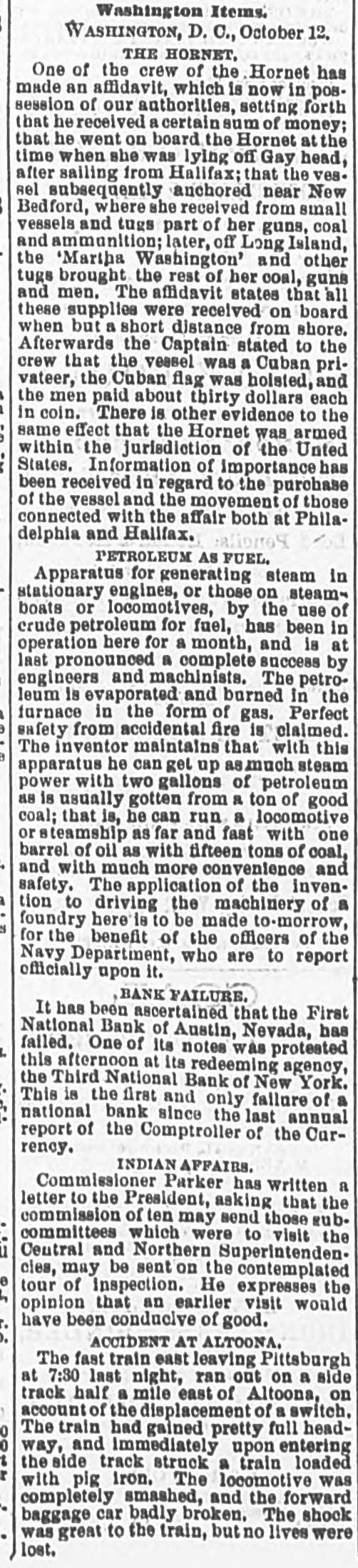 Washington Items: WASHINGTON, D. C., October 12. THE HORNET, One of the crew of the Hornet has made an affidavit, which is now in possession of our authorities, setting forth that he received a certain sum of money; that he went on board the Hornet at the time when she was lying off Gay head, after sailing from Halifax; that the ves. ael subsequently anchored near New Bedford, where she received from small vessels and tugs part of her guns, coal and ammunition; later, off Long Island, the 'Martha Washington' and other tugs brought the rest of her coal, guns and men. The affidavit states that all these supplies were received on board when but a short distance from shore. Afterwards the Captain stated to the crew that the vessel was a Cuban privateer, the Cuban flag was holsted, and the men paid about thirty dollars each in coin. There is other evidence to the same effect that the Hornet was armed within the jurisdiction of the Unted States. Information of importance has been received in regard to the purchase of the vessel and the movement of those connected with the affair both at Philadelphia and Hallfax. PETROLEUM AS FUEL. Apparatus for generating steam in stationary engines, or those on steamboats or locomotives, by the use of crude petroleum for fuel, has been in operation here for a month, and is at last pronounced a complete success by engineers and machinists. The petroleum is evaporated and burned in the furnace in the form of gas. Perfect safety from accidental fire is claimed. The inventor maintains that with this apparatus he can gel up as much steam power with two gallons of petroleum as is usually gotten from a ton of good coal; that is, he can run a locomotive or steamship as far and fast with one barrel of oil as with fifteen tons of coal, and with much more convenience and safety. The application of the invention to driving the machinery of a foundry here is to be made to-morrow, for the benefit of the officers of the Navy Department, who are to report officially upon it. BANK FAILURE. It has been ascertained that the First National Bank of Austin, Nevada, has failed. One of its notes was protested this afternoon at its redeeming agency, the Third National Bank of New York. This is the first and only failure of a national bank since the last annual report of the Comptroller of the Currency. INDIAN AFFAIRS. Commissioner Parker has written a letter to the President, asking that the commission of ten may send those sub. committees which were to visit the Central and Northern Superintenden. cies, may be sent on the contemplated e tour of inspection. He expresses the opinion that an earlier visit would have been conducive of good. ACCIDENT AT ALTOONA. The fast train east leaving Pittsburgh at 7:30 last night, ran out on a side track half a mile east of Altoona, on account of the displacement of a switch. 0 The train had gained pretty full head0 way, and immediately upon entering the side track struck a train loaded with pig iron. The locomotive was completely smashed, and the forward baggage car badly broken. The shock was great to the train, but no lives were lost.
