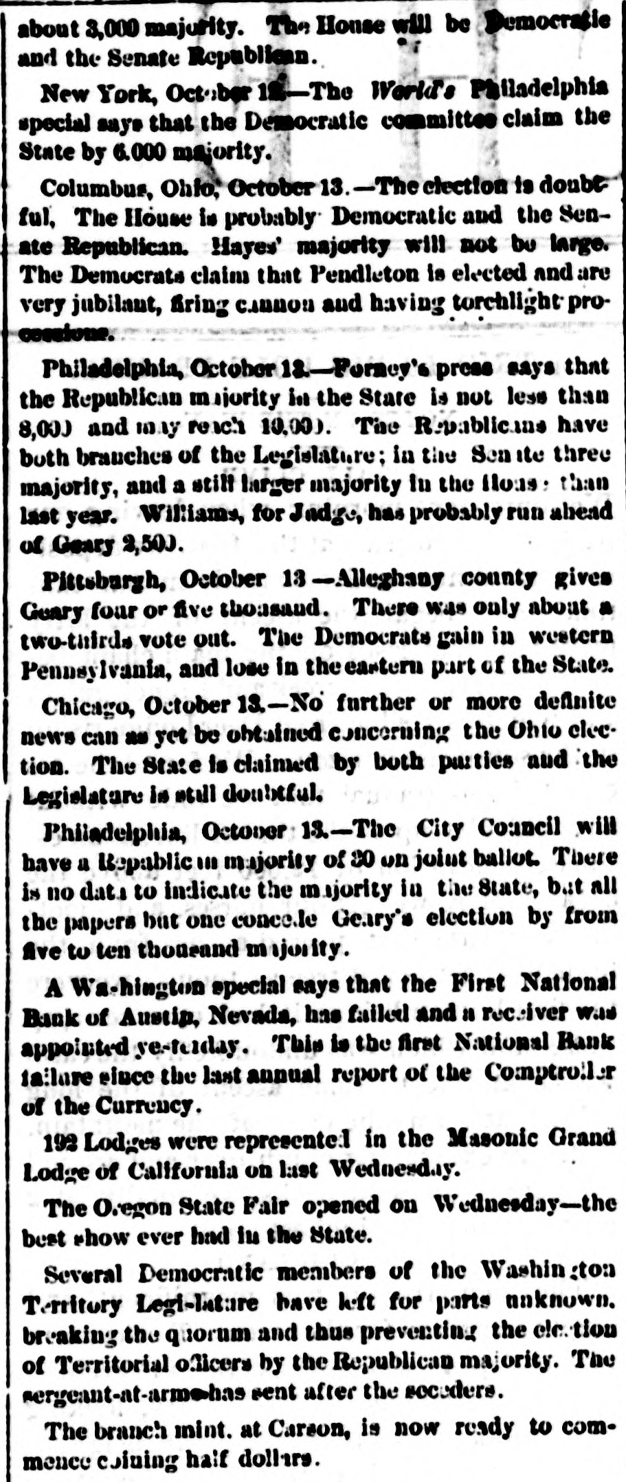 about 3,000 majurity. The House will be Democratic and the Senate Republican. New York, October 12-The World's Philadelphia special saye that the Democratic committee claim the State by 6.000 majority. Columbus, Ohio, October 13. -The election is doube ful, The House is probably Democratic and the Senate Republican. Hayes' majority will not bu large. The Democrats claim that Pendleton is elected and are very jubilaut, firing cannon and having torchlight processions. Philadelphia, October 12-Formey's press says that the Republican majority in the State is not less than 8,000 and may reach 10.00). The Repablicing have both brauches of the Legislature; in the Senite three majority, and a still larger majority In the Hous: than last year. Williams, for Judge, has probably run ahead of Geary 2,500. Pittsburgh, October 13 -Alleghany county gives Guary four or five thousand. There was only about a two-thirds vote out. The Democrats gain in western Pennsylvania, and lose in the eartern part of the State. Chicago, October 13.-No further or more definite news can as yet be ohtained concerning the Ohio election. The State is claimed by both parties and the Legislature is still doubtful. Philadelphia, October 13.-The City Council will have a Repablic ⑉ majority of 30 on joint ballot. There is no date to indicate the majority in the State, but all the papers but one conceile Genry's election by from five to ten thousand majority. A Wa-hington special says that the First National Bank of Austin, Nevada, has failed and so receiver will appointed re-tuday. This is the first National Bank tailure eiuce the last annual report of the Comptroll.r of the Currency. 192 Lodges were represented in the Masonic Grand Lodge of California on last Wednesday. The Oregon State Fair opened on Wednesday-the best show ever had in the State. Several Democratic members of the Washington Territory Legi-lature have h.ft for parts unknown. breaking the quorum and thus preventing the etc. tion of Territorial officers hy the Republican majority. The mergeant-at-arme-has sent after the seceders. The branch mint. at Carson, is now ready to commence coining half dollars.