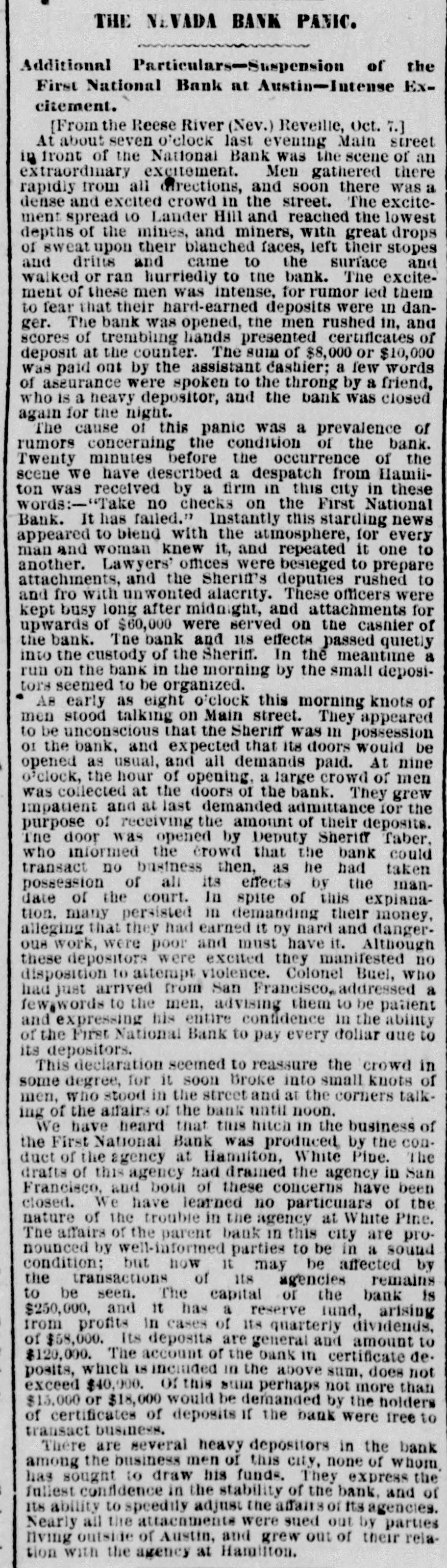 DANI e Additional Particulars-Suepension of the First National Bank at Austin-Iutense Excitement. [From the Reese River (Nev.) Reveille, Oct. 7.] At about seven o'clock last evening Main street in front of the National Bank was the scene of an extraordinary excitement. Men gathered there rapidly from all directions, and soon there was a dense and excited crowd in the street. The excitement spread 10 Lander Hill and reached the lowest depths of the mines, and miners, with great drops of sweat upon their blanched faces, left their stopes and drins and came to the surface and walked or ran hurriedly to the bank. The excitement of these men was intense, for rumor led them to fear that their hard-earned deposits were in danger. The bank was opened, the men rushed in, and scores of trembling hands presented certificates of deposit at the counter. The sum of $8,000 or $10,000 was paid out by the assistant cashier; a few words of aseurance were spoken to the throng by a friend, who is a heavy depositor, and the bank was closed again for the night. The cause of this panic was a prevalence of rumors concerning the condition of the bank. Twenty minutes before the occurrence of the scene we have described a despatch from Hamiiton was received by a firm in this city in these words:-"Take no checks on the First National Bank. It has failed." Instantly this starting news appeared to blend with the atmosphere, for every man and woman knew it, and repeated it one to another. Lawyers' offices were besieged to prepare attachments, and the Sheriff's deputies rushed to and fro with unwonted alacrity. These officers were kept busy long after midnight, and attachments for upwards of $60,000 were served on the cashier of the bank. The bank and us effects passed quietly into the custody of the Sheriff. In the meantime a run on the bank in the morning by the small depositors seemed to be organized. A8 early as eight o'clock this morning knots of men stood talking on Main street. They appeared to be unconscious that the Sheriff was in possession 01 the bank. and expected that its doors would be opened as usual, and all demands paid. At nine o'clock, the hour of opening. a large crowd of men was collected at the doors of the bank. They grew impatient and at last demanded admittance for the purpose of receiving the amount of their deposits. The door was opened by Deputy Sheriff Taber, who informed the crowd that the bank could transact no business then, as he had taken possession of all its effects by the mandate of the court. In spite of this expianation. many persisted in demanding their money, alleging that they had earned it by nard and dangeroue work, were poor and must have it. Although these depositors were excited they manifested no disposition to attempt violence. Colonel Buel, who had just arrived from San Francisco, addressed a fewawords to the men, advising them to be patient and expressing his entire confidence in the ability of the First National Bank to pay every dollar que to its depositors. This declaration seemed to reassure the crowd in some degree, for it soon Broke into small knots of men, who stood in the street and at the corners talking of the alfairs of the bank until noon. We have heard that this nitch in the business of the First National Bank was produced by the conduet of the agency at Hamilton, White Pine. The drafts of this agency had dramed the agency in San Francisco, and both of these concerns have been closed. We have learned no particulars of the nature of the trouble in the agency at White Pine. The affairs of the parent bank in this city are pronounced by well-informed parties to be in a sound condition; but now it may be affected by the transactions of its agencies remains to be seen. The capital or the bank is $250,000, and it has a reserve fund, arising from profits in cases of its quarterly dividends, of $68,000. Its deposits are general and amount to $120,000. The account of the bank in certificate de. posits, which is included in the above sum, does not exceed $40,000. or this sum perhaps not more than $13,000 or $18,000 would be demanded by the holders of certificates of deposits If the bank were free to transact business. There are several heavy depositors in the bank among the business men of this city, none of whom has sought to draw his funds. They express the fullest confidence in the stability of the bank. and of its ability to speedily adjust the affairs of its agencies. Nearly all the attachments were sued out by parties living outside of Austin, and grew out of their relation with the agency at Hamilton.