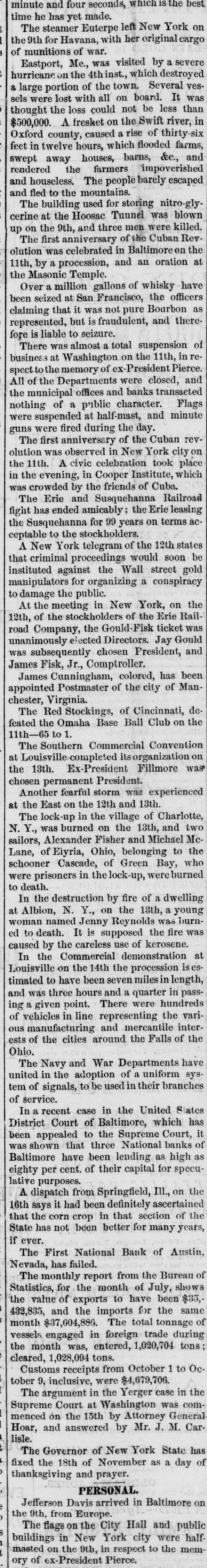 minute and four seconds, which IS the best time he has yet made. The steamer Euterpe left New York on the 9th for Havana, with her original cargo of munitions of war. Eastport, Me., was visited by a severe hurricane on the 4thinst., which destroyed large portion of the town. Several yesa sels were lost with all on board. It than was thought the loss could not be less $500,000. A freshet on the Swift river, in Oxford county, caused a rise of thirty-six farms, feet in twelve hours, which flooded and swept away houses, barns, &c., rendered the farmers impoverished and houseless. The people barely escaped and fled to the mountains. The building used for storing nitro-gly cerine at the Hoosac Tunnel was blown up on the 9th, and three men were killed. RevThe first anniversary of the Cuban the olution was celebrated in Baltimore on 11th, by a procession, and an oration at the Masonic Temple. Over a million gallons of whisky officers have seized at San Francisco, the as claiming been that it was not pure Bourbon thererepresented, but is fraudulent, and fore is liable to seizure. There was almost a total suspension of business at Washington.on the 11th, Pierce. in respect t the memory of ex-President and All of the Departments were closed, the municipal offices and banks transacted Flags nothing of a public character. suspended at half-mast, and minute were fired during guns were The the day. first anniversary of the Cuban revwas observed in New York city on A civic celebration the evening, in Cooper olution in the 11th. Institute, took which place by the friends and Susquehanna Railroad was The crowded Erie of Erie Cuba. fight has ended amicably; the terms leasing acthe Susquehanna for 99 years on ceptable to the stockholders. A New York telegram of the 12th states be criminal proceedings would soon instituted that against the Wall street gold manipulators for organizing a conspiracy to damage the public. At the meeting in New York, on Rail- the of the stockholders of the Erie 12th, road Company, the Gould-Fisk ticket Gould was unanimously elected Directors. Jay and was subsequently chosen President, James Fisk, Jr., Comptroller. James Cunningham, colored, has of Man- been appointed Postmaster of the city chester, Virginia. The Red Stockings, of Cincinnati, the defeated the Omaha Base Ball Club on 11th-65 1. Southern Commercial Convention The Louisville completed its organization was the at 13th. Ex-President Fillmore chosen permanent President. Another fearful storm was experienced the East on the 12th and 13th. at The lock-up in the village of Charlotte, two Y., was burned on the 13th, and McN. Alexander Fisher and Michael to the sailors, Lane, of Eiyria, Ohio, belonging who schooner Cascade, of Green were burned Bay, were prisoners in the lock-up, to death. In the destruction by fire of a dwelling Albion, N. Y., on the 13th, a young burnat woman named Jenny Reynolds was fire was ed to death. It is supposed the caused by the careless use of kerosene. In the Commercial demonstration is es- at Louisville on the 14th the procession timated to have been seven miles in in length, was three hours and a quarter hundreds passand ing given point. There were varivehicles a in line representing the interof manufacturing and mercantile of the ests ous of the cities around the Falls Ohio. The Navy and War Departments have sysin the adoption of a uniform united tem of signals, to be used in their branches of service. recent case in the United States has In a Court of Baltimore, which it District appealed to the Supreme Court, banks of been shown that three National as was Baltimore have been lending as high eighty per cent. of their capital for speculative purposes. A dispatch from Springfield, ascertained Ill., on the says it had been definitely of the 16th the corn crop in that section years, State that has not been better for many if ever. The First National Bank of Austin, Nevada, has failed. The monthly report from the Bureau shows of for the month of July, $35, Statistics, value of exports to have been same the and the imports for the of 432,835, $37,604,886. The total tonnage during month engaged in foreign trade tons vessels the month was, entered, 1,020,704 cleared, 1,028,094 tons. OcCustoms receipts from October 1 to tober 9, inclusive, were $4,679,706. The argument in the Yerger case in com- the Court at Washington was General Supreme the 15th by Attorney Carmenced Hoar, and on answered by Mr. J. M. lisle. The Governor of New York State has of fixed the 18th of November as a day thanksgiving and prayer. PERSONAL. Jefferson Davis arrived in Baltimore on the 9th, from Europe. The flags on the City Hall and public halfin New York city were the memmasted buildings on the 9th, in respect to ory of ex-President Pierce.