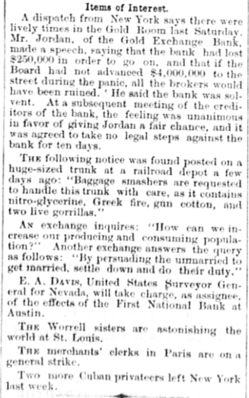 Items of Interest. A dispatch from New York says there were lively times in the Gold Room last Saturday Mr. Jordan, of the Gold Exchange Bank, made a speech, saying that the bank had lost $250,000 in order to go on. and that if the Board had not advanced $4,000,000 to the street during the panic, all the brokers would have been ruined. 'He said the bank was solvent. At a subsequent meeting of the crediitors of the bank, the feeling was unanimous in favor of giving Jordan A fair chance, and it was agreed to take no legal steps against the bank for ten days. THE following notice was found posted on a huge-sized trunk at a railroad depot a few days ago: "Baggage smashers are requested to handle this trunk with care, as it contains nitro-glycerine, Greek fire, gun cotton, and two live gorrillas." AN exchange inquires: "How can we increase our producing and consuming population?" Another exchange answers the query as follows: "By persuading the unnarried to get married. settle down and do their duty. E. A. DAVIS, United States Surveyor General for Nevada, will take charge. as assignee, of the effects of the First National Bank at Austin THE Worrell sisters are astonishing the world at St. Louis, THE merchants' clerks in Paris are on a general strike. Two more Cuban privateers left New York last week.