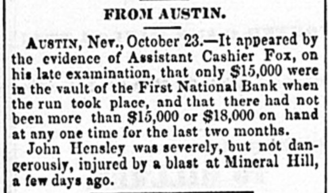 FROM AUSTIN. AUSTIN, Nev., October 23.-It appeared by the evidence of Assistant Cashier Fox, on his late examination, that only $15,000 were in the vault of the First National Bank when the run took place, and that there had not been more than $15,000 or $18,000 on hand at any one time for the last two months. John Hensley was severely, but not dangerously, injured by a blast at Mineral Hill, a few days ago.
