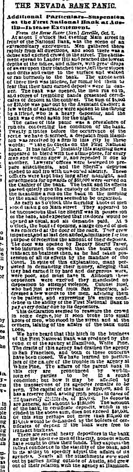 THE NEVADA BANK PANIC Additional Paritculars-Stspension 01 the First National Bank at AdsUD-ILIOLSE Excitement. From the Reese Ricer (Net.) Becrille, Oct. 7. T o'clock last evening Main street in front of the National Bank, was the scene of an extraordicary excitement. Men gathered there rapioly from all directions, and soon there was dense and esctted crowd in the street. delcitement *pread to Lander Hill and reacted the lowest depths of the miler, and miners, with grea" drops of aw upon their planched races, stopes and drinks and came to the surface and walted or rau burneuly to the bank. The excitement of these men was intense, for ramor led them to fear that their bard earned deposit were in danper. The babk was opened, the men rus ed 1D, and scores of trembling hands presented certificales of deposit as the counter. The sum or $5,000 or $10,000 was paid out by the Assistant Casaler: a few words of assurance were spoten to the throng by a friend, who is a heavy depositor, and the bank was c osed awain for the night The cause or this panic was a prevalence of run ors COLCELLING the condition of the bank. Twelty nipties before the occurrence of the sceze we have discribed, a despaten from Hamiltoo >as received by a Dra in this city 10 these words: "Tate Lu check+ on the First National Bank. It has talled. Instantly this starthing Dews appeared to blend with tue afinorphere. for every man and WOCKD snew 11, ADD repeated It one to autother. Lawrers' offices were besteged to prepare attachments, and the Sheriff's deportes rushed to and Iro with comon'ed alacrity. Taewa officers were kept busy long after and attachments for upwards of $60,009 were versed on the Cashier of the bank. The bank and 129 effects passed quietly 1010 the custody of the Sherm In the a run on the DADE in the morning DT the small depositors seemed to be organized At early as So'clock this knote of men blood taking on Math street They appeared to lie that the Sperifi was in posses-ion 01 the babb, underpected that 11%-doors would be opened as usual, and all demands paid. AS 3 o'clock, the hour of opening, large crowil of men ASS collected at the door of the pank. Ther grew o impatient, at last den anded suimittance for the purpose of receiving the amount of their deposits. The door was opened by Deputy Sherid Tater, who informed the crowd that the bank could le transac no business then, as be had taken pos8 session of all ILE effects by the mandate or the 11 Court. In spite of this explanation, many perstated to demanding their money, alleging that they bad earned It by hard and dargerous work, or were poor, and must have It Although these depositors were excired they manifested no disposition to attempt violence. Colonel Buel, who had just arrived from San Pracisco, addressed a few words to the men. advising them 10 be patient, and expression his entire conndence ID the ability of the First National Bank to pay every dollar que to its depositors. This declaration seemed to reasore the crowd in some degree, for It ROOD broke into small by knots of men, who stood in the Birees and at the st. orders, talking of the affairs of the bank until LOON, les We have heard that this hich in the business be of the First National Bank was prodaced by the codd et of the agency at flamilton, Write Proe. he The draits of this agency had drained the agency ID San Francisco, and both 01 these concerns have been closed. We have learned no partienlars of the cause of the trouble in the acency at White Pine. The affairs of the parent back in this city are pronounced by we'l-injoined parties to be in a sound :cobdition: but how It may be affected by ca the transactions of Its agencies remaine to be to seen. The capital of the bank la $250,000, and it bas a reserve fund. arising from profit in cases of " quariety disidends of It. deposits in are general, and amount 3 $120,600 The account nd of the back, In cerpicate deposits, which is 10pie cluded in the above aud. does not exceed $40,000. An or this sum perhaps not more than $15,000 or ug $15,000 would Le decanded by the holders of cerplicates of deposit If the bank were free to ya, transact business Dg em There are several heavy depositors in the bank Ms an ODR the LO-11 est men of this city, DODEOI whom its hate cought to draw their funds. They express the tuliest confidence in the statility of the back, and in its ability to speedity adjust the adairs of us magendes Nearly all the attachments were aued 22out by parties living outside of Austin, and grew as out of their relation with the agency at Ilamiton. in In