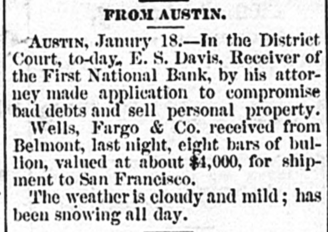 FROM AUSTIN. AUSTIN, Janury 18.-In the District Court, to-day. E. S. Davis, Receiver of the First National Bank, by his attorney made application to compromise bad debts and sell personal property. Wells, Fargo & Co. received from Belmont, last night, eight bars of bullion, valued at about $4,000, for shipment to San Francisco. The weather is cloudy and mild ; has been snowing all day.
