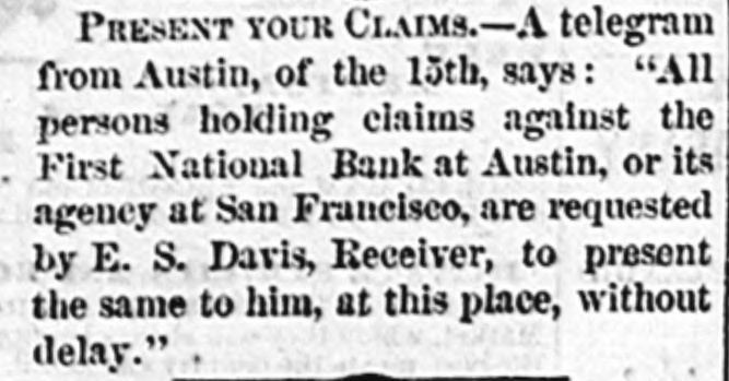 PRESENT YOUR CLAIMS.-A telegram from Austin, of the 15th, says: "All persons holding claims against the First National Bank at Austin, or its agency at San Francisco, are requested by E. S. Davis, Receiver, to present the same to him, at this place, without delay."