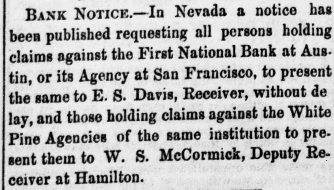 BANK NOTICE.-In Nevada a notice has been published requesting all persons holding claims against the First National Bank at Aus. tin, or its Agency at San Francisco, to present the same to E. S. Davis, Receiver, without de lay, and those holding claims against the White Pine Agencies of the same institution to present them to W. S. McCormick, Deputy Re. ceiver at Hamilton.