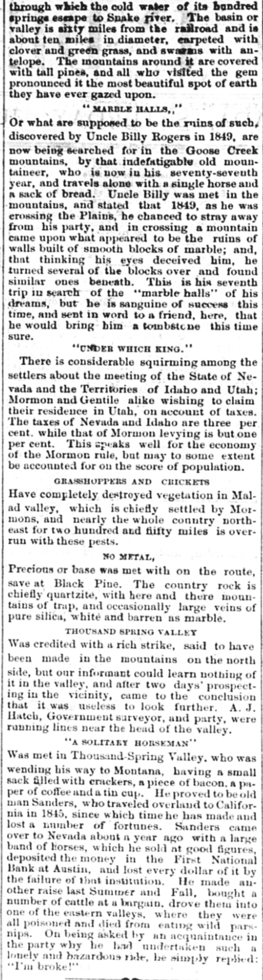 through which the cold water of its hundred springe escape to Snake river. The basin or valley is sixty miles from the railroad and is about ten miles in diameter, carpeted with clover and green grass, and swarms with antelope. The mountains around it are covered with tall pines, and all who visited the gem pronounced it the most beautiful spot of earth they have ever gazed upon. 'MARBLE HALLS,," Or what are supposed to be the ruins of such, discovered by Uncle Billy Rogers in 1849, are now being searched for in the Goose Creek mountains, by that indefatigable old mountaineer, who is now in his seventy-seventh year, and travels alone with a single horse and a sack of bread. Uncle Billy was met in the mountains, and stated that 1849, as he was erossing the Plains, he chanced to stray away from his party, and in crossing a mountain came upon what appeared to be the ruins of walls built of smooth blocks of marble; and, that thinking his eyes deceived him, he turned several of the blocks over and found similar ones beneath. This is his seventh trip in search of the "marble halls" of his dreams, but he is sanguine of success this time, and sent in word to a friend, here, that he would bring him a tombstone this time sure. "UNDER WHICH KING. " There is considerable squirming among the settlers about the meeting of the State of Nevada and the Territories of Idaho and Utah; Mormon and Gentile alike wishing to claim their residence in Utah, on account of taxes. The taxes of Nevada and Idaho are three per cent. while that of Mormon levying is but one per cent. This speaks well for the economy of the Mormon rule, but may to some extent be accounted for on the score of population. GRASSHOPPERS AND CRICKETS Have completely destroyed vegetation in Malad valley, which is chiefly settled by Mormons, and nearly the whole country northeast for two hundred and fifty miles is overrun with these pests. NO METAL, Precious or base WAS met with on the route, save at Black Pine. The country rock is chiefly quartzite, with here and there mountains of trap, and occasionally large veins of pure silica, white and barren as marble. THOUSAND SPRING VALLEY Was credited with a rich strike, said to have been made in the mountains on the north side, but our informant could learn nothing of it in the valley, and after two days' prospecting in the vicinity, came to the conclusion that it was useless to look further. A. J. Hatch, Government surveyor, and party, were running lines near the head of the valley. "A SOLITARY HORSEMAN' Was met in Thousand-Spring Valley. who was wending his way to Montana, having a small sack filled with crackers, a piece of bacon. a paper of coffee and a tin cup. He proved to be old man Sanders, who traveled overland to California in 1845. since which time he has made and lost a number of fortunes. Sanders came over to Nevada about a year ago with a large band of horses, which he sold at good figures, in the First National at dollar of it deposited Bank Austin, the money and lost every by the failure of that institution. He made another raise last Summer and Fall, bought a number of cattle at a bargain. drove them into one of the eastern valleys, where they were all poisoned and died from eating wild parsnips. On being asked by an acquaintance in the party why he had undertaken such a lonely and hazardous ride, be simply replied: I'm broke!"