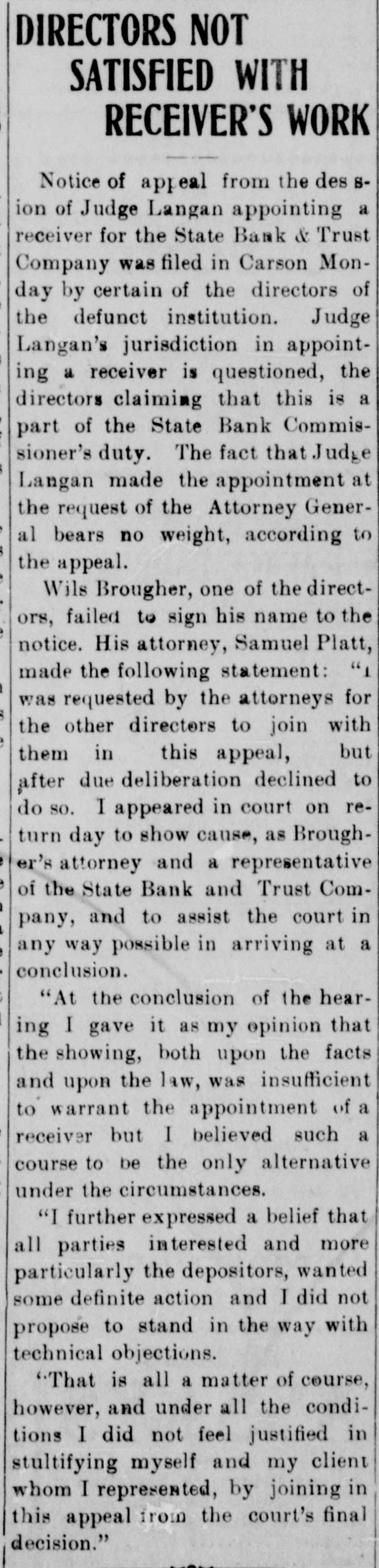 DIRECTORS NOT SATISFIED WITH RECEIVER'S WORK Notice of appeal from the des Sion of Judge Langan appointing a receiver for the State Bank & Trust Company was filed in Carson Monday by certain of the directors of the defunct institution. Judge Langan's jurisdiction in appointing a receiver is questioned, the directors claiming that this is a part of the State Bank Commissioner's duty. The fact that Judge Langan made the appointment at the request of the Attorney General bears no weight, according to the appeal. Wils Brougher, one of the directors, failed to sign his name to the notice. His attorney, Samuel Platt, made the following statement: "I was requested by the attorneys for the other directors to join with them in this appeal, but after due deliberation declined to do so. I appeared in court on return day to show cause, as Brougher's attorney and a representative of the State Bank and Trust Company, and to assist the court in any way possible in arriving at a conclusion. "At the conclusion of the hearing I gave it as my opinion that the showing, both upon the facts and upon the law, was insufficient to warrant the appointment of a receiver but I believed such a course to be the only alternative under the circumstances. "I further expressed a belief that all parties interested and more particularly the depositors, wanted some definite action and I did not propose to stand in the way with technical objections. "That is all a matter of course, however, and under all the conditions I did not feel justified in stultifying myself and my client whom I represented, by joining in this appeal from the court's final decision."