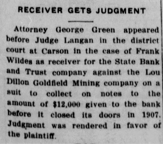 RECEIVER GETS JUDGMENT Attorney George Green appeared before Judge Langan in the district court at Carson in the case of Frank Wildes as receiver for the State Bank and Trust company against the Lou Dillon Goldfield Mining company on a suit to collect on notes to the amount of $12,000 given to the bank before It closed its doors in 1907. Judgment was rendered in favor of the plaintiff.