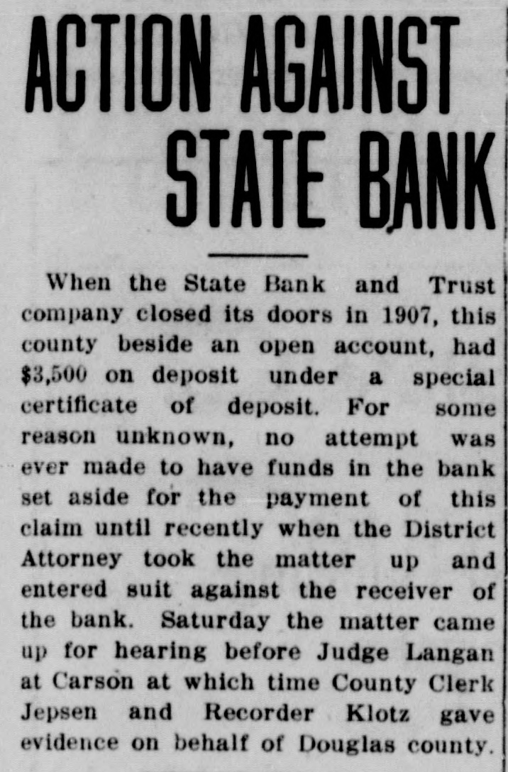 ACTION AGAINST STATE BANK When the State Bank and Trust company closed its doors in 1907, this county beside an open account, had $3,500 on deposit under a special certificate of deposit. For some reason unknown, no attempt was ever made to have funds in the bank set aside for the payment of this claim until recently when the District Attorney took the matter up and entered suit against the receiver of the bank. Saturday the matter came up for hearing before Judge Langan at Carson at which time County Clerk Jepsen and Recorder Klotz gave evidence on behalf of Douglas county.