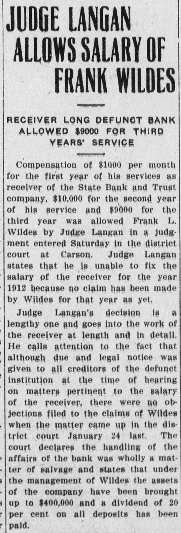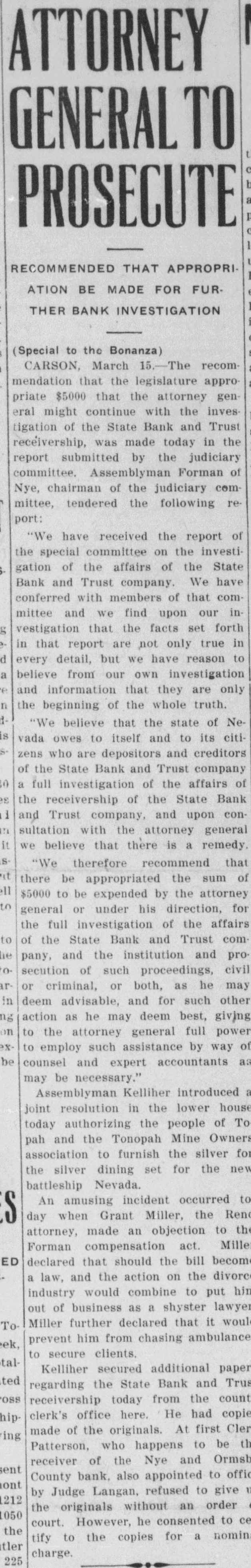 ATTORNEY GENERAL TO PROSECUTE RECOMMENDED THAT APPROPRIATION BE MADE FOR FUR. THER BANK INVESTIGATION (Special to the Bonanza) CARSON, March 15.-The recommendation that the legislature appropriate $5000 that the attorney general might continue with the invesof the State Bank and Trust tigation in the receivership, was made today report submitted by the judiciary committee. Assemblyman Forman of Nye, chairman of the judiciary committee, tendered the following report: "We have received the report of the special committee on the investigation of the affairs of the State Bank and Trust company. We have conferred with members of that committee and we find upon our ing vestigation that the facts set forth in that report are ,not only true in d every detail, but we have reason to a believe from our own investigation e and information that they are only n the beginning of the whole truth. d "We believe that the state of NeS vada owes to itself and to its citizens who are depositors and creditors of the State Bank and Trust company in a full investigation of the affairs of es the receivership of the State Bank 11 and Trust company, and upon conTA sultation with the attorney general it we believe that there is a remedy S "We therefore recommend that it of there be appropriated the sum ell $5000 to be expended by the attorney to general or under his direction, for the full investigation of the affairs to of the State Bank and Trust com lie pany, and the institution and pro o secution of such proceedings, civil ar or criminal, or both, as he may in deem advisable, and for such other ng action as he may deem best, giving on to the attorney general full power x to employ such assistance by way of be counsel and expert accountants a: may be necessary." " Assemblyman Kelliher introduced joint resolution in the lower house today authorizing the people of To pah and the Tonopah Mine Owners association to furnish the silver for the silver dining set for the new battleship Nevada. An amusing incident occurred to S day when Grant Miller, the Ren attorney, made an objection to th Forman compensation act. Mille ED declared that should the bill become a law, and the action on the divorce industry would combine to put hin out of business as a shyster lawyer ToMiller further declared that it woul ek, prevent him from chasing ambulance to secure clients. talKelliher secured additional paper ted regarding the State Bank and Trus oss receivership today from the count hipclerk's office here. He had copie ing made of the originals. At first Cler th Patterson, who happens to be receiver of the Nye and Ormsb sent ont County bank, also appointed to offic 1212 by Judge Langan, refused to give the originals without an order 1050 court. However, he consented to ce the tify to the copies for a nomin tler charge. 225