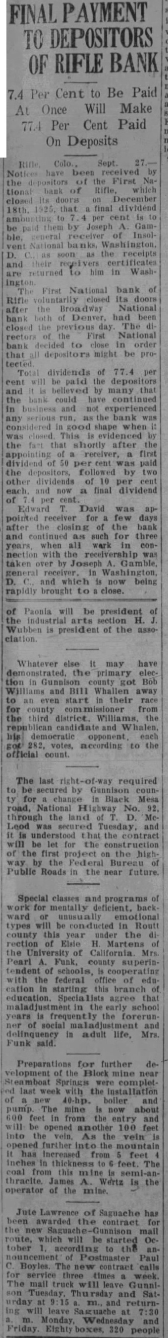 Rifle Colo., Sept. Notices have been received by the depositors of the First National bank of Rifle, which closed Its doors December 18th. 1925, that a final dividend amounting to 4 per cent is to be paid them by Joseph A. Gamble. general receiver of Insolvent National banks, Washington, D. as soon as the receipts and their receivers certificates are returned to him in WashFirst National bank of Rifle voluntarily closed its doors after the Broadway National bank both of Denver, had been closed the previous day The directors of the First National bank decided to close in order that all depositors might be proTotal dividends of 77.4 per cent will be paid the depositors and It is believed by many that the bank could have continued in business and not experienced any serious run. as the bank was considered in good shape when it was closed. This is evidenced by the fact that shortly after the appointing of a receiver, a first dividend of 50 per cent was paid the depositors, followed by two other dividends of 10 per cent each, and now a final dividend of 7.4 per cent. Edward T. David was appointed receiver for few days after closing of the bank and continued as such for three years, when all work in connection with the receivership was taken over by Joseph A. Gamble, general receiver. in Washington D. and which is now being rapidly brought to close. of Paonia will be president of the industrial arts section H. Wubben is president of the asso-