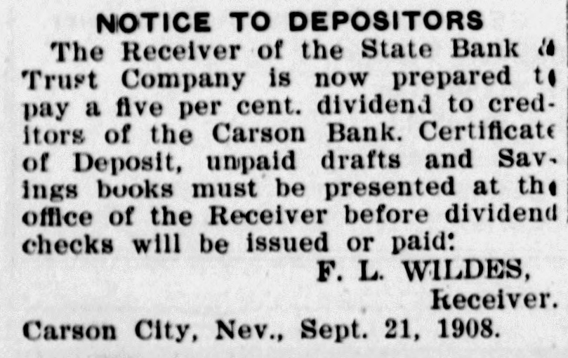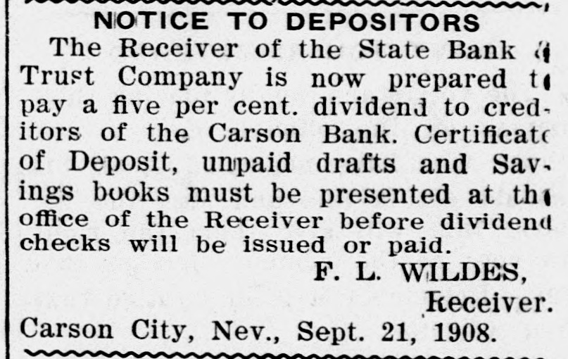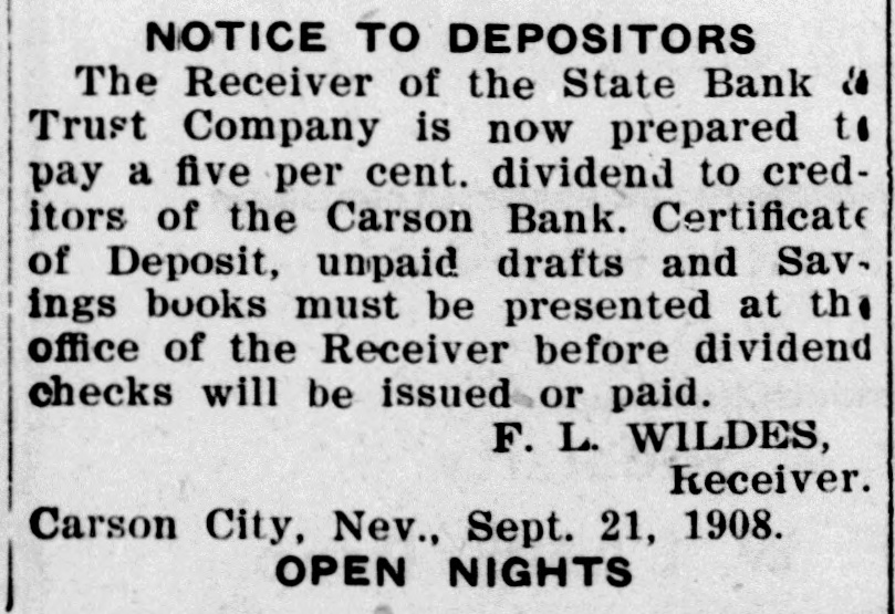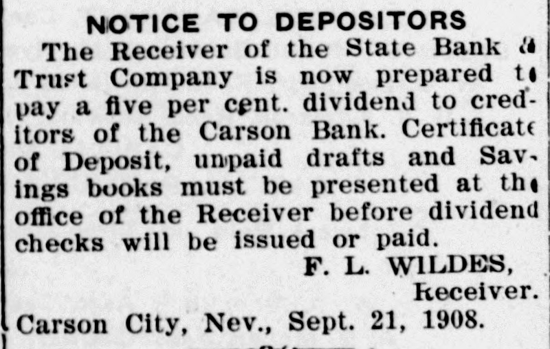 NOTICE TO DEPOSITORS The Receiver of the State Bank is Trust Company is now prepared to pay a five per cent. dividend to creditors of the Carson Bank. Certificate of Deposit, unpaid drafts and Savings books must be presented at the office of the Receiver before dividend checks will be issued or paid: F. L. WILDES, Receiver. Carson City, Nev., Sept. 21, 1908.