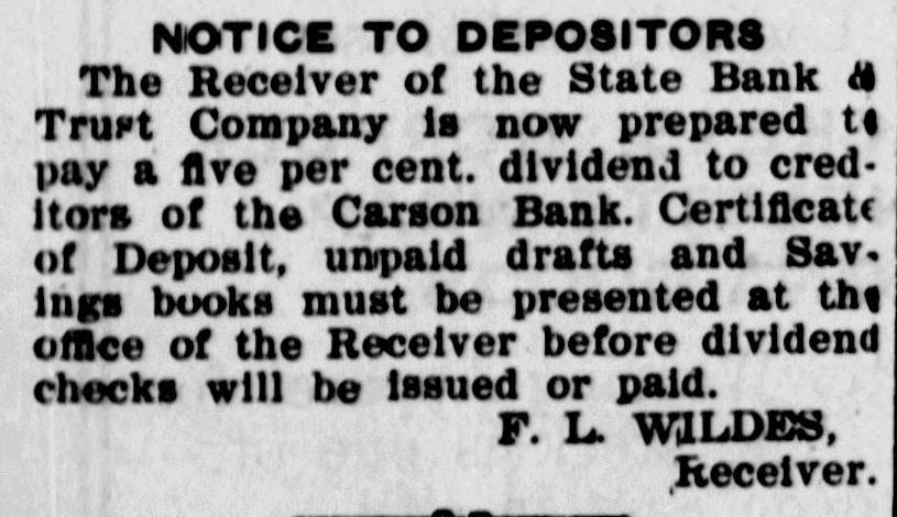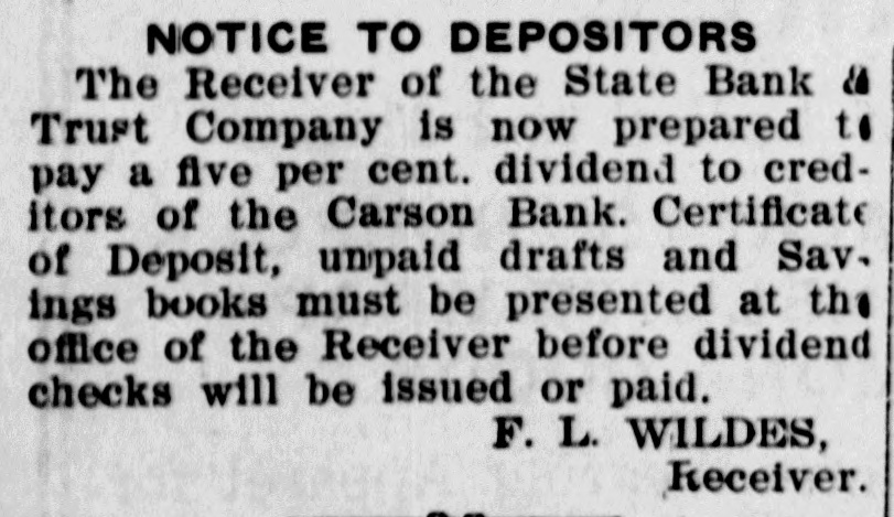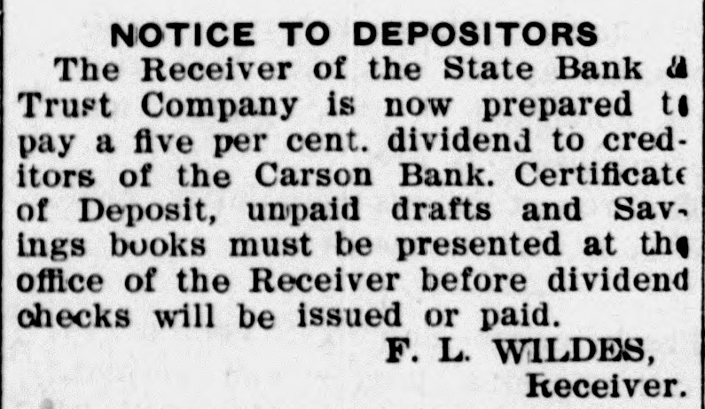 NOTICE TO DEPOSITORS The Receiver of the State Bank a Trust Company is now prepared to pay a five per cent. dividend to creditors of the Carson Bank. Certificate of Deposit, unpaid drafts and Savings books must be presented at the office of the Receiver before dividend checks will be issued or paid. F. L. WILDES, Receiver.