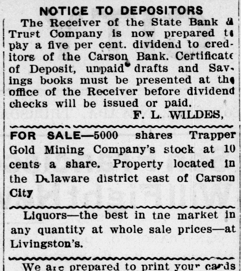 NOTICE TO DEPOSITORS The Receiver of the State Bank a Trust Company is now prepared to pay a five per cent. dividend to creditors of the Carson Bank. Certificate of Deposit, unpaid drafts and Savings books must be presented at the office of the Receiver before dividend checks will be issued or paid. F. L. WILDES, FOR SALE-5000 shares Trapper Gold Mining Company's stock at 10 cents a share. Property located in the Delaware district east of Carson City Liquors-the best in the market in any quantity at whole sale prices-at Livingston's. We are prepared to print your cards