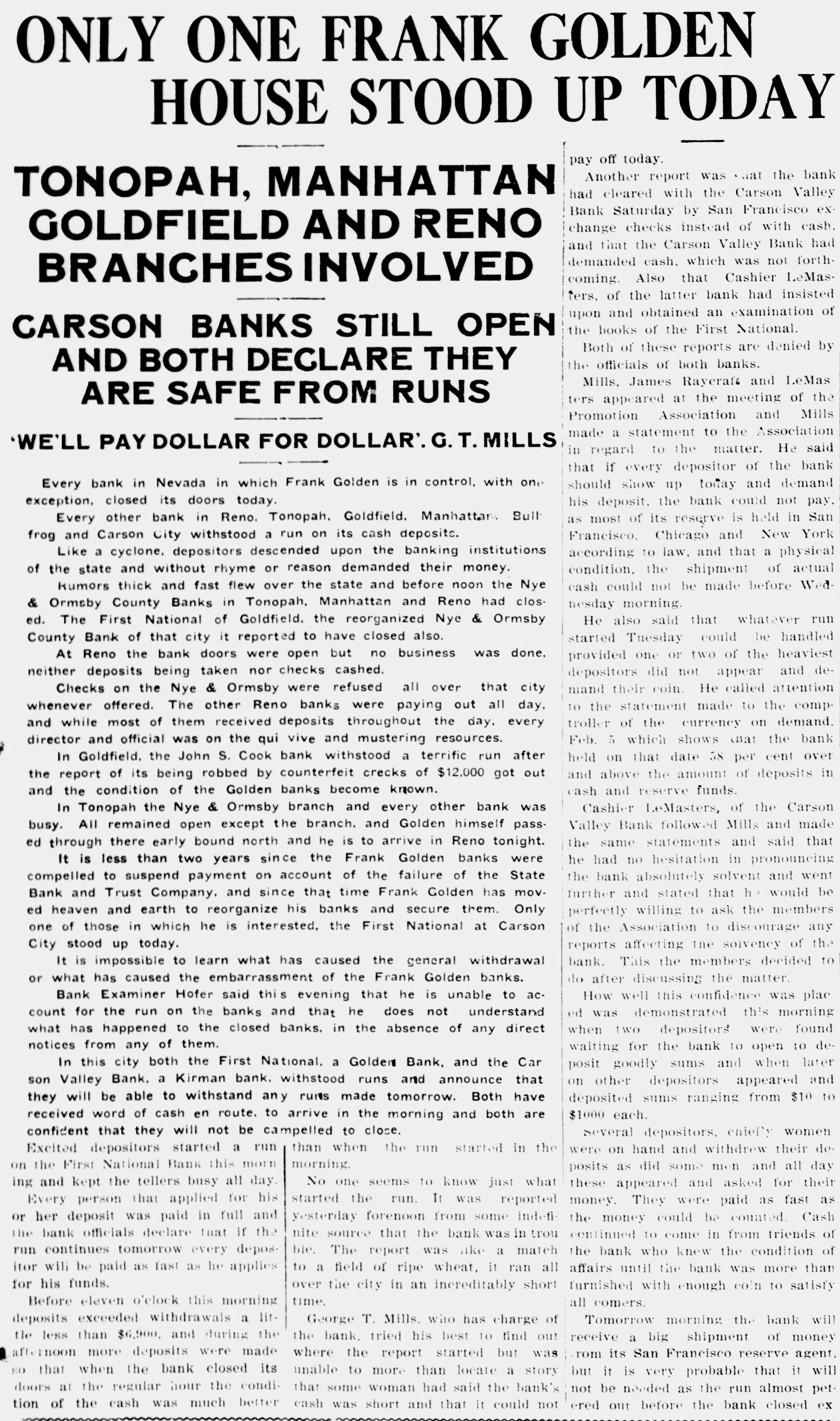 ONLY ONE FRANK GOLDEN HOUSE STOOD UP TODAY pay off today. Another report was that the bank had cleared with the Carson Valley TONOPAH, MANHATTAN Bank Saturday by San Francisco exchange checks instead of with cash. GOLDFIELD AND RENO and that the Carson Valley Bank had demanded cash, which was not forthBRANCHES INVOLVED coming. Also that Cashier LeMasters, of the latter bank had insisted upon and obtained an examination of the books of the First National. OPEN STILL BANKS CARSON Both of these reports are denied by the officials of both banks. AND BOTH DECLARE THEY Mills, James Rayeraft and LeMas ters appeared at the meeting of the ARE SAFE FROM RUNS Promotion Association and Mills made a statement to the Association 'WE'LL PAY DOLLAR FOR DOLLAR'. G. T. MILLS in regard to the matter. He said that if every depositor of the bank Every bank in Nevada in which Frank Golden is in control. with one should show up today and demand his deposit. the bank could not pay. exception, closed its doors today. Every other bank in Reno. Tonopah, Goldfield. Manhattan Bull as most of its reserve is held in San Francisco, Chicago and New York frog and Carson City withstood a run on its cash deposits. Like a cyclone. depositors descended upon the banking institutions according to law, and that a physical condition, the shipment of actual of the state and without rhyme or reason demanded their money. cash could not be made before WedRumors thick and fast flew over the state and before noon the Nye & Ormsby County Banks in Tonopah, Manhattan and Reno had closnesday morning. He also said that whatever run ed. The First National of Goldfield, the reorganized Nye & Ormsby started Tuesday could be handled County Bank of that city it reported to have closed also. At Reno the bank doors were open but no business was done. provided one or two of the heaviest neither deposits being taken nor checks cashed. depositors did not appear and demand their coin. He called attention Checks on the Nye & Ormsby were refused all over that city to the statement made to the compwhenever offered. The other Reno banks were paying out all day, troller of the currency on demand. and while most of them received deposits throughout the day, every Feb. 5 which shows that the bank director and official was on the qui vive and mustering resources. In Goldfield, the John S. Cook bank withstood a terrific run after held on that date 58 per cent over and above the amount of deposits in the report of its being robbed by counterfeit crecks of $12,000 got out cash and reserve funds. and the condition of the Golden banks become known. Cashier LeMasters, of the Carson In Tonopah the Nye & Ormsby branch and every other bank was Valley Bank followed Mills and made busy. All remained open except the branch. and Golden himself passthe same statements and said that ed through there early bound north and he is to arrive in Reno tonight. he had no hesitation in pronouncing It is less than two years since the Frank Golden banks were compelled to suspend payment on account of the failure of the State the bank absolutely solvent and went further and stated that he would be Bank and Trust Company, and since that time Frank Golden has mov. perfectly willing to ask the members ed heaven and earth to reorganize his banks and secure them. Only one of those in which he is interested, the First National at Carson of the Association to discourage any City stood up today. reports affecting the solvency of the bank. This the members decided to It is impossible to learn what has caused the general withdrawal or what has caused the embarrassment of the Frank Golden banks. do after discussing the matter. How well this confidence was plac Bank Examiner Hofer said this evening that he is unable to account for the run on the banks and that he does not understand ed was demonstrated this morning when two depositors were found what has happened to the closed banks. in the absence of any direct notices from any of them. waiting for the bank to open to deIn this city both the First National. a Golden Bank, and the Car posit goodly sums and when later son Valley Bank. a Kirman bank. withstood runs and announce that on other depositors appeared and they will be able to withstand any runs made tomorrow. Both have deposited sums ranging from $10 to $1000 each. received word of cash en route. to arrive in the morning and both are confident that they will not be campelled to close. Several depositors, cniefly women were on hand and withdrew their deExcited depositors started a run than when the run started in the on the First National Bank this morn morning. posits as did some men and all day ing and kept the tellers busy all day. No one seems to know just what these appeared and asked for their Every person that applied for his started the run. It was reported money. They were paid as fast as yesterday forenoon from some indefior her deposit was paid in full and the money could be counted. Cash the bank officials declare tnat if the nite source that the bank was in trou continued to come in from friends of run continues tomorrow every deposthe bank who knew the condition of ble. The report was like a match itor will be paid as fast as he applies affairs until the bank was more than to a field of ripe wheat, it ran all for his funds. over the city in an increditably short furnished with enough coin to satisfy time all comers. Before eleven o'clock this morning deposits exceeded withdrawals a litTomorrow morning the bank will George T. Mills. who has charge of tle less than $6,900. and during the the bank. tried his best to find out receive a big shipment of money afternoon more deposits were made where the report started but was from its San Francisco reserve agent. so that when the bank closed its but it is very probable that it will unable to more than locate a story doors at the regular hour the condithat some woman had said the bank's not be needed as the run almost petered out bef