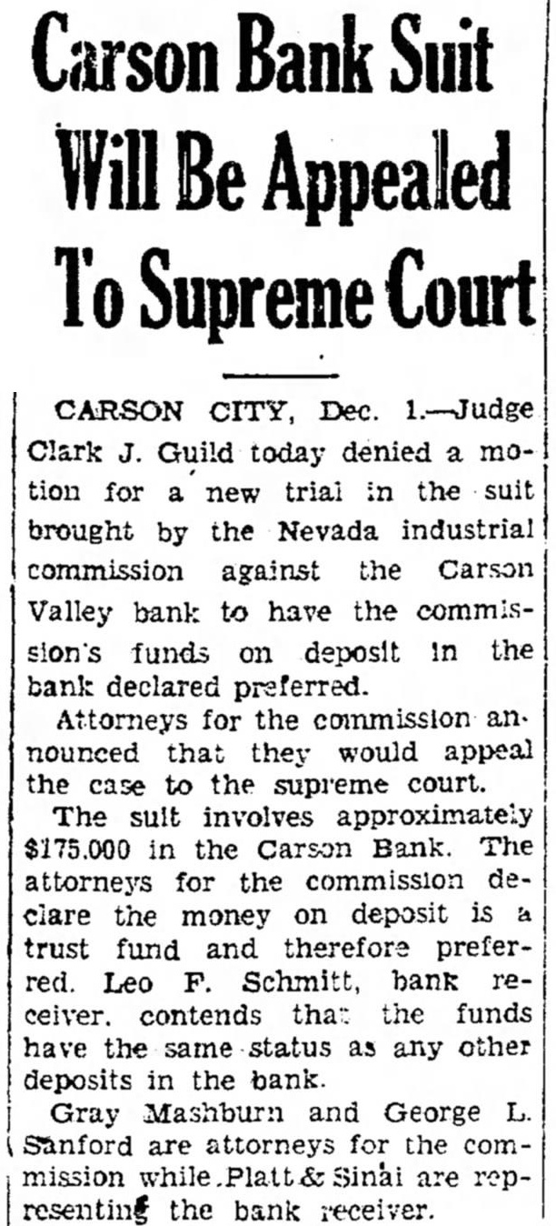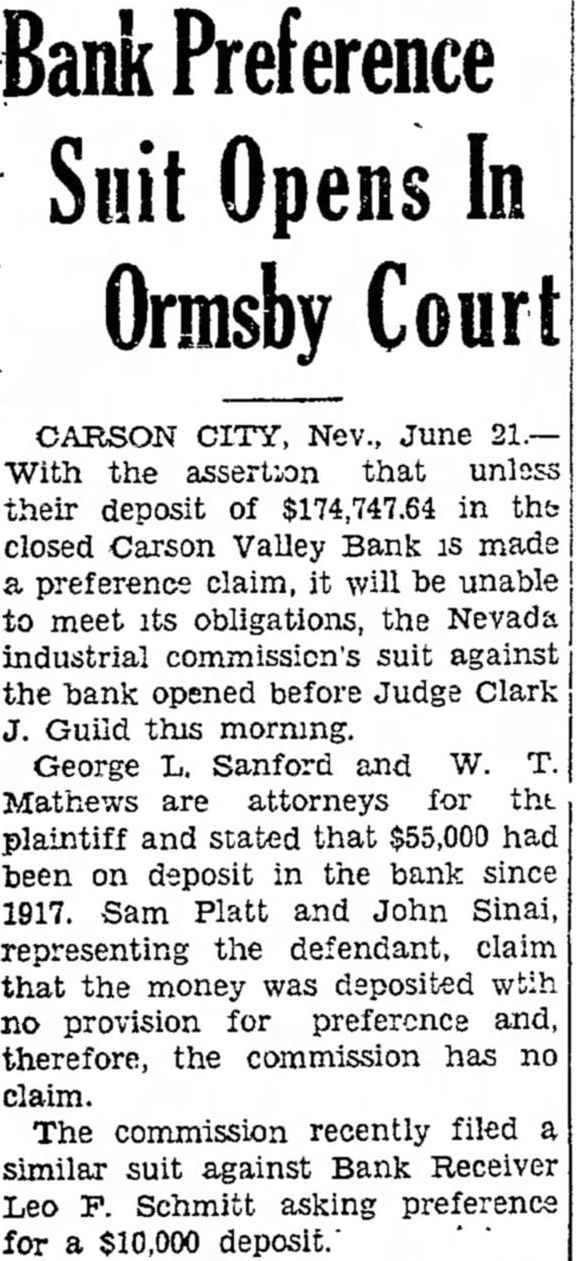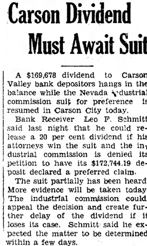 RENO, Nev., (UP)-Thirteen banks in Nevada are open for business, compared to 31 before the depression, a United Press survey showed. Of the banks open six are national banks, four state banks are operating without limitations and three under restrictions. Thirteen of the 18 closed institutions are in hands of receivers. 4 others have been reorganized into liquidatating companied and one, Bank of, Southern Nevada at Las Vegas, is in voluntary liquidation. Depositors of the closed Battle Mountain State Bank have petitioned for permission to reopen under restrictions. Hearing has been set for June 6 before Judge Edgar Eather at Austin. If the depositors' petition is granted the Batle Mountain institution will be opened for limited business similar to the Lander County Bank, Austin, the Mason Valley Bank at Yerington, and the Wells State Bank. Banks reopening for restricted business under the supervision of State Bank Superintendent E. J. Seaborn are required to freeze all old deposits for a four year period. New deposits must be held in cash, be, deposited with a Federal Reserve bank or invested in federal securities. Banks open for unrestricted business are: Ely National Bank and First National Bank, both at Ely; First National Bank, Lovelock; First National Bank, Elko; First National Bank, Reno: Ruth Bank, Ruth; First State Bank, Las Vegas; First National Bank, Eureka; Farmers Bank of Carson Valley, Minden, and the Bank of Pioche. Those under restrictions are: Lander County Bank, Austin; Wells State Bank, and the Mason Valley Bank. Closed Banks under Leo F. Schmitt as receiver are: Carson Valley Bank, Carson City; Bank of Nevada Savings and Trust, Riverside Bank, and United Nevada Bank, all of Reno; Bank of Sparks; Tonopah Banking Corporation, of Tonopah, and Virginia City Bank. Seaborn is in charge of the following closed institutions: Battle Mountain State Bank; Douglas County Farmers' Bank Gardnerville; The Quinn River Bank, McDermiat; Winnemucka State Bank and Trust Co. The Reno National Bank is in charge of Walter J. Tobin, national bank receiver. Receiver H. S. Streeter is in charge of the First National Bank of Winnemucca.