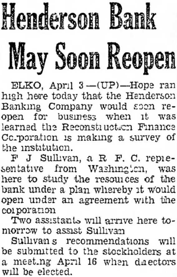 Henderson Bank May Soon Reopen ELKO, April -(UP)-Hope ran high here today that the Henderson Banking Company would soon reopen for business when it was learned the Reconstruction Finance Corporation IS making a survey of the institution. F J Sullivan, a R F. C. repiesentative from Washington, was here to study the resources of the bank under a plan whereby it would open under an agreement with the corporation Two assistants will arrive here tomorrow to assist Sullivan Sullivans recommendations will be submitted to the stockholders at a meet.ng April 16 when daectors will be elected.