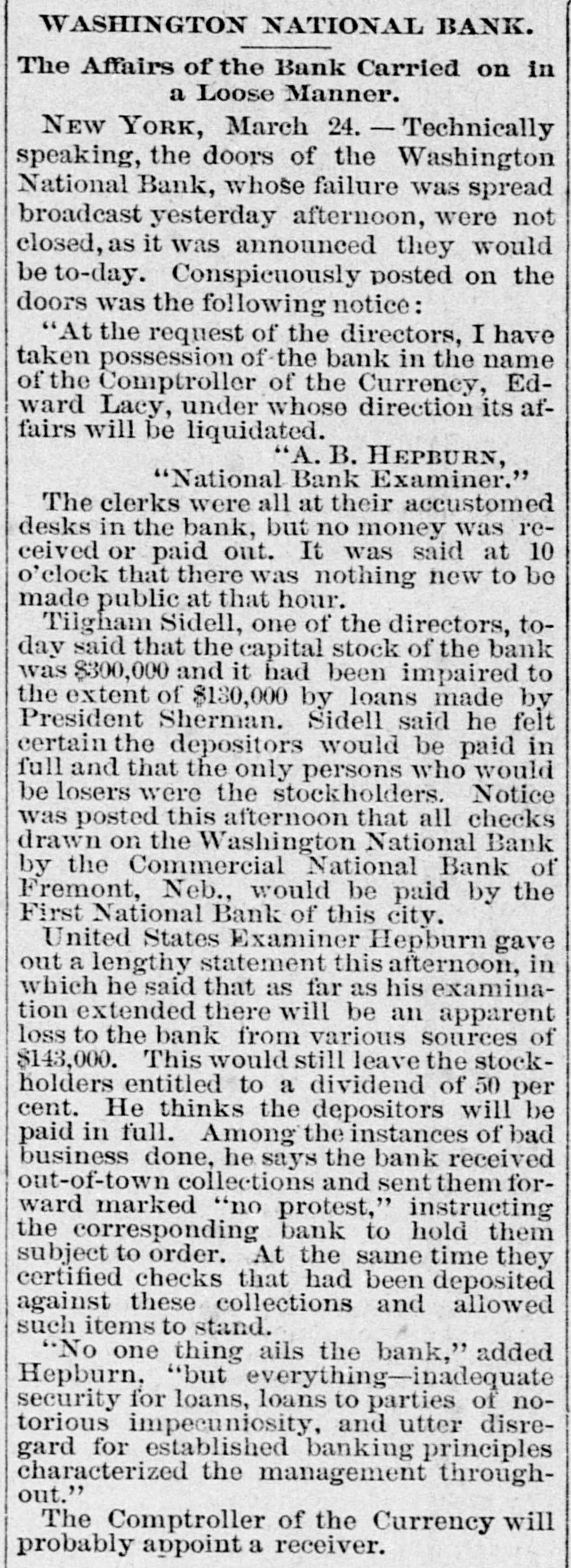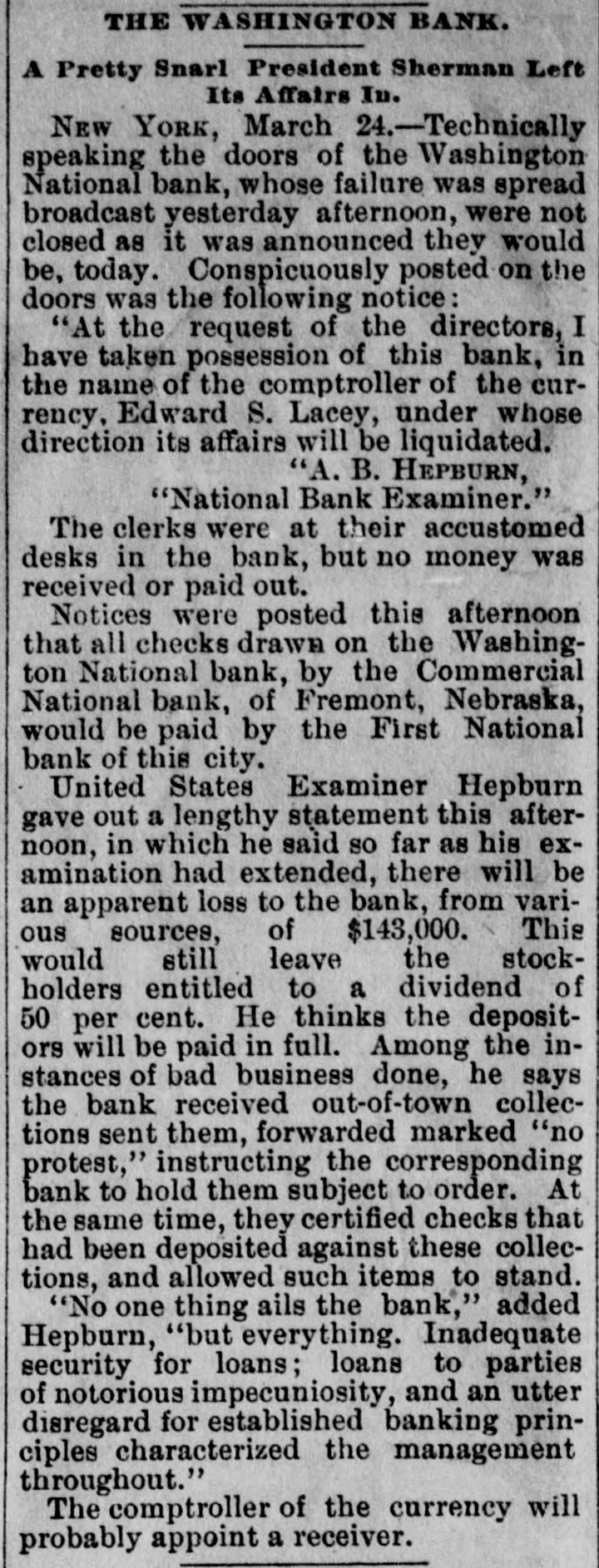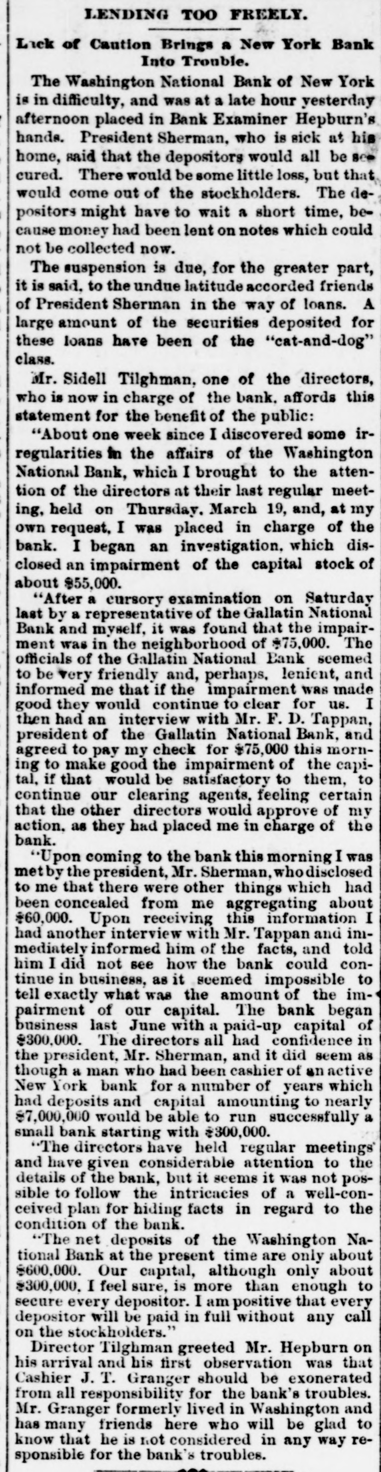MARCH, 20. Keystone National bank, Philadelphia, su> pended. Theodore Schwartz & Co., bankers, failed in Louisville; liabilities, $750,000. 23. Washington National bank suspended, New York: shortage, $148,000. MAY. 8. Spring Garden bank and the Penn Trust and Safe Deposit company suspended in Philadelphia. 12. Levy Bros. & Co., clothing manufacturers, failed in New York for nearly $1,000,000. 14. People's bank, of Knoxville, Tenn., failed. 20. Davis Shoe company, Richmond, assigned; liabilities, $3,000,000. 2. Star Rubber company, Trenton, failed for $500,000. 25. Potter, White & Bayley, shoe manufacturers, failed in Boston for $1,000,000. 27. Bunnel & Scranton, private bankers, failed in New Haven. JUNE. 4. Connell, Hall, McLester company, dry goods, assigned in Nashville; liabilities, $464,000. 12. London and Liverpool Clothing company and Mack & Co. failed in New York: liabilities over $250,000. 22. Sax Bros., bankers, failed for $600,000 in Nashville. 25. Emil Marqueze & Co., wholesale shoes, assigned in Boston; liabilities, $460,000. JULY. 19. R. M. Bingham & Co., wagon makers, failed in Rome, N. Y., for $225,000. 20. Merchants' National bank, of Fort Worth, Tex., suspended with $500,000 liabilities. AUGUST. 2. Abraham Backer, commission merchant and note broker, assigned in New York; liabilities, $4,000,000; Backer died of depression Dec. 9. 8. Masonic Savings bank, Louisville, assigned, owing $1,000,000. 19. American Wheel company, Chicago, with plants in six different states, went into roceiver's hands: liabilities. $1.800.000. 22. S. V. White & Co., grain speculators of New York and Chicago, failed for nearly $3,000,000. OCTOBER. 19. Jonathan Stewart, Trenton, assigned: liabilities, $329,000. 22. Bank of Lewisburg, Tenn., assigned. NOVEMBER. 1. Maverick National bank, of Boston, went into hands of comptroller: liabilities, $8,000,000. 7. National bank, of Corry, Pa., suspended; liabilities, $740,000. 10. C. B. Paul, lumber dealer, assigned in Louisville; liabilities, $200,000. 12. F. H. Smith & Co., ship brokers, assigned in New York; liabilities, $300,000. 15. Bonner & Bonner, bankers, failed in Tyler, Tex., for $500,000. 25. First National bank, Wilmington, N. C., failed. 27. Field, Lindley, Wiechers & Co., bankers and brokers, assigned in New York: liabilities, over $1,000,000. DECEMBER. 1. Richmond, Nicholasville and Beattyville railroad, of Kentucky, went into hands of receiver; $3,000,000 in debt. 11. Francis H. Baker & Co., dry goods, assigned in New York; liabilities, $250,000.