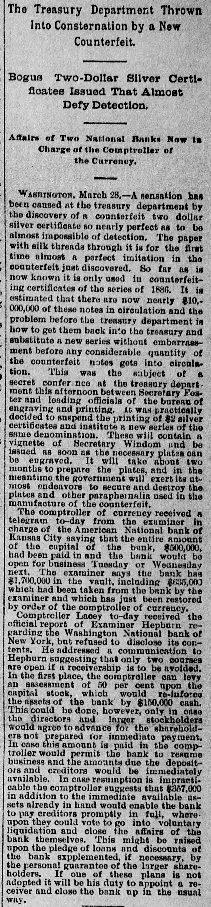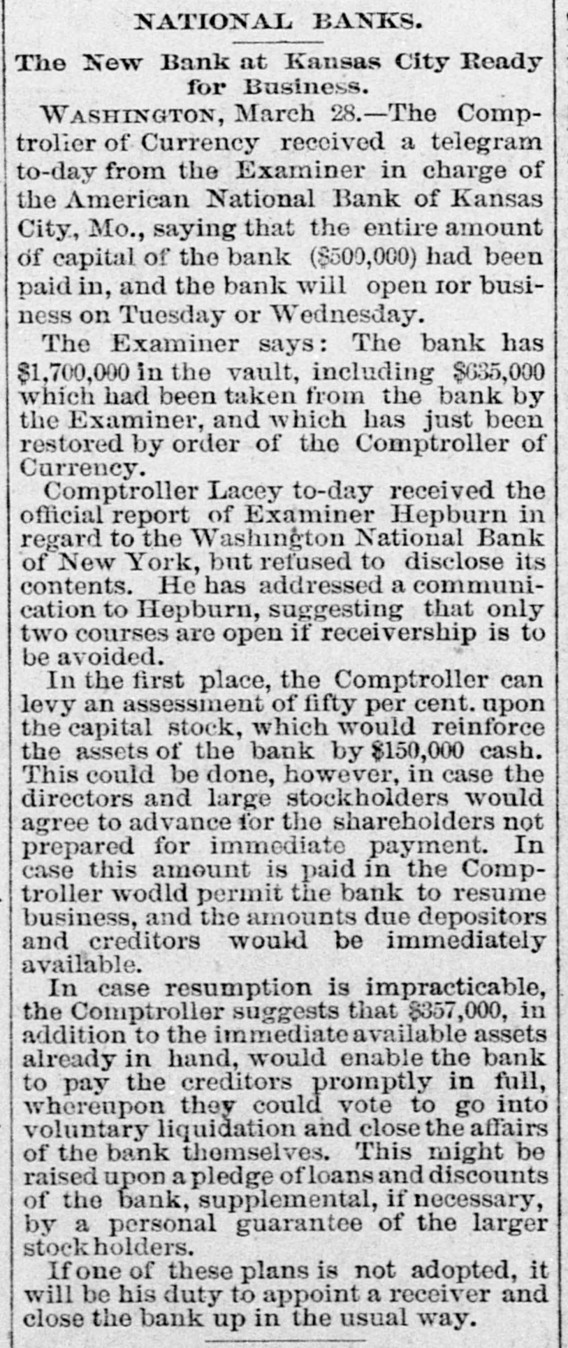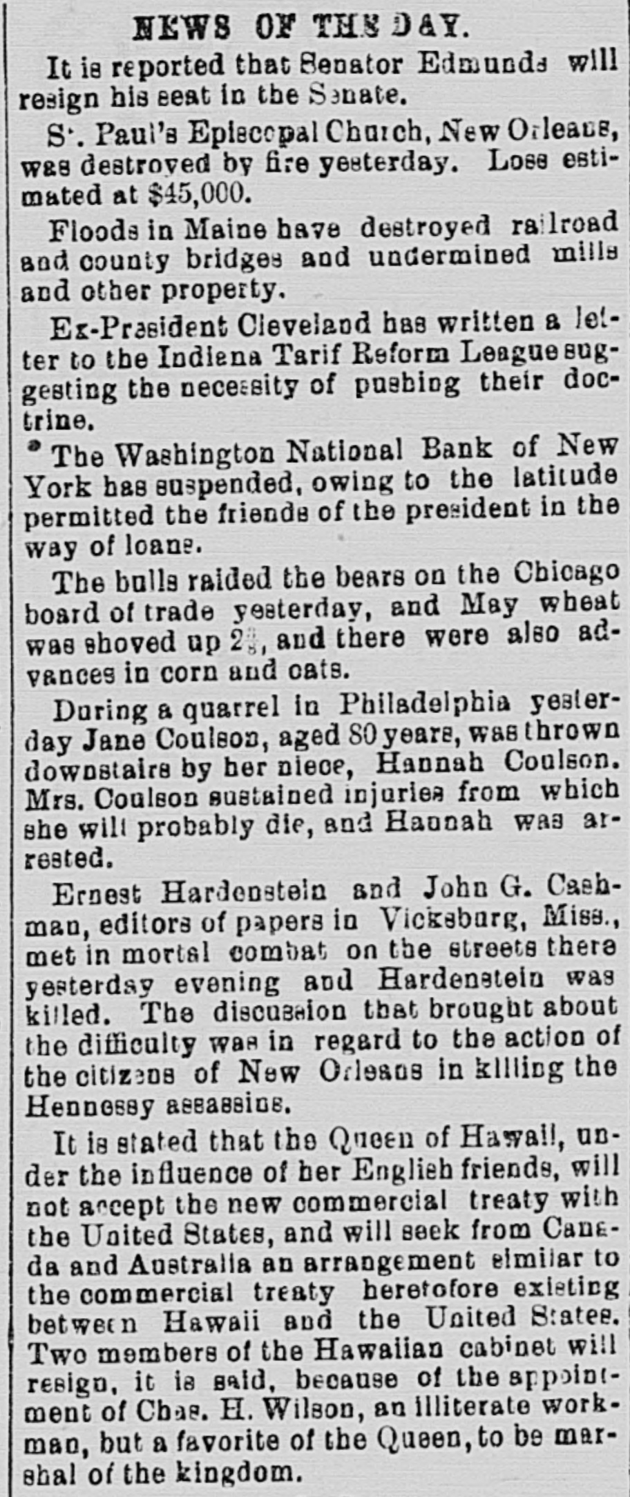 MARCH, 20. Keystone National bank, Philadelphia, su> pended. Theodore Schwartz & Co., bankers, failed in Louisville; liabilities, $750,000. 23. Washington National bank suspended, New York: shortage, $148,000. MAY. 8. Spring Garden bank and the Penn Trust and Safe Deposit company suspended in Philadelphia. 12. Levy Bros. & Co., clothing manufacturers, failed in New York for nearly $1,000,000. 14. People's bank, of Knoxville, Tenn., failed. 20. Davis Shoe company, Richmond, assigned; liabilities, $3,000,000. 2. Star Rubber company, Trenton, failed for $500,000. 25. Potter, White & Bayley, shoe manufacturers, failed in Boston for $1,000,000. 27. Bunnel & Scranton, private bankers, failed in New Haven. JUNE. 4. Connell, Hall, McLester company, dry goods, assigned in Nashville; liabilities, $464,000. 12. London and Liverpool Clothing company and Mack & Co. failed in New York: liabilities over $250,000. 22. Sax Bros., bankers, failed for $600,000 in Nashville. 25. Emil Marqueze & Co., wholesale shoes, assigned in Boston; liabilities, $460,000. JULY. 19. R. M. Bingham & Co., wagon makers, failed in Rome, N. Y., for $225,000. 20. Merchants' National bank, of Fort Worth, Tex., suspended with $500,000 liabilities. AUGUST. 2. Abraham Backer, commission merchant and note broker, assigned in New York; liabilities, $4,000,000; Backer died of depression Dec. 9. 8. Masonic Savings bank, Louisville, assigned, owing $1,000,000. 19. American Wheel company, Chicago, with plants in six different states, went into roceiver's hands: liabilities. $1.800.000. 22. S. V. White & Co., grain speculators of New York and Chicago, failed for nearly $3,000,000. OCTOBER. 19. Jonathan Stewart, Trenton, assigned: liabilities, $329,000. 22. Bank of Lewisburg, Tenn., assigned. NOVEMBER. 1. Maverick National bank, of Boston, went into hands of comptroller: liabilities, $8,000,000. 7. National bank, of Corry, Pa., suspended; liabilities, $740,000. 10. C. B. Paul, lumber dealer, assigned in Louisville; liabilities, $200,000. 12. F. H. Smith & Co., ship brokers, assigned in New York; liabilities, $300,000. 15. Bonner & Bonner, bankers, failed in Tyler, Tex., for $500,000. 25. First National bank, Wilmington, N. C., failed. 27. Field, Lindley, Wiechers & Co., bankers and brokers, assigned in New York: liabilities, over $1,000,000. DECEMBER. 1. Richmond, Nicholasville and Beattyville railroad, of Kentucky, went into hands of receiver; $3,000,000 in debt. 11. Francis H. Baker & Co., dry goods, assigned in New York; liabilities, $250,000.