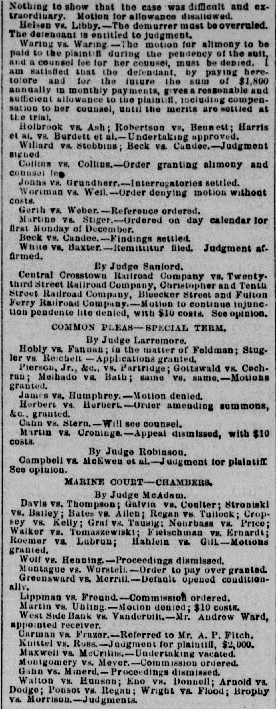 Nothing to show that the case was difficult and extraordinary. Motion for allowance disallowed. Helsen vs. Libby.-The demurrer must be overruled. The delenant is encitled to judgment. Waring vs. Waring. - motion for alimony to be paid to the plaintiff during the pendency of the suit, and a counsel fee for her counsei, must be depied. 1 am satisfied that the defendant, by paying here. tolore and for the future the sum of $1,800 annually in monthly payments, gives a reasonable and sufficient allowance to the plaintiff, including compensation to her counsel, until the merits are settled at the trial. Holbrook vs. Ash; Robertson vs. Bennett; Harris et ai. vs. Burdett et il.-Undertaking approved. Willard vs. Stebbins; Beck vs. Candee.-Judgment signed Collins VS. Collins.-Order granting alimony and counsel fee Johns vs. Grundherr.-Interrogatories settled. Wortman vs. Weil. -Order denying motion without costs. Gerth vs. Weber.-Reference ordered. Martine vs. Stiger.-Ordered on day calendar for first Monday of December. Beck vs. Candee.-Findings settled. White VS. Baxter.-Remitiitur I filed. Judgment af. firmed. By Judge Sanlord. Central Crosstown Railroad Company vs. Twenty. third Street Railroad Company, Christopher and Tentis Street Railroad Company, Bleecker Street and Fulton Ferry Railroad Company.-Motion to continue injunction pendente lite denied, with $10 costs. See opinion. COMMON PLEAS-SPECIAL TERM. By Judge Larremore. Hobly vs. Fanoan; in the matter of Foldman; Stugler vs. Reichelt - Applications granted. Pierson, Jr., &c., vs. Partridge; Gottswald vs. Cochran; Melhado vs. Bath; same vs. same.-Motions granted. James VS. Humphrey. - Motion denied. Herbert VS. Herbert. -Order amending summons, &c., granted. Cann vs. Stern.-Wi!l - see counsel. Martin vs. Croninge.-Appeal dismissed, with $10 costs. By Judge Robinson. Campbell vs. McEwen et ul.-Judgment for plaintiff See opinion. MARINE COURT -CHAMBERS By Judge McAdam. Davis vs. Thompson; Galvin vs. Coulter; Strontski vs. Balley; Bates VS. Allen; Regan VS. Tullock; Cropsey vs. Kelly; Graf vs. Tausig: Nearbass vs. Price; Walker vs. Tomaszewiski; Fielschman vs. Ernardt; Roemer vs. Lubrun; Hahlein vs. Gill-Motions granted. Wolf vs. Henning.-Proceedings dismissed. Montague vs. Worstell--Order to pay over granted. Greensward vs. Merrill-Detaule opened conditionally. Lippman vs. Freund--Commission ordered. Martin vs. Ubling.--Motion denied; $10 costs. West Side Bank vs. Vanderbill.-Mr. Andrew Ward, appointed receiver. Carman V8. Frazer.-Referred to Mr. A. P. Fitch. Knittel vs. Ross. -Judgment for plaintif, $2,000. Maxwell vs. MeCrillis.-Undertaking vacated. Montgomery vs. Mever.-Commission ordered. Gann vs.Minerd.-Proceedings dismissed. Walton vs. Hunson; Eno vs. Donnell; Arnold vs. Dodge; Ponsot vs. Regau; Wright vs. Flood; Brophy vs. Morrison.-Judgments.