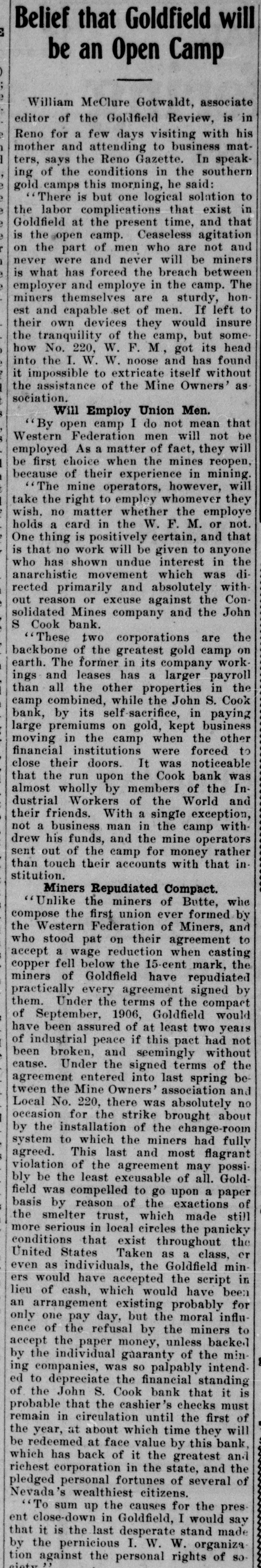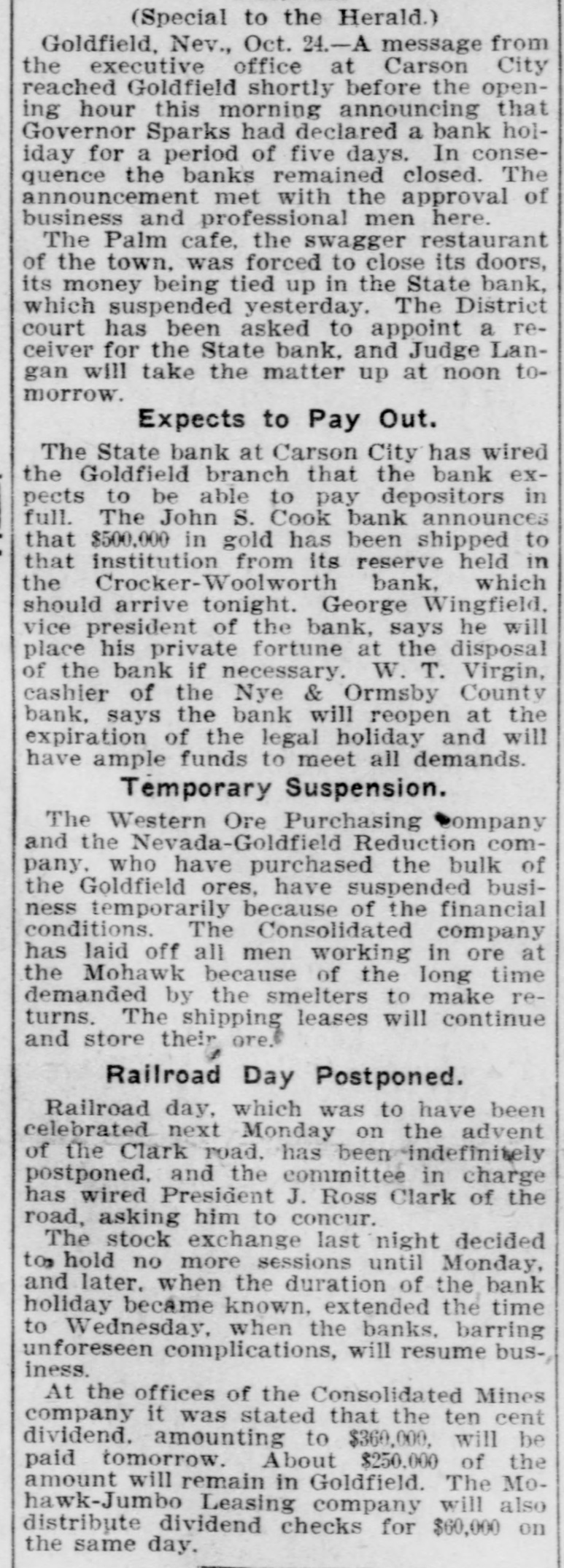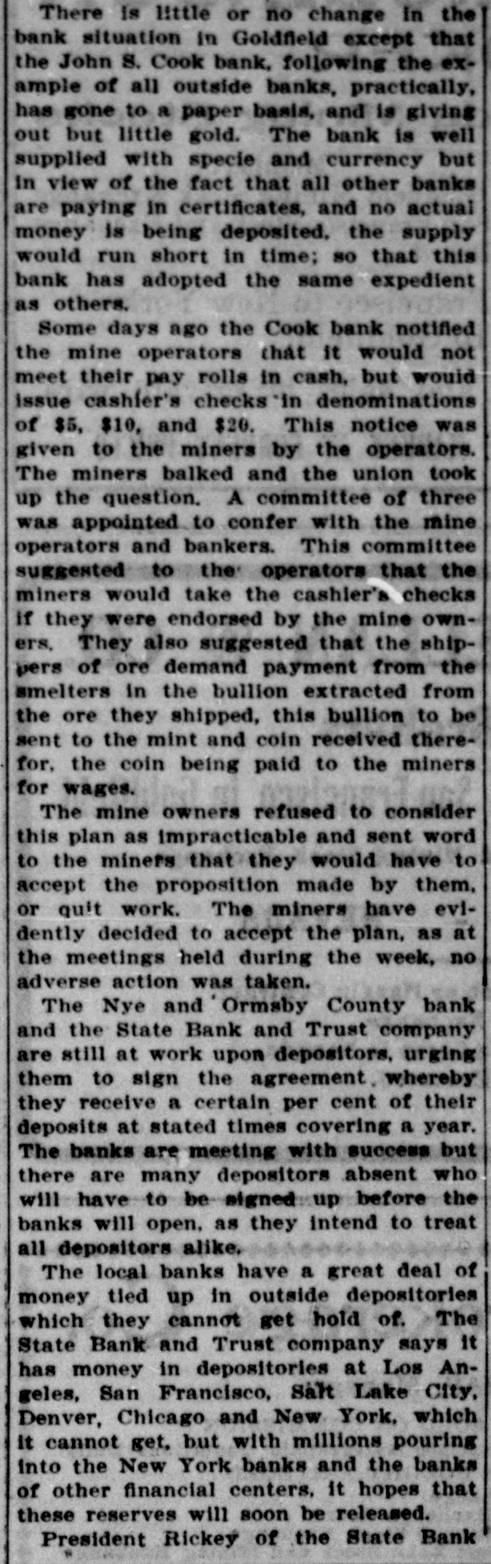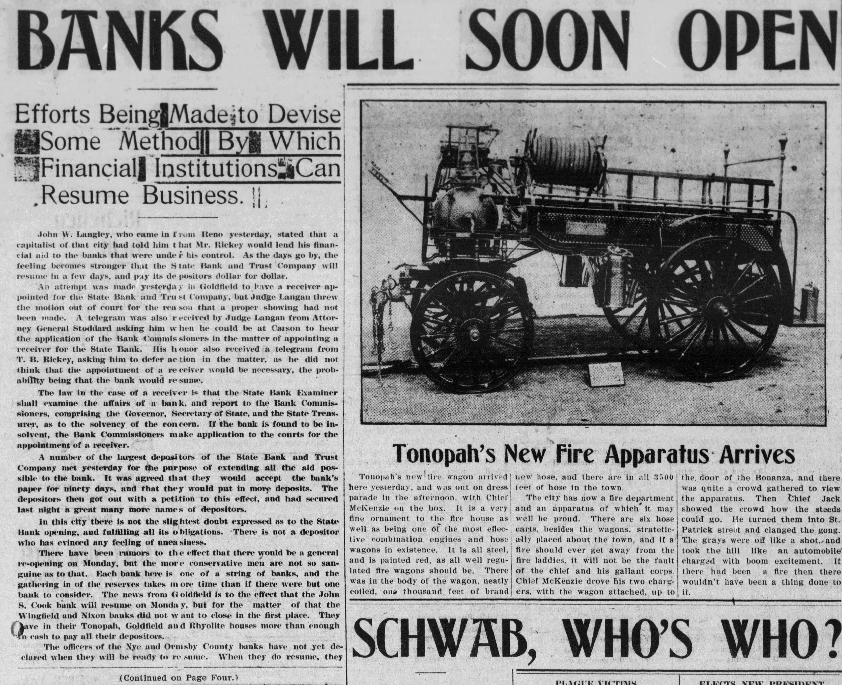SOON WILL OPEN BANKS Efforts Being Made jo Devise Which Some Method By Institutions Can Financial Resume Business. John W. Langley, who came in from Reno yesterday, stated that a capitalist of that city had told him t hat Mr. Rickey would lend his financial aid to the banks that were unde i his control. As the days go by, the feeling becomes stronger that the State Bank and Trust Company will resume in a few days, and pay its de positors dollar for dollar. An attempt was made yesterday in Goldfield to have a receiver appointed for the State Bank and Trust Company, but Judge Langan threw the motion out of court for the rea son that a proper showing had not been made. A telegram was also received by Judge Langan from Attorney General Stoddard asking him hen he could be at Carson to hear the application of the Bank Commis sioners in the matter of appointing a receiver for the State Bank. His honor also received a telegram from T. B. Rickey, asking him to defer ac tion in the matter, as he did not think that the appointment of a re ceiver would be necessary, the probability being that the bank would re sume. The law in the case of a receiver is that the State Bank Examiner shall examine the affairs of a bank and report to the Bank Commissioners, comprising the Governor, Secretary of State, and the State Treasurer, as to the solvency of the concern. If the bank is found to be insolvent, the Bank Commissioners make application to the courts for the appointment of a receiver. A number of the largest depositors of the State Bank and Trust Tonopah's New Fire Apparatus Arrives Company met yesterday for the purpose of extending all the aid posnew hose. and there are in all 3500 Tonopah's new fire wagon arrived the door of the Bonanza, and there sible to the bank. It was agreed that they would accept the bank's feet of hose in the town. here yesterday, and was out on dress was quite a crowd gathered to view paper for ninety days, and that they would put in more deposits. The parade in the afternoon, with Chief The city has now a fire department the apparatus. Then Chief Jack depositors then got out with a petition to this effect, and had secured McKenzie on the box. It is a very showed the crowd how the steeds and an apparatus of which it may last night a great many more names of depositors. fine ornament to the fire house as well be proud. There are six hose could go. He turned them into St. In this city there is not the htest doubt expressed as to the State well as being one of the most efleccarts, besides the wagons, strateticPatrick street and clanged the gong. Bank opening, and fulfilling all its obligations. There is not a depositor tive combination engines and hose ally placed about the town. and if a The grays were off like a shot. and who has evinced any feeling of unea siness. took the hill like an automobile wagons in existence. It is all steel, fire should ever get away from the There have been rumors to the effect that there would be a general fire laddies, it will not be the fault and is painted red. as all well regucharged with boom excitement. If re-opening on Monday, but the more conservative men are not so santhere had been a fire then there lated fire wagons should be. There of the chief and his gallant corps. guine as to that. Each bank here is one of a string of banks, and the Chief McKenzie drove his two chargwas in the body of the wagon, neatly wouldn't have been a thing done to gathering in of the reserves takes ore time than if there were but one it. coiled. one thousand feet of brand ers. with the wagon attached, up to bank to consider. The news from oldfield is to the effect that the John S. Cook bank will resume on Monday but for the matter of that the Wingfield and Nixon banks did not want to close in the first place. They ave in their Tonopah, Goldfield and Rhyolite houses more than enough n cash to pay all their depositors. The officers of the Nye and Ormsby County banks have not yet declared when they will be ready to re same. When they do resume, they SCHWAB, WHO'S WHO? (Continued on Page Four.) ELECTS DRISIDETTY PLAGUE