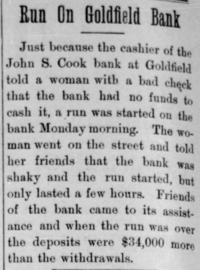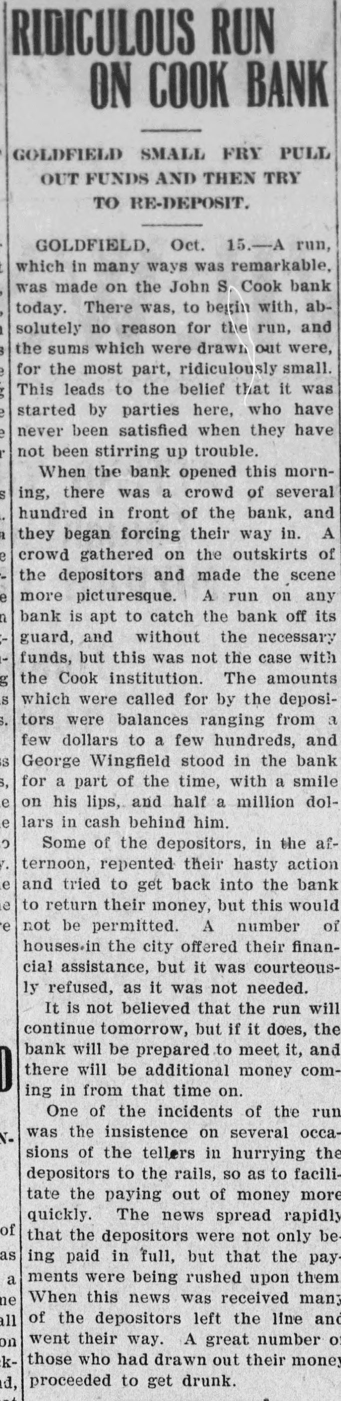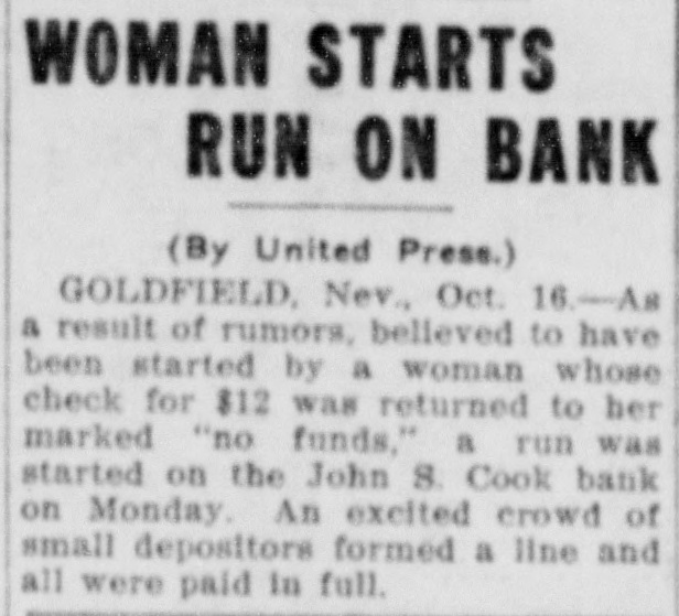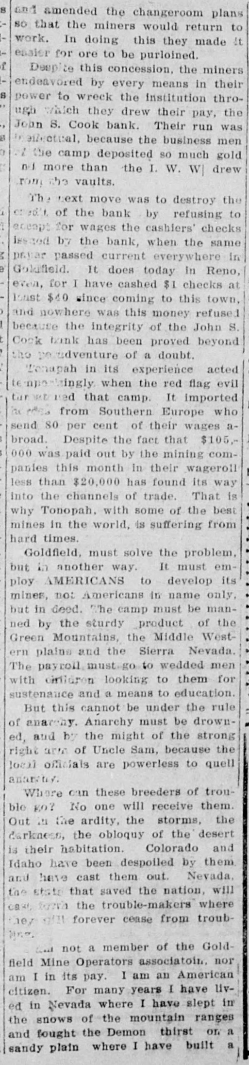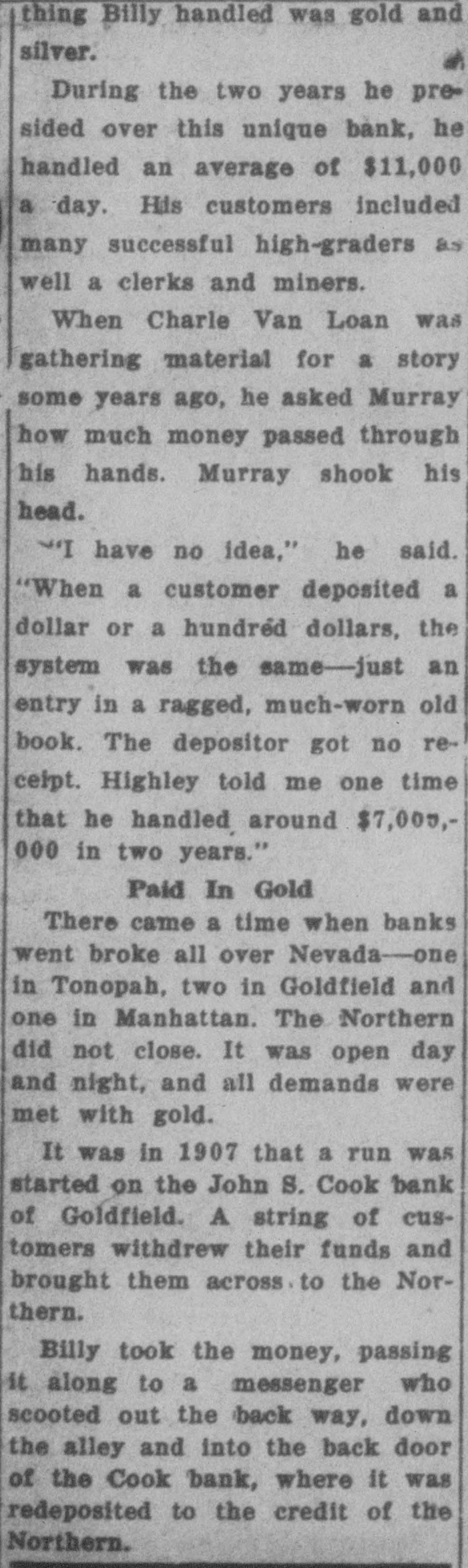 SOON WILL OPEN BANKS Efforts Being Made jo Devise Which Some Method By Institutions Can Financial Resume Business. John W. Langley, who came in from Reno yesterday, stated that a capitalist of that city had told him t hat Mr. Rickey would lend his financial aid to the banks that were unde i his control. As the days go by, the feeling becomes stronger that the State Bank and Trust Company will resume in a few days, and pay its de positors dollar for dollar. An attempt was made yesterday in Goldfield to have a receiver appointed for the State Bank and Trust Company, but Judge Langan threw the motion out of court for the rea son that a proper showing had not been made. A telegram was also received by Judge Langan from Attorney General Stoddard asking him hen he could be at Carson to hear the application of the Bank Commis sioners in the matter of appointing a receiver for the State Bank. His honor also received a telegram from T. B. Rickey, asking him to defer ac tion in the matter, as he did not think that the appointment of a re ceiver would be necessary, the probability being that the bank would re sume. The law in the case of a receiver is that the State Bank Examiner shall examine the affairs of a bank and report to the Bank Commissioners, comprising the Governor, Secretary of State, and the State Treasurer, as to the solvency of the concern. If the bank is found to be insolvent, the Bank Commissioners make application to the courts for the appointment of a receiver. A number of the largest depositors of the State Bank and Trust Tonopah's New Fire Apparatus Arrives Company met yesterday for the purpose of extending all the aid posnew hose. and there are in all 3500 Tonopah's new fire wagon arrived the door of the Bonanza, and there sible to the bank. It was agreed that they would accept the bank's feet of hose in the town. here yesterday, and was out on dress was quite a crowd gathered to view paper for ninety days, and that they would put in more deposits. The parade in the afternoon, with Chief The city has now a fire department the apparatus. Then Chief Jack depositors then got out with a petition to this effect, and had secured McKenzie on the box. It is a very showed the crowd how the steeds and an apparatus of which it may last night a great many more names of depositors. fine ornament to the fire house as well be proud. There are six hose could go. He turned them into St. In this city there is not the htest doubt expressed as to the State well as being one of the most efleccarts, besides the wagons, strateticPatrick street and clanged the gong. Bank opening, and fulfilling all its obligations. There is not a depositor tive combination engines and hose ally placed about the town. and if a The grays were off like a shot. and who has evinced any feeling of unea siness. took the hill like an automobile wagons in existence. It is all steel, fire should ever get away from the There have been rumors to the effect that there would be a general fire laddies, it will not be the fault and is painted red. as all well regucharged with boom excitement. If re-opening on Monday, but the more conservative men are not so santhere had been a fire then there lated fire wagons should be. There of the chief and his gallant corps. guine as to that. Each bank here is one of a string of banks, and the Chief McKenzie drove his two chargwas in the body of the wagon, neatly wouldn't have been a thing done to gathering in of the reserves takes ore time than if there were but one it. coiled. one thousand feet of brand ers. with the wagon attached, up to bank to consider. The news from oldfield is to the effect that the John S. Cook bank will resume on Monday but for the matter of that the Wingfield and Nixon banks did not want to close in the first place. They ave in their Tonopah, Goldfield and Rhyolite houses more than enough n cash to pay all their depositors. The officers of the Nye and Ormsby County banks have not yet declared when they will be ready to re same. When they do resume, they SCHWAB, WHO'S WHO? (Continued on Page Four.) ELECTS DRISIDETTY PLAGUE
