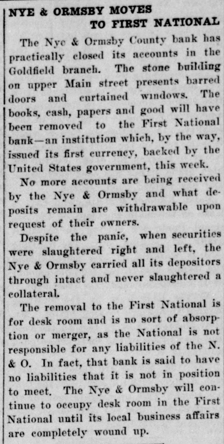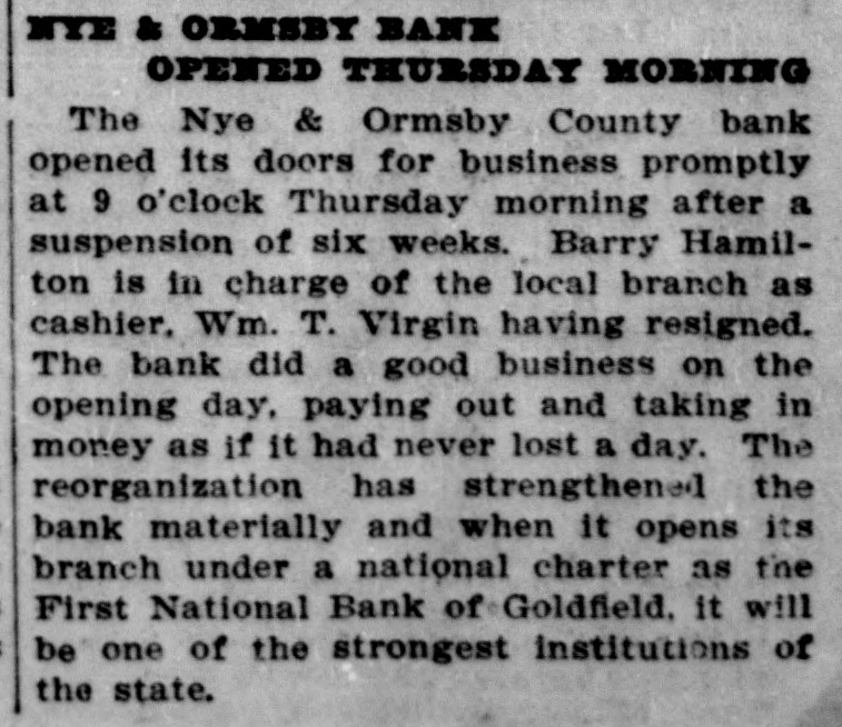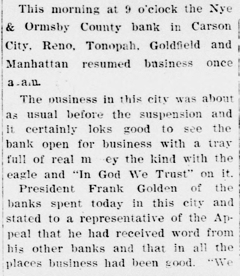 BEING PROBED I Judge Frank P. Langan Presides, Attorneys Wrangle, Spectators Look on and Listen, the Official Reporter Takes Down The Testimony and Still the Battle Wages Proceedings under the citation isAsked to detail these entries, HoffV sued to the First National Bank diman said that one was of -4621.57 and rectors in the receivership matter of o the other for $1086.22 a total of $5.707.79. the Nye & Ormsby County Bank, starta ed with Hoffman, of the First NationBoyd asked where were the credits S al. flanked with a pile of books and to balance these, and Hoffman stated f records on the stand. they are on the books of the banks c He detailed the items of the three at Tonopah and Goldfieid. t Boyd: Why are they not here? credits made on the 26th of February O Ans: Because that account carried 1909. on the First National books, ree dueing the Nye & Ormsby indebtedthe business of the N. & O, bank with in the First National Bank. ness to practically nothing. Attorney o Hoffman further testified that these Boyd. for the receiver. proceeded to ti attempt to unravel other entries in entries were made because the Goldan effort to show the exact amount en account was closed out on June 30, M 1908. but went on to say that the balof interest the N. & O. Bank owns in g ance in the account was $5707.79 on he First National of Carson City o February 26. 1909. Hoffman was asked about the state ei Boyd: Who wrote "B.K." over this of the books on Feb 23. 1909. when a item in red ink? the N. & O. bank appeared by the fa Hoffman: did. First National books to owe the First ra Q. What account preceds this? National $19,759.91 On Feb. 26 this to Ans: The item of $5707.79 amount was wiped out by the three ra Q: What follows this B. K. notacredits mentioned On March 6th the C tion? N. & O. bank again owed the First a National an item of $2822.37 Ans: A deposit of $5,000. and a top tal of $10,707.79 both deposits. The Boyd tried for an hour to get out tu next item is a check for $10,000 of Hoffman the items of this amoun ra leaving a balance of $707.79 but Hoffman testified that the checks Q: Who told you to make these that made it up are in the possessge entries? ion of the receiver of the N. & O. th Ans: No one. Bank. which Hoffman denied la Q. How do you explain this notaAttorney Boyd then called attention fu tion of B. K.? to the Frank Golden account on the of Ans: It represents bank stock. C N. & O. books. The court asked. for Q. This item of $5707.79 represents the purpos a what? an ney Chartz. who had not made a sinAns: Bank stock of the First NaM de objection during the inquiry, ex tional bank. 111 1⑆: ask the witness to go slower Q: Does this account show the vost ev payment by th e.N. & O. bank for the and told the court that up to this stock fu time he had made no objections. 28 Ans: Yes, it is carried in the Goldtie owspapers had made it appear en personal account ha Q. What notes are represented in ci which he had no intention of doi his account of which you spoke? no ,Boyd asked for the details of the Ans: Hofer detailed them yestertrasactions of the 24th of February, day. after Hoffman stated that he believed Q: Who instructed you to reconthe closing of the N. & O. Bank on ile this account? Feb. 23 was illegal. Hoffman had to The witness started to answer but M go to the bank and get his individual 'hartz interrupted and cautioned him ledger and with this book he detailed O go slowly as the answer was imthe transactions of that date. none of portant. Hoffman answered: No. one which included any N. & O. business. ! talked to Goiden about it and he It was at this juncture that the said that Marshall had done the accourt asked the object of the inquiry. H counting and had handled this acBoyd stated that he would trace a ount in this way. but that he didn't cash deposit by the process of eiiminknow whether Marshall had done anyation which made up the amount of thing with the account or not. It the $2822.37 believed to be the counwas morely a continuation of the First ty money deposited on that date by National Bank business County Treasurer Patterson. Hoffpr At this point court took a recess. man asked Boyd if he wanted the lot Ra Chartz nor Golden were at all bothand buildings account: but Boyd dew ered apparently at the progress made clined to hear this and stated to the gi and Boyd expressed himself as satiscourt that by the process of eliminAJ fied and will show juggling of acation he would find this account. counts that will show the interest of Then be took a new tack. asked the N. & O. bank in the First Nationpr Hoffman how long he had worked for al by Hoffman alone. bu he First National, for the receiver of Boyd began at once on Hoffman's br the N. & O. bank and for the N. & of examination at the afternoon recess. O bank itself. Hoffman replied that the seeking by all the methods he could be was in the Goldfield branch for find to get Hoffman to detail where bu three years. in Receiver Halls employ the First National Bank charges the Th from June until about August and in ba N. & O. bank for the First National the First National since about the stock the latter is supposed to own, an middle of August but could not succeed. The items of qu Boyd What were you doing with the Frank Golden account were gone op Receiver Hall's books? over again and again and while Hoffhid Hoffman: Reconciling them. ca man was perfectly able to explain the Boyd: You made entries in the item of $5707.79 he could not find that books? of the $5000 deposit appearing in the Go Hoffman: Yes Golden account. ho Boyd: Who told you to make en It seemed from Hoffman's testimony qu tries in the books? that the Nye & Ormsby agreed to wi Hoffman My common reason. take stock in the First National Bank ha Boyd: Did Hall know of these en up to any amount remaining due the tries? mi Nye & Ormsby County Bank after the an Hoffman: Yes, dissolution of its business through be Boyd: Did you tell Hall of any enthe First National Bank.