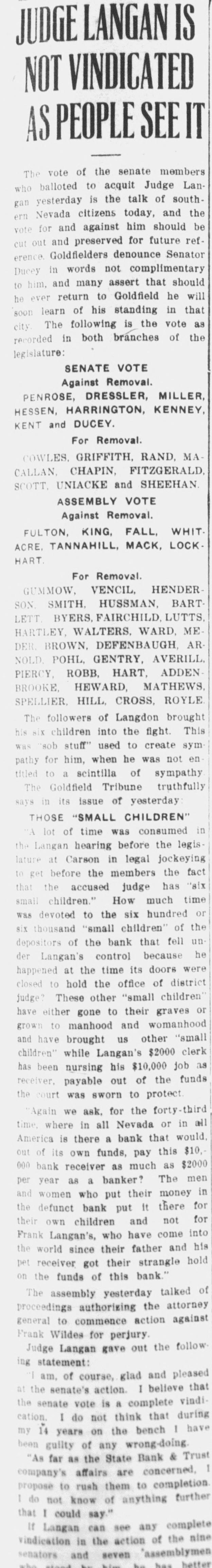 JUDGE LANGAN IS NOT VINDICATED AS PEOPLE SEE IT vote of the senate members LanThe to acquit Judge who yesterday balloted is the talk of and south- the gan citizens today, be and against him vote for and preserved for Goldfielders ern cut out Nevada denounce future should Senator reference. words not complimentary should Ducey in many assert that will to him. and return to Goldfield he he ever of his standing vote The following is of soon learn the in that the as recorded city in both branches legislature: SENATE VOTE Against Removal. MILLER, HESSEN, PENROSE, HARRINGTON, DRESSLER, KENNEY, KENT and DUCEY. For Removal. GRIFFITH, RAND, MA CALLAN COWLES. CHAPIN, FITZGERALD. SHEEHAN SCOTT. UNIACKE and ASSEMBLY VOTE Against Removal. FULTON, KING, FALL, LOCK WHIT. ACRE, TANNAHILL, MACK, HART. For Removal. HENDERGUMMOW, VENCIL, HUSSMAN, BARTSON LETT SMITH. BYERS, WALTERS, FAIRCHILD. WARD, LUTTS. ME- ARHARTLEY, BROWN. DEFENBAUGH AVERILL. DER. POHL, GENTRY, ADDEN NOLD. ROBB, HART, MATHEWS. PIERCY, HEWARD, ROYLE SPELLIER. BROOKE HILL CROSS. followers of Langdon brought This The children into the create fight. symhis six sob stuff" used to not en was pathy for him, when he of was sympathy a scintilla truthfully titled to Goldfield Tribune says The in its issue of yesterday in THOSE "SMALL CHILDREN" consumed lot of time was the legis"A Langan hearing before jockeying the at Carson in legal the lature to get before the members judge has "aix fact the accused time that children." HOW much hundred or small devoted to the six of the was "small children" fell six of the bank control depositors thousand Langan's that because doors were un- he happened der at the time its of district to hold the office children" judge? closed These other "small their graves or have either gone to and womanhood to manhood other "small grown have brought us $2000 clerk and children" while Langan's job as been nursing his $10,000 the funds has payable out of protect receiver. the court was sworn to Again we ask. for the forty-third or in all where in all Nevada that would, America time, is there a bank this $10. its own funds, pay as $2000 out of bank receiver as much The men 000 year as a banker? money in per women who put their there for and the defunct bank put it not for own children and come into their Frank Langan's, who have father and his the world since got their their strangle hold receiver bank." pet on the funds of this of The assembly yesterday the talked attorney proceedings general to commence authorizing action against Wildes for perjury. follow Frank Judge Langan gave out the of course, glad and that I am, action. I ing statement: senate's complete believe pleased vindiat the vote is a during the senate I do not think bench that 1 have cation. 14 years on the wrong-doing. been my guilty of any Bank & Trust 1 as the State concerned. "As far affairs are completion company's to rush them to further propose 1 do not know of " anything that If Langan I could can say." see any of complete the nine vindication in the action assemblyment senators and seven be has better