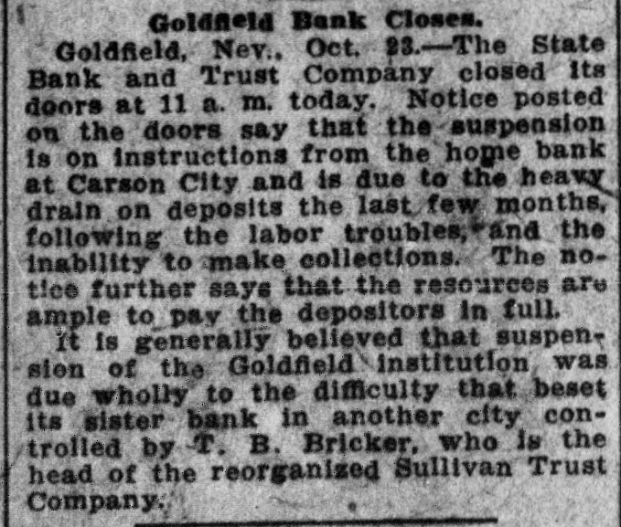 Goldneld Bank Closes. Goldfield, Nev.. Oct. 23.-The State Bank and Trust Company closed its doors at 11 a. m. today. Notice posted on the doors say that the suspension is on instructions from the home bank at Carson City and is due to the heavy drain on deposits the last few months, following the labor troubles, and the inability to make collections. The notice further saye that the resources are ample to pay the depositors In full. it is generally believed that suspension of the Goldfield institution was due wholly to the difficulty that beset its sister bank in another city controlled by T. B. Bricker, who is the head of the reorganized Sullivan Trust Company.